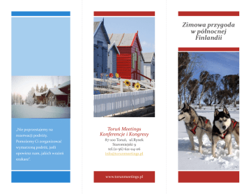 Zimowa przygoda w północnej Finlandii „Nie poprzestajemy na rezerwacji podróży. Pomożemy Ci zorganizować wymarzoną podróż, jeśli opowiesz nam, jakich wrażeń Toruń Meetings Konferencje i Kongresy 87-100 Toruń, ul.Rynek Staromiejski 9 tel.(0-56) 621-04-06 [email protected] szukasz”. www.torunmeetings.pl Program wydarzenia Oferta • safari śnieżne z psami pociągowymi i ogniskiem, • safari śnieżne na skuterach śnieżnych z ogniskiem, • łowienie ryb w przerębli, • wizyta w farmie reniferów, O nas TORUŃ MEETINGS Konferencje i Kongresy jest prężnie rozwijającym się biurem konferencyjnym działającym zarówno na rynku krajowym jak i zagranicznym. Doświadczenie zdobyte podczas organizacji turystyki aktywnej oraz turystyki biznesowej, owocuje przygotowaniem profesjonalnych pakietów konferencyjnych i kongresowych z ciekawą ofertą nie tylko biznesową, ale również kulturalno - rozrywkową. • wycieczka w rakietach śnieżnych do igloo • targi owoców morza Grupa: min. 24 osoby , Termin: do uzgodnienia, 5 noclegów/ 6 dni, Transport: samolot Warszawa – Helsinki - Kuusamo – Helsinki – Warszawa Zakwaterowanie: w typowych domkach fińskich, wykonanych całkowicie z drewna, apartamenty 2 - osobowe. Wyżywienie : 2 posiłki dziennie, Transfer: lotnisko – ośrodek ACTIV WINTER - lotnisko Cena : 896 Euro + 22% VAT-u, Poza ceną : transport lotniczy