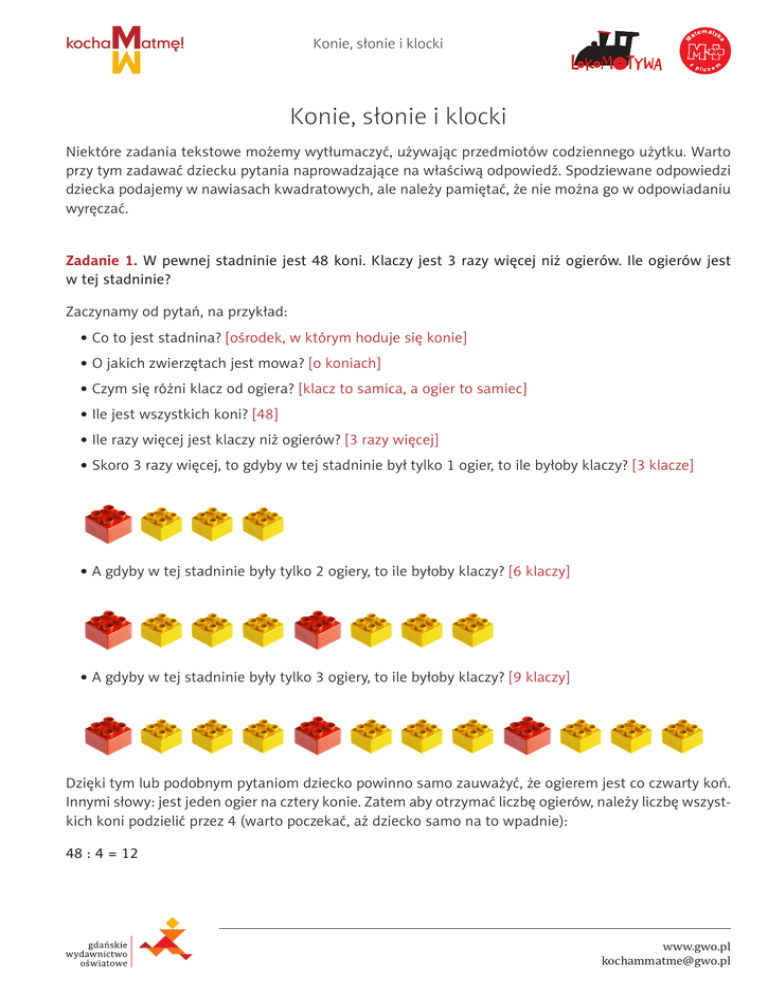 kocha atmę! Konie, słonie i klocki Konie, słonie i klocki Niektóre zadania tekstowe możemy wytłumaczyć, używając przedmiotów codziennego użytku. Warto przy tym zadawać dziecku pytania naprowadzające na właściwą odpowiedź. Spodziewane odpowiedzi dziecka podajemy w nawiasach kwadratowych, ale należy pamiętać, że nie można go w odpowiadaniu wyręczać. Zadanie 1. W pewnej stadninie jest 48 koni. Klaczy jest 3 razy więcej niż ogierów. Ile ogierów jest w tej stadninie? Zaczynamy od pytań, na przykład: • Co to jest stadnina? [ośrodek, w którym hoduje się konie] • O jakich zwierzętach jest mowa? [o koniach] • Czym się różni klacz od ogiera? [klacz to samica, a ogier to samiec] • Ile jest wszystkich koni? [48] • Ile razy więcej jest klaczy niż ogierów? [3 razy więcej] • Skoro 3 razy więcej, to gdyby w tej stadninie był tylko 1 ogier, to ile byłoby klaczy? [3 klacze] • A gdyby w tej stadninie były tylko 2 ogiery, to ile byłoby klaczy? [6 klaczy] • A gdyby w tej stadninie były tylko 3 ogiery, to ile byłoby klaczy? [9 klaczy] Dzięki tym lub podobnym pytaniom dziecko powinno samo zauważyć, że ogierem jest co czwarty koń. Innymi słowy: jest jeden ogier na cztery konie. Zatem aby otrzymać liczbę ogierów, należy liczbę wszystkich koni podzielić przez 4 (warto poczekać, aż dziecko samo na to wpadnie): 48 : 4 = 12 www.gwo.pl [email protected] Konie, słonie i klocki kocha atmę! Obliczenie, ile jest klaczy, może nastąpić na dwa sposoby: 12 · 3 = 36 lub 48 – 12 = 36 Jeśli uznają Państwo, że powyższe tłumaczenie nie trafi do Państwa dziecka, to można spróbować innego. Praktyka pokazuje, że większość dzieci lepiej rozumie treść zadań, jeśli odnosi się ona do czegoś, z czym spotykają się na co dzień. Nowe, nieznane zagadnienia (stadnina, ogier, klacz) pochłaniają zbyt wiele uwagi i mogą sprawiać wrażenie, że poziom zadania jest wyższy niż w istocie. Warto zatem zaproponować dziecku zabawę polegającą na odczytywaniu treści tego zadania ze zmienionymi niektórymi wyrazami. Rodzic podaje pierwszy przykład: W pewnej rodzinie jest 48 krewnych. Ciotek jest 3 razy więcej niż wujków. Ilu wujków jest w tej rodzinie? Teraz przychodzi pora na dziecko. Najlepiej, jakby wymyśliło zamienniki samo, ale jeśli początkowo nic mu nie przyjdzie do głowy, to można coś zasugerować: • stadnina – podwórko/klasa, ogiery – chłopcy, klacze – dziewczynki • stadnina – torebka cukierków, ogiery – cukierki czekoladowe, klacze – cukierki owocowe • stadnina – zabawki, ogiery – misie, klacze – lalki • stadnina – szafa, ogiery – czapki, klacze – szaliki Potem ponownie treść zmienia rodzic, następnie dziecko i tak kilka razy. Mamy nadzieję, że takie ćwiczenie wyda się dziecku zabawne i je odpręży. Wielokrotne powtórzenie liczb podanych w zadaniu pozwoli się z nimi oswoić. Przypuśćmy, że ostatecznie dziecko zdecyduje się rozwiązywać poniższy wariant zadania (nieistotne jest w tym momencie, że nie ma w Polsce tak licznych klas). W pewnej klasie jest 48 uczniów. Dziewczynek jest 3 razy więcej niż chłopców. Ilu chłopców jest w tej klasie? • Kogo jest więcej, chłopców czy dziewczynek? [dziewczynek] • Ile razy więcej jest dziewczynek? [3 razy więcej] • Na ile dziewczynek przypada jeden chłopiec? [1 chłopiec przypada na 3 dziewczynki] • Co który uczeń tej klasy jest chłopcem? [co czwarty] • Jaką część klasy stanowią chłopcy? [czwartą część; ćwierć klasy] www.gwo.pl [email protected] kocha atmę! Konie, słonie i klocki Zadanie 2. Trzy słonie ważą razem 8,4 t. Największy słoń jest dwa razy cięższy od najmniejszego, a średni o 1,2 t cięższy od najmniejszego. Ile ważą razem dwa mniejsze słonie? Zacznijmy od pytań typu: • Co oznacza skrót t? [tona] • Co to jest tona? [1000 kilogramów] • Ile było słoni? [3] • Czy każdy ważył po tyle samo? [nie] • Czy były jakieś dwa, które ważyły po tyle samo? [nie; każdy ważył inną liczbę kilogramów] • Co trzeba obliczyć? [ile w sumie ważą dwa mniejsze słonie] • Czy któryś ze słoni waży 1,2 t? [nie] • O czym w tym zadaniu informuje 1,2 t? [o tyle cięższy jest średni słoń od najmniejszego] Teraz warto poprosić dziecko, aby opowiedziało treść tego zadania własnymi słowami. Jeśli nie będzie wiedziało, jak zacząć, można podpowiedzieć początek, np. „Były sobie trzy…”. Ważne, żeby opowiadając, dziecko nie cytowało zdań dosłownie. Następnie można poprosić dziecko, by powtórzyło powoli opowieść, i jednocześnie ustawiać klocki: najlżejszy słoń najcięższy słoń (2 razy cięższy) średni słoń (najlżejszy + 1,2 t) • Jakie mamy tu klocki? [4 zielone i 1 czerwony] • Co oznacza czerwony klocek? [1,2 t] • Czy każdy zielony klocek ma taką samą wartość? [tak] Dziecko może zauważyć, że jeśli zabierze czerwony klocek (czyli odejmie 1,2 t), to reszta będzie się składać z 4 równych części (a jedna taka część to masa najlżejszego słonia). 8,4 t – 1,2 t = 7,2 t 7,2 t : 4 = 1,8 t – tyle waży najlżejszy słoń 2 · 1,8 t = 3,6 t – tyle waży najcięższy słoń 1,8 t + 1,2 t = 3 t – tyle waży średni słoń 1,8 t + 3 t + 3,6 t = 8,4 t – sprawdzenie 1,8 t + 3 t = 4,8 t – odpowiedź na pytanie zawarte w treści zadania www.gwo.pl [email protected]