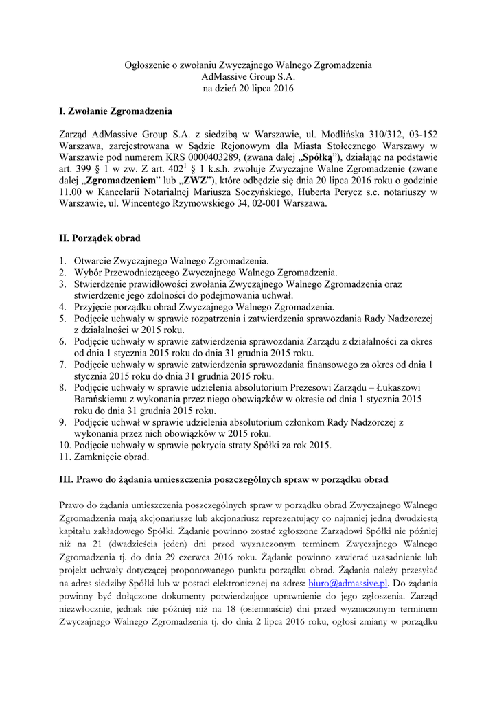 Ogłoszenie o zwołaniu Zwyczajnego Walnego Zgromadzenia AdMassive Group S.A. na dzień 20 lipca 2016 I. Zwołanie Zgromadzenia Zarząd AdMassive Group S.A. z siedzibą w Warszawie, ul. Modlińska 310/312, 03-152 Warszawa, zarejestrowana w Sądzie Rejonowym dla Miasta Stołecznego Warszawy w Warszawie pod numerem KRS 0000403289, (zwana dalej „Spółką”), działając na podstawie art. 399 § 1 w zw. Z art. 4021 § 1 k.s.h. zwołuje Zwyczajne Walne Zgromadzenie (zwane dalej „Zgromadzeniem” lub „ZWZ”), które odbędzie się dnia 20 lipca 2016 roku o godzinie 11.00 w Kancelarii Notarialnej Mariusza Soczyńskiego, Huberta Perycz s.c. notariuszy w Warszawie, ul. Wincentego Rzymowskiego 34, 02-001 Warszawa. II. Porządek obrad 1. Otwarcie Zwyczajnego Walnego Zgromadzenia. 2. Wybór Przewodniczącego Zwyczajnego Walnego Zgromadzenia. 3. Stwierdzenie prawidłowości zwołania Zwyczajnego Walnego Zgromadzenia oraz stwierdzenie jego zdolności do podejmowania uchwał. 4. Przyjęcie porządku obrad Zwyczajnego Walnego Zgromadzenia. 5. Podjęcie uchwały w sprawie rozpatrzenia i zatwierdzenia sprawozdania Rady Nadzorczej z działalności w 2015 roku. 6. Podjęcie uchwały w sprawie zatwierdzenia sprawozdania Zarządu z działalności za okres od dnia 1 stycznia 2015 roku do dnia 31 grudnia 2015 roku. 7. Podjęcie uchwały w sprawie zatwierdzenia sprawozdania finansowego za okres od dnia 1 stycznia 2015 roku do dnia 31 grudnia 2015 roku. 8. Podjęcie uchwały w sprawie udzielenia absolutorium Prezesowi Zarządu – Łukaszowi Barańskiemu z wykonania przez niego obowiązków w okresie od dnia 1 stycznia 2015 roku do dnia 31 grudnia 2015 roku. 9. Podjęcie uchwał w sprawie udzielenia absolutorium członkom Rady Nadzorczej z wykonania przez nich obowiązków w 2015 roku. 10. Podjęcie uchwały w sprawie pokrycia straty Spółki za rok 2015. 11. Zamknięcie obrad. III. Prawo do żądania umieszczenia poszczególnych spraw w porządku obrad Prawo do żądania umieszczenia poszczególnych spraw w porządku obrad Zwyczajnego Walnego Zgromadzenia mają akcjonariusze lub akcjonariusz reprezentujący co najmniej jedną dwudziestą kapitału zakładowego Spółki. Żądanie powinno zostać zgłoszone Zarządowi Spółki nie później niż na 21 (dwadzieścia jeden) dni przed wyznaczonym terminem Zwyczajnego Walnego Zgromadzenia tj. do dnia 29 czerwca 2016 roku. Żądanie powinno zawierać uzasadnienie lub projekt uchwały dotyczącej proponowanego punktu porządku obrad. Żądania należy przesyłać na adres siedziby Spółki lub w postaci elektronicznej na adres: [email protected]. Do żądania powinny być dołączone dokumenty potwierdzające uprawnienie do jego zgłoszenia. Zarząd niezwłocznie, jednak nie później niż na 18 (osiemnaście) dni przed wyznaczonym terminem Zwyczajnego Walnego Zgromadzenia tj. do dnia 2 lipca 2016 roku, ogłosi zmiany w porządku obrad, wprowadzone na żądanie akcjonariuszy. Ogłoszenie następuje w sposób właściwy dla zwołania Zwyczajnego Walnego Zgromadzenia. IV. Prawo akcjonariusza do zgłaszania projektów uchwał Akcjonariusz lub akcjonariusze Spółki reprezentujący co najmniej jedną dwudziestą kapitału zakładowego mogą przed terminem Zwyczajnego Walnego Zgromadzenia zgłaszać Spółce projekty uchwał dotyczące spraw wprowadzonych do porządku obrad Zwyczajnego Walnego Zgromadzenia lub spraw, które mają zostać wprowadzone do porządku obrad. Zgłoszenia należy dokonać przesyłając na piśmie projekty uchwał lub spraw, które mają zostać wprowadzone do porządku obrad, na adres siedziby Spółki lub w postaci elektronicznej na adres [email protected]. Do zgłoszenia powinny być dołączone dokumenty potwierdzające uprawnienie do dokonania zgłoszenia. Spółka niezwłocznie ogłosi projekty uchwał na stronie internetowejSpółki. V. Prawo do zgłaszania projektów uchwał dotyczących spraw wprowadzonych do porządku obrad podczas Zwyczajnego Walnego Zgromadzenia Każdy z akcjonariuszy może podczas Zwyczajnego Walnego Zgromadzenia zgłaszać projekty uchwał dotyczące spraw wprowadzonych do porządku obrad. Akcjonariusz ponadto ma prawo wnoszenia propozycji zmian i uzupełnień do projektów uchwał, objętych porządkiem Zwyczajnego Walnego Zgromadzenia – do czasu zamknięcia dyskusji nad punktem porządku obrad obejmującym projekt uchwały, której taka propozycja dotyczy. Propozycje te wraz z krótkim uzasadnieniem winny być składane na piśmie – osobno dla każdego projektu uchwały – z podaniem imienia i nazwiska albo firmy (nazwy) akcjonariusza, na ręce Przewodniczącego Zwyczajnego Walnego Zgromadzenia. VI. Sposób wykonywania prawa głosu przez pełnomocnika Akcjonariusz będący osobą fizyczną może uczestniczyć w Zwyczajnym Walnym Zgromadzeniu oraz wykonywać prawo głosu osobiście lub przez pełnomocnika. Akcjonariusz, który nie jest osobą fizyczną może uczestniczyć w Zwyczajnym Walnym Zgromadzeniu oraz wykonywać prawo głosu przez osobę uprawnioną do składania oświadczeń woli w jego imieniu lub przez pełnomocnika. Pełnomocnictwo powinno być, pod rygorem nieważności sporządzone w formie pisemnej i dołączone do protokołu Zwyczajnego Walnego Zgromadzenia lub udzielone w postaci elektronicznej. Formularz zawierający wzór pełnomocnictwa dostępny jest od dnia publikacji niniejszego ogłoszenia na stronie internetowej Spółki (www.admassive.pl), w zakładce Walne Zgromadzenie Akcjonariuszy. O udzieleniu pełnomocnictwa w postaci elektronicznej należy zawiadomić Spółkę przy wykorzystaniu środków komunikacji elektronicznej w postaci informacji przesłanej pocztą elektroniczną na adres [email protected] załączając dokument pełnomocnictwa w formacie pliku PDF, dokładając wszelkich starań, aby możliwa była skuteczna weryfikacja ważności pełnomocnictwa, w szczególności dołączając kserokopię lub zeskanowaną wersję zaświadczenia wydanego przez podmiot prowadzący