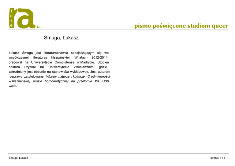 Smuga, Łukasz Łukasz Smuga jest literaturoznawcą specjalizującym się we współczesnej literaturze hiszpańskiej. W latach 2012-2014 pracował na Uniwersytecie Complutense w Madrycie. Stopień doktora uzyskał na Uniwersytecie Wrocławskim, gdzie zatrudniony jest obecnie na stanowisku wykładowcy. Jest autorem rozprawy zatytułowanej Wbrew naturze i kulturze. O odmienności w hiszpańskiej prozie homoerotycznej na przełomie XX i XXI wieku . Smuga, Łukasz strona: 1 / 1