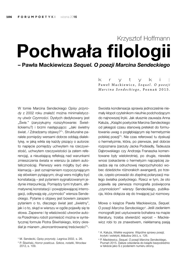 104 wiosna 2016 Krzysztof Hoffmann Pochwała filologii – Pawła Mackiewicza Sequel. O poezji Marcina Sendeckiego k r y t y k i : Paweł Mackiewicz , Sequel. O poezji Marcina S endeckie go, Poznań 2015. W tomie Marcina Sendeckiego Opisy przyrody z 2002 roku znaleźć można minimalistyczny utwór Czynności. Dystych dedykowany jest „Świe.” (zaryzykujmy rozszyfrowanie: Świetlickiemu?) i brzmi następująco: „Jaki świetny świat. / Zdradzamy objawy?”1. Strukturalne paralele pomiędzy wersami dobrze oddają dialektykę, w jaką wikła się każdy piszący o autorze: to napięcie pomiędzy uchwytem na rzeczywistość, uchwytem rzeczywistości (a zatem referencją), a nieustającą refleksją nad warunkami zmieszczenia świata w wierszu (a zatem autotelicznością). Pierwszy wers mógłby być eksklamacją – jest oznajmieniem rozpoczynającym się słówkiem pytającym; drugi wers mógłby być konstatacją – jest pytaniem sygnalizowanym jedynie interpunkcją. Pomiędzy tymi trybami, afirmatywnej konstatacji i powątpiewającej interrogacji, odbywają się „czynności” wiersza Sendeckiego. Pytanie o objawy jest bowiem zarazem pytaniem o to, dlaczego świat jest „świetny”, jak i o to, skąd w wierszu w ogóle pojawiły się te słowa. Zapewne i tę właściwość utworów autora Przedmiaru robót pomieścić można w syntetycznej formule Piotra Śliwińskiego, który określał je mianem „skoncentrowanej treściwości”2. Swoista kondensacja sprawia jednocześnie niemały kłopot czytelnikom nieufnie podchodzącym do najnowszej liryki. Jak słusznie zauważa Anna Kałuża, „Książki poetyckie Marcina Sendeckiego od jakiegoś czasu stanowią pretekst do formułowania uwag o pogłębiającym się hermetyzmie polskiej poezji”3. Nie czas referować tu dyskusji o hermetyzmie, która, po pierwsze, jest dobrze rozpoznana (zarzuty Jacka Podsiadły, Tadeusza Dąbrowskiego czy Andrzeja Franaszka komentowane były wielokrotnie), po drugie, niewiele wnosi (oskarżenie o hermetyzm najczęściej zasadza się na odruchowej nieprzychylności wobec dziedzictw różnorakich awangard), po trzecie, często prowadzi do zbędnej polaryzacji małego światka poetyckiego. Rzecz w tym, że oto pojawiła się pierwsza monografia poświęcona „czynnościom” wierszy Sendeckiego, publikacja, która dołącza się do trwającej już rozmowy. Mowa o książce Pawła Mackiewicza, Sequel. O poezji Marcina Sendeckiego4. Jeśli zadaniem monografii jest usytuowanie bohatera na mapie literatury, trzeba stwierdzić wprost – Mackiewicz robi to ze znawstwem, niekłamaną pasją A. Kałuża, Wielkie wygrane. Wspólne sprawy poezji, krytyki i estetyki, Mikołów 2011, s. 126. 4 P. Mackiewicz, Sequel. O poezji Marcina Sendeckiego, Poznań 2015. Dalsze odwołania do książki bezpośrednio w tekście jako S z podaniem numeru strony. 3 1 2 M. Sendecki, Opisy przyrody, Legnica 2002, s. 26. P. Śliwiński, Horror poeticus. Szkice, notatki, Wrocław 2012, s. 109. krytyki | Krzysztof Hoffmann, Pochwała filologii... i nierzadko imponującą erudycją. Jeżeli sformułować je odrobinę inaczej, jako głos w sprawach ważnych dla recepcji, pewne odpowiedzi zostają udzielone nie wprost (kwestia domniemanego hermetyzmu nie doczekuje się wyczerpującego omówienia – ostatecznie może i słusznie). Gdyby wreszcie szukać przewodnika po twórczości poety, niektóre momenty rodzą niedosyt, wywołują głód rozwinięcia, dopowiedzenia, skomplikowania. *** Naczelną quasi-kategorią przyjętą przez Mackiewicza jest kapitalna tytułowa metafora: sequel. Wpisuje się ona w ciąg intersemiotycznych metafor wyjaśniających, które, wykorzystując logikę suplementu, znaczącego naddatku, prze-tworzenia, funkcjonują już w dyskursie poetologicznym: pisano wszak o coverach (u Andrzeja Sosnowskiego czy – w inny sposób – u Darka Foksa), resamplingu i remiksie (dajmy na to u Adama Wiedemanna). Sequel jest oczywiście terminem zaczerpniętym z języka kinematografii, głównie hollywoodzkiej. Wspomnijmy tylko niekończące się przygody Kapitana Ameryki (wyrosłe na komiksowym podglebiu), kolejne części Szklanej pułapki z Bruce’em Willisem (klasyczny przykład poczucia humoru polskiej szkoły tłumaczenia tytułów), rozpaczliwe reanimacje jednorazowego konceptu filmu Matrix itd., itd. Ich wyniki kasowe przekonują, że cechą dobrze skrojonej pod publiczność sztuki jest przewidywalność i powtarzalność. Dla kinowych sceptyków filmowy sequel to odgrzewany kotlet sporządzony na dodatek z tego samego mięsa, z którego danie jedliśmy parę lat temu. Mackiewicz odwołuje się jednak nie do wątpliwej aksjologii rzeczonej kategorii, lecz strukturalnej mechaniki sequelu zasadzającej się na wariantywnym powtórzeniu. Co więcej, przemodelowuje i rozszerza granice pojęcia, rozpatrując je w czterech, wzajemnie komplementarnych, zakresach. Po pierwsze, „[s]equelu w jego najbardziej gruntownej postaci należy się doszukiwać w pracy poety u podstaw języka. Narzędziem modernizującym okazuje się wiersz. Jest on zarazem instrumentem poznawczym” (S, 7). Po drugie, sequel jest figurą autorepetycji. Dla twórczości Sendeckiego oznacza to krytyczną obróbkę „idei, tematów, autorów i wierszy szczególnie mocno niegdyś wpływających na jego wczesną twórczość” (S, 7). Po trzecie, sequel oznacza rekontekstualizację tego, co minione. W wypadku autora Błamu chodzi o awangardowe i neoawangardowe tradycje XX wieku. Wreszcie po czwarte, sequel nie jest nigdy powtórzeniem jeden do jeden. Wiąże się ze zmianą i wynikającą z niej kategorią gry – w ten sposób Sendecki podejmuje dialog z dziełami mocno osadzonymi w tradycji lekturowej. Czterem zakresom semantycznym sequelu odpowiadają cztery kolejne rozdziały książki Mackiewicza. Otwierający rozdział Nie ze słów (trzej panowie S.) zestawia Sendeckiego z liryką Piotra Sommera i Andrzeja Sosnowskiego. W tym trójkącie nie ws