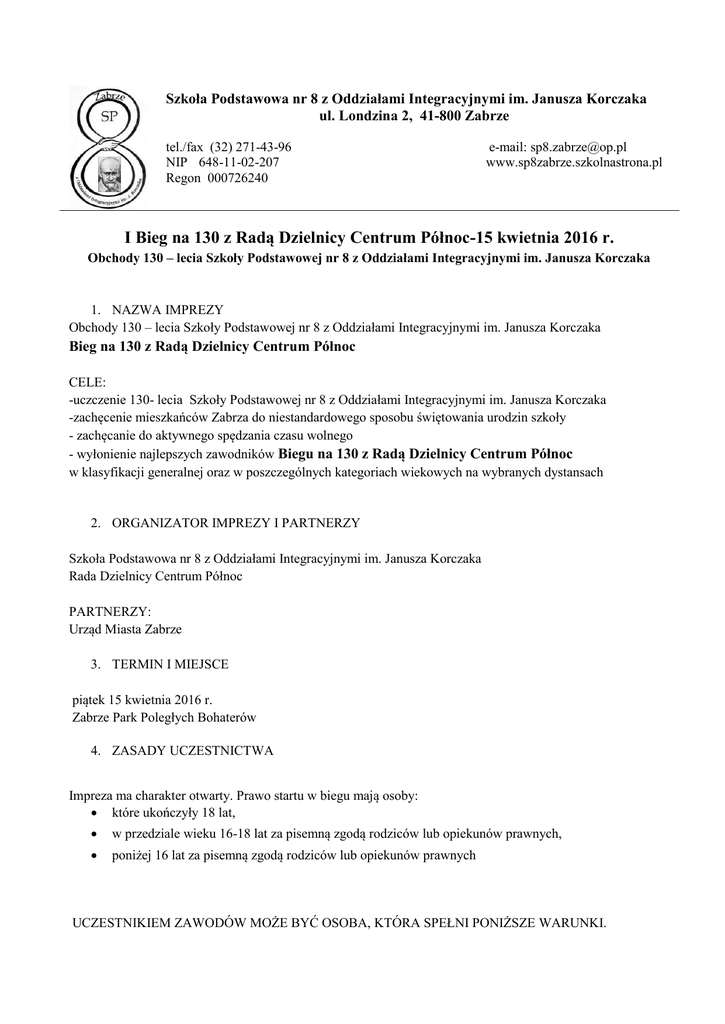 Szkoła Podstawowa nr 8 z Oddziałami Integracyjnymi im. Janusza Korczaka ul. Londzina 2, 41-800 Zabrze tel./fax (32) 271-43-96 NIP 648-11-02-207 Regon 000726240 e-mail: [email protected] www.sp8zabrze.szkolnastrona.pl I Bieg na 130 z Radą Dzielnicy Centrum Północ-15 kwietnia 2016 r. Obchody 130 – lecia Szkoły Podstawowej nr 8 z Oddziałami Integracyjnymi im. Janusza Korczaka 1. NAZWA IMPREZY Obchody 130 – lecia Szkoły Podstawowej nr 8 z Oddziałami Integracyjnymi im. Janusza Korczaka Bieg na 130 z Radą Dzielnicy Centrum Północ CELE: -uczczenie 130- lecia Szkoły Podstawowej nr 8 z Oddziałami Integracyjnymi im. Janusza Korczaka -zachęcenie mieszkańców Zabrza do niestandardowego sposobu świętowania urodzin szkoły - zachęcanie do aktywnego spędzania czasu wolnego - wyłonienie najlepszych zawodników Biegu na 130 z Radą Dzielnicy Centrum Północ w klasyfikacji generalnej oraz w poszczególnych kategoriach wiekowych na wybranych dystansach 2. ORGANIZATOR IMPREZY I PARTNERZY Szkoła Podstawowa nr 8 z Oddziałami Integracyjnymi im. Janusza Korczaka Rada Dzielnicy Centrum Północ PARTNERZY: Urząd Miasta Zabrze 3. TERMIN I MIEJSCE piątek 15 kwietnia 2016 r. Zabrze Park Poległych Bohaterów 4. ZASADY UCZESTNICTWA Impreza ma charakter otwarty. Prawo startu w biegu mają osoby: które ukończyły 18 lat, w przedziale wieku 16-18 lat za pisemną zgodą rodziców lub opiekunów prawnych, poniżej 16 lat za pisemną zgodą rodziców lub opiekunów prawnych UCZESTNIKIEM ZAWODÓW MOŻE BYĆ OSOBA, KTÓRA SPEŁNI PONIŻSZE WARUNKI. 1. Uczestnik zobowiązany jest do wypełnienia formularza zgłoszeniowego papierowego i złożenie go w sekretariacie SP nr 8 w Zabrzu lub w skrzynce szkoły w Wydziale Oświaty lubwypełenia formularza elektronicznego ( informacje na początku stycznia) 2. Do zawodów dopuszczone będą także osoby, które dokonają formalności startowych w biurze zawodów w dniu imprezy do godz. 10.30. 3. Każdy uczestnik startuje na własną odpowiedzialność (w przypadku zawodników niepełnoletnich na odpowiedzialność rodziców lub prawnych opiekunów). Do uczestnictwa w zawodach dopuszcza się wyłącznie osoby posiadające zaświadczenie lekarskie o braku przeciwwskazań do udziału w zawodach lub które złożą podpisane własnoręcznie, a w przypadku osób niepełnoletnich przez przedstawiciela ustawowego, oświadczenie o zdolności do udziału w zawodach (przy odbiorze numeru startowego uczestnik zobowiązany będzie do złożenia podpisu na formularzu zgłoszeniowym przygotowanym i wydrukowanym przez Organizatora) 5. ŚWIADCZENIA DLA UCZESTNIKÓW numer startowy z chipem (do zwrotu po zakończeniu zawodów), posiłek regeneracyjny po maratonie, pomiar czasu profesjonalnie oznaczone trasy, zabezpieczenie medyczne i ratownicze, puchary i medale dla zwycięzców doskonałą organizację i wspaniałą atmosferę Ubezpieczenie zawodów . 6. POMIAR CZASU Elektroniczny system identyfikacji i pomiaru czasu 7. ZASADY PRZEPROWADZANIA BIEGU NA 130 Z RADĄ DZIELNICY CENTRUM PÓŁNOC Dystanse: 130 metrów bieg dla uczniów klas I- III oraz przedszkolaków 1 km i 130 metrów bieg dla uczniów klas IV- VI 2 km i 130 metrów bieg dla uczniów gimnazjum 3 km i 130 metrów bieg dla uczniów szkół średnich 4 km 180 metrów dla miłośników Nordic walking i chodziarzy 8 km i 130 metrów bieg dla osób, które ukończyły 18 lat Zwycięzcami Maratonu w klasyfikacji generalnej zostają zawodnicy, którzy w najkrótszym czasie pokonają wyznaczone dystanse biegu (kategoria Kobiet i Mężczyzn). Zwycięzcami w poszczególnych kategoriach wiekowych zostają osoby, które z danej grupy wiekowej pokonają najszybciej wyznaczone dystanse. 8. KATEGORIE WIEKOWE klas I- III i 3- 9 lat klas IV- VI 10-13 lat uczniowie gimnazjum 14- 17 lat uczniowie szkół średnich od 18- 21 miłośnicy Nordic walking i chodziarze 18 do 130 lat 9. NAGRODY MEDALE + PUCHARY: I, II, III miejsce w kategorii bieg na 8 km i 130 metrów kobiety-dorośli I, II, III miejsce w kategorii bieg na 8 km i 130 metrów mężczyźni I, II, III miejsce w kategorii bieg na 3 km i 130 metrów dziewczyny-szkoły średnie I, II, III miejsce w kategorii bieg na 3 km i 130 metrów chłopcy I, II, III miejsce w kategorii bieg na 2 km i 130 metrów dziewczyny-gimnazja I, II, III miejsce w kategorii bieg na 2 km i 130 metrów chłopcy I, II, III miejsce w kategorii bieg na 1 km i 130 metrów dziewczyny- klasy IV- VI I, II, III miejsce w kategorii bieg na 8 km i 130 metrów chłopcy 130 metrów- klasy I- III i przedszkolaki- medale dla wszystkich 10. PROTESTY . 1. Zastrzeżenia dotyczące rozstrzygnięć zawodów winne zostać złożone w Biurze Zawodów w dniu rozgrywania zawodów przed oficjalnym wręczeniem nagród. 2. Kwestie sporne rozpatrywać będzie Kolegium złożone z przedstawicieli Organizatora oraz Partnerów. Kolegium może nałożyć kary w postaci kary czasowej dodawanej do wyniku końcowego lub dyskwalifikacji. 3. Ostateczna decyzja należy do Organizatora i jest nieodwołalna . 11. OCHRONA ŚRODOWISKA NATURALNEGO 1. Uczestnicy powinni szanować środowisko naturalne. 2. Uczestnicy nie mogą zanieczyszczać terenu i pozostawiać śmieci na trasie biegu. 3. Obowiązuje zakaz wyrzucania zużytych bidonów, opakowań po batonach i żelach energetycznych na trasie biegu. 4. Zabrania się używania szklanych pojemników w pobliżu i na trasie wyścigu. 12. POSTANOWIENIA KOŃCOWE 1. Wszyscy zawodnicy zobowiązują się do sportowego zachowania i przestrzegania zasad kultury osobistej oraz dobrych reguł koleżeństwa powszechnie uznawanych i szanowanych przez środowisko biegaczy. 2. Zawodnik, który wystartuje i zostanie zarejestrowany systemem pomiaru czasu, swoim uczestnictwem potwierdza, że zna, akceptuje i zobowiązuje się do przestrzegania zapisów niniejszego regulaminu oraz poruszania się tylko po oficjalnie wytyczonej trasie z zachowaniem zasad bezpieczeństwa . 3. Każdy uczestnik: - bierze udział