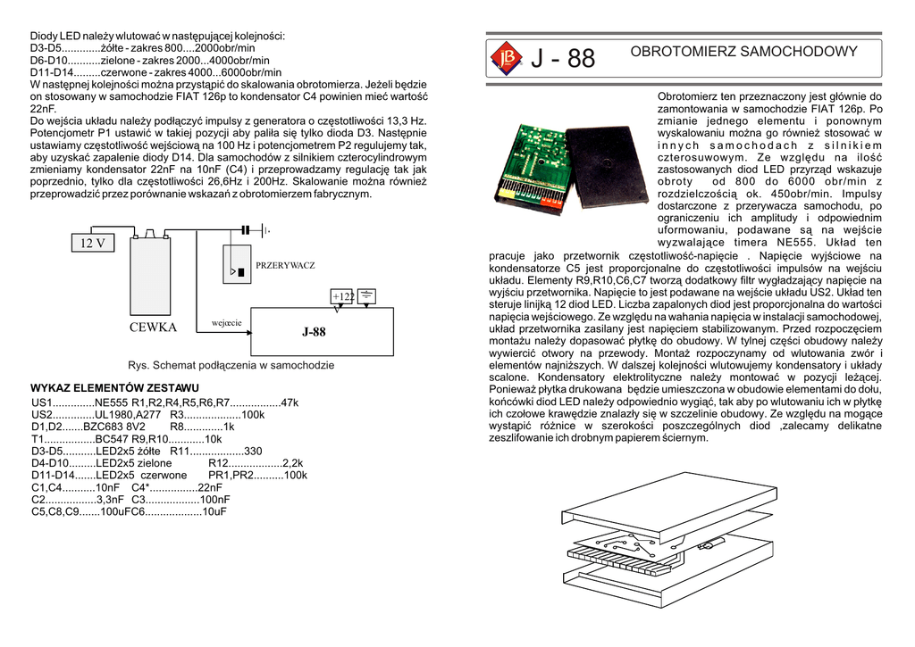 Diody LED nale¿y wlutowaæ w nastêpuj¹cej kolejnoœci: D3-D5.............¿ó³te - zakres 800....2000obr/min D6-D10...........zielone - zakres 2000...4000obr/min D11-D14.........czerwone - zakres 4000...6000obr/min W nastêpnej kolejnoœci mo¿na przyst¹piæ do skalowania obrotomierza. Je¿eli bêdzie on stosowany w samochodzie FIAT 126p to kondensator C4 powinien mieæ wartoœæ 22nF. Do wejœcia uk³adu nale¿y pod³¹czyæ impulsy z generatora o czêstotliwoœci 13,3 Hz. Potencjometr P1 ustawiæ w takiej pozycji aby pali³a siê tylko dioda D3. Nastêpnie ustawiamy czêstotliwoœæ wejœciow¹ na 100 Hz i potencjometrem P2 regulujemy tak, aby uzyskaæ zapalenie diody D14. Dla samochodów z silnikiem czterocylindrowym zmieniamy kondensator 22nF na 10nF (C4) i przeprowadzamy regulacjê tak jak poprzednio, tylko dla czêstotliwoœci 26,6Hz i 200Hz. Skalowanie mo¿na równie¿ przeprowadziæ przez porównanie wskazañ z obrotomierzem fabrycznym. 12 V PRZERYWACZ +122 V CEWKA wejœcie J-88 Rys. Schemat pod³¹czenia w samochodzie WYKAZ ELEMENTÓW ZESTAWU US1..............NE555 R1,R2,R4,R5,R6,R7.................47k US2..............UL1980,A277 R3...................100k D1,D2.......BZC683 8V2 R8.............1k T1.................BC547 R9,R10............10k D3-D5...........LED2x5 ¿ó³te R11..................330 D4-D10.........LED2x5 zielone R12..................2,2k D11-D14.......LED2x5 czerwone PR1,PR2..........100k C1,C4...........10nF C4*................22nF C2.................3,3nF C3..................100nF C5,C8,C9.......100uFC6...................10uF JABEL ® J - 88 OBROTOMIERZ SAMOCHODOWY Obrotomierz ten przeznaczony jest g³ównie do zamontowania w samochodzie FIAT 126p. Po zmianie jednego elementu i ponownym wyskalowaniu mo¿na go równie¿ stosowaæ w innych samochodach z silnikiem czterosuwowym. Ze wzglêdu na iloœæ zastosowanych diod LED przyrz¹d wskazuje obroty od 800 do 6000 obr/min z rozdzielczoœci¹ ok. 450obr/min. Impulsy dostarczone z przerywacza samochodu, po ograniczeniu ich amplitudy i odpowiednim uformowaniu, podawane s¹ na wejœcie wyzwalaj¹ce timera NE555. Uk³ad ten pracuje jako przetwornik czêstotliwoœæ-napiêcie . Napiêcie wyjœciowe na kondensatorze C5 jest proporcjonalne do czêstotliwoœci impulsów na wejœciu uk³adu. Elementy R9,R10,C6,C7 tworz¹ dodatkowy filtr wyg³adzaj¹cy napiêcie na wyjœciu przetwornika. Napiêcie to jest podawane na wejœcie uk³adu US2. Uk³ad ten steruje linijk¹ 12 diod LED. Liczba zapalonych diod jest proporcjonalna do wartoœci napiêcia wejœciowego. Ze wzglêdu na wahania napiêcia w instalacji samochodowej, uk³ad przetwornika zasilany jest napiêciem stabilizowanym. Przed rozpoczêciem monta¿u nale¿y dopasowaæ p³ytkê do obudowy. W tylnej czêœci obudowy nale¿y wywierciæ otwory na przewody. Monta¿ rozpoczynamy od wlutowania zwór i elementów najni¿szych. W dalszej kolejnoœci wlutowujemy kondensatory i uk³ady scalone. Kondensatory elektrolityczne nale¿y montowaæ w pozycji le¿¹cej. Poniewa¿ p³ytka drukowana bêdzie umieszczona w obudowie elementami do do³u, koñcówki diod LED nale¿y odpowiednio wygi¹æ, tak aby po wlutowaniu ich w p³ytkê ich czo³owe krawêdzie znalaz³y siê w szczelinie obudowy. Ze wzglêdu na mog¹ce wyst¹piæ ró¿nice w szerokoœci poszczególnych diod ,zalecamy delikatne zeszlifowanie ich drobnym papierem œciernym.