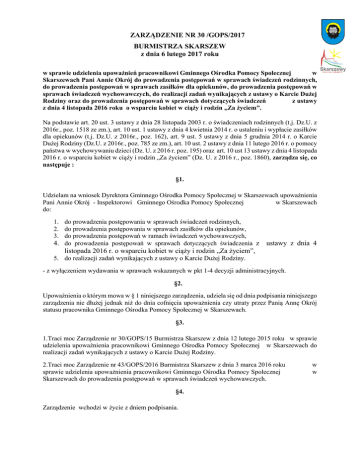 ZARZĄDZENIE NR 30 /GOPS/2017 BURMISTRZA SKARSZEW z dnia 6 lutego 2017 roku w sprawie udzielenia upoważnień pracownikowi Gminnego Ośrodka Pomocy Społecznej w Skarszewach Pani Annie Okrój do prowadzenia postępowań w sprawach świadczeń rodzinnych, do prowadzenia postępowań w sprawach zasiłków dla opiekunów, do prowadzenia postępowań w sprawach świadczeń wychowawczych, do realizacji zadań wynikających z ustawy o Karcie Dużej Rodziny oraz do prowadzenia postępowań w sprawach dotyczących świadczeń z ustawy z dnia 4 listopada 2016 roku o wsparciu kobiet w ciąży i rodzin „Za życiem”. Na podstawie art. 20 ust. 3 ustawy z dnia 28 listopada 2003 r. o świadczeniach rodzinnych (t.j. Dz.U. z 2016r., poz. 1518 ze zm.), art. 10 ust. 1 ustawy z dnia 4 kwietnia 2014 r. o ustaleniu i wypłacie zasiłków dla opiekunów (t.j. Dz.U. z 2016r., poz. 162), art. 9 ust. 5 ustawy z dnia 5 grudnia 2014 r. o Karcie Dużej Rodziny (Dz.U. z 2016r., poz. 785 ze zm.), art. 10 ust. 2 ustawy z dnia 11 lutego 2016 r. o pomocy państwa w wychowywaniu dzieci (Dz. U. z 2016 r. poz. 195) oraz art. 10 ust 13 ustawy z dnia 4 listopada 2016 r. o wsparciu kobiet w ciąży i rodzin „Za życiem” (Dz. U. z 2016 r., poz. 1860), zarządza się, co następuje : §1. Udzielam na wniosek Dyrektora Gminnego Ośrodka Pomocy Społecznej w Skarszewach upoważnienia Pani Annie Okrój - Inspektorowi Gminnego Ośrodka Pomocy Społecznej w Skarszewach do: 1. do prowadzenia postępowania w sprawach świadczeń rodzinnych, 2. do prowadzenia postępowania w sprawach zasiłków dla opiekunów, 3. do prowadzenia postępowań w ramach świadczeń wychowawczych, 4. do prowadzenia postępowań w sprawach dotyczących świadczenia z ustawy z dnia 4 listopada 2016 r. o wsparciu kobiet w ciąży i rodzin „Za życiem”, 5. do realizacji zadań wynikających z ustawy o Karcie Dużej Rodziny. - z wyłączeniem wydawania w sprawach wskazanych w pkt 1-4 decyzji administracyjnych. §2. Upoważnienia o którym mowa w § 1 niniejszego zarządzenia, udziela się od dnia podpisania niniejszego zarządzenia nie dłużej jednak niż do dnia cofnięcia upoważnienia czy utraty przez Panią Annę Okrój statusu pracownika Gminnego Ośrodka Pomocy Społecznej w Skarszewach. §3. 1.Traci moc Zarządzenie nr 30/GOPS/15 Burmistrza Skarszew z dnia 12 lutego 2015 roku w sprawie udzielenia upoważnienia pracownikowi Gminnego Ośrodka Pomocy Społecznej w Skarszewach do realizacji zadań wynikających z ustawy o Karcie Dużej Rodziny. 2.Traci moc Zarządzenie nr 43/GOPS/2016 Burmistrza Skarszew z dnia 3 marca 2016 roku sprawie udzielenia upoważnienia pracownikowi Gminnego Ośrodka Pomocy Społecznej Skarszewach do prowadzenia postępowań w sprawach świadczeń wychowawczych. §4. Zarządzenie wchodzi w życie z dniem podpisania. w w