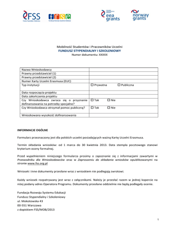 Mobilność Studentów i Pracowników Uczelni FUNDUSZ STYPENDIALNY I SZKOLENIOWY Numer dokumentu: XXXXX Nazwa Wnioskodawcy Prawny przedstawiciel (1) Prawny przedstawiciel (2) Numer Karty Uczelni Erasmusa (EUC) Typ instytucji Prywatna Publiczna Data rozpoczęcia projektu Data zakończenia projektu Czy Wnioskodawca zwraca się o przyznanie Tak Nie dofinansowania na potrzeby specjalne? Czy Wnioskodawca otrzymał pomoc publiczną? Tak Nie Wnioskowana wysokość dofinansowania INFORMACJE OGÓLNE Formularz przeznaczony jest dla polskich uczelni posiadających ważną Kartę Uczelni Erasmusa. Termin składania wniosków: od 1 marca do 30 kwietnia 2013. Data stempla pocztowego stanowi kryterium oceny formalnej. Przed wypełnieniem niniejszego formularza prosimy o zapoznanie się z informacjami zawartymi w Przewodniku dla Wnioskodawców oraz w Zaproszeniu do składania wniosków opublikowanymi na stronie www.fss.org.pl Wniosek i inne dokumenty przesłane wraz z wnioskiem nie podlegają zwrotowi. Każdy wniosek rozpatrywany jest wraz z załącznikami. Należy je przesłać razem w jednej kopercie na niżej podany adres Operatora Programu. Dokumenty przesłane oddzielnie nie będą podlegały ocenie. Fundacja Rozwoju Systemu Edukacji Fundusz Stypendialny i Szkoleniowy ul. Mokotowska 43 00‐551 Warszawa z dopiskiem FSS/MOB/2013 1 1. Opis Wnioskodawcy Pełna nazwa urzędowa w języku narodowym Pełna nazwa urzędowa w języku angielskim Numer Karty Uczelni Erasmusa EUC Strona www Typ instytucji Prywatna Publiczna Orientacja rynkowa: nastawiona na zysk typu non‐profit Rodzaj instytucji EDU.1 ‐ Nursery school Nazwy poszczególnych kategorii instytucji EDU.2 ‐ Primary school podano w języku angielskim, w celu EDU.3 ‐ Secondary school (including Vocational / technical) ujednolicenia nazewnictwa z wymogami EDU.4 ‐ Higher education institution sprawozdawczości Operatora dla Państw‐ EDU.5 ‐ Adult or continuing education provider Darczyńców. ASS.1 ‐ Non‐profit association (regional / national) ASS.2 ‐ Non‐profit association (European / international) ASS.3 ‐ Association of Universities RES Research institute PUB.1 – Public authority (local) PUB.2 – Public authority (regional) PUB.3 – Public authority (national) IND – Private company (manufacturing) SER – Private company (services) OTH – Other type of organisation Adres urzędowy Kraj Region Ulica Numer budynku/lokalu Kod pocztowy Miejscowość PL – Polska [wartość domyślna] PL11‐Lodzkie PL12‐Mazowieckie PL21‐Malopolskie PL22‐Slaskie PL31‐Lubelskie PL32‐Podkarpackie PL33‐Swietokrzyskie PL34‐Podlaskie PL41‐Wielkopolskie PL42‐Zachodniopomorskie PL43‐Lubuskie PL51‐Dolnoslaskie PL52‐Opolskie PL61‐Kujawsko‐Pomorskie PL62‐Warminsko‐Mazurskie PL63‐Pomorskie 2 1.1. Prawny przedstawiciel Wnioskodawcy Dane muszą być zgodne z Krajowym Rejestrem Sądowym lub innym właściwym dokumentem rejestracyjnym. Wniosek musi być podpisany przez prawnego przedstawiciela Wnioskodawcy, na uczelniach wyższych jest to przeważnie JM Rektor. Pan Pani Imię Nazwisko Tytuł naukowy Stanowisko służbowe Numer telefonu (wraz z numerem kierunkowym) Numer fax. (wraz z numerem kierunkowym) Adres e‐mail Adres do korespondencji: Taki sam jak instytucji wnioskującej Inny Ulica Numer budynku/lokalu Kod pocztowy Miejscowość Kraj [Button „Dodaj osobę” ‐ Wnioskodawca może dodać drugiego i kolejnych przedstawicieli prawnych] 1.2. Osoba do kontaktu – koordynator projektu FSS Na adres elektroniczny i faks tej osoby wysyłane będą wszelkie informacje i zapytania dotyczące niniejszego wniosku. Prosimy o upewnienie się, że adres mailowy jest aktywny, a korespondencja sprawdzana na bieżąco. Pan Pani Imię Nazwisko Tytuł naukowy Stanowisko służbowe Adres e‐mail Telefon (wraz z numerem kierunkowym) Fax. (wraz z numerem kierunkowym) 3 2. Wykaz instytucji partnerskich Do wniosku należy dołączyć oryginały umów o współpracy w ramach FSS (wzór umowy dostępny na stronie www.fss.org.pl) z każdą z wymienionych poniżej instytucji partnerskich. Instytucja partnerska 1 Pełna nazwa urzędowa w języku angielskim Strona www Numer Karty Uczelni Erasmusa EUC (jeśli dotyczy) Rodzaj instytucji EDU.1 – Nursery school EDU.2 – Primary school EDU.3 – Secondary school (including Vocational / technical) EDU.4 – Higher education institution EDU.5 – Adult or continuing education provider ASS.1 – Non‐profit association (regional / national) ASS.2 – Non‐profit association (European / international) ASS.3 – Association of Universities RES – Research institute PUB.1 – Public authority (local) PUB.2 – Public authority (regional) PUB.3 – Public authority (national) IND – Private company (manufacturing) SER – Private company (services) OTH – Other type of organisation Kraj lista rozwijalna do wyboru: NO‐Norwegia IS‐Islandia LI‐Liechtenstein Region (jeśli NO) NO01‐Oslo og Akershus NO02‐Hedmark og Oppland NO03‐Sør‐Østlandet NO04‐Agder og Rogaland NO05‐Vestlandet NO06‐Trøndelag NO07‐Nord‐Norge Region (jeśli IS) IS00‐Ísland Region (jeśli LI) LI00‐Liechtenstein [Button „Dodaj instytucję partnerską” ‐ Wnioskodawca może dodać wiele instytucji 4 3. Streszczenie Streszczenie projektu uwzględniające informacje dotyczące celów, planowanych działań i rezultatów Streszczenie projektu w języku angielskim uwzględniające informacje dotyczące celów, planowanych działań i rezultatów Ile wymian z instytucjami z Państw‐ Darczyńców zrealizowano w ostatnim roku akademickim ogółem (2011/2012). studenci Należy uwzględnić zarówno wyjazdy jak i pracownicy przyjazdy razem Norwegia [suma] Islandia [suma] Liechtenstein [suma] razem [suma] [suma] [suma] 4. Zagadnienia horyzontalne Prosimy o zaznaczenie zagadnienia (jednego lub więcej), które w największym stopniu odnosi się do realizacji i zakładanych rezultatów projektu. Zagadnieni