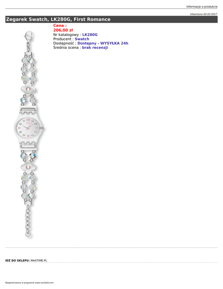 Informacje o produkcie Utworzono 02-03-2017 Zegarek Swatch, LK280G, First Romance Cena : 206,00 zł Nr katalogowy : LK280G Producent : Swatch Dostępność : Dostępny - WYSYŁKA 24h Średnia ocena : brak recenzji IDŹ DO SKLEPU: MAXTIME.PL Wygenerowano w programie www.oscGold.com