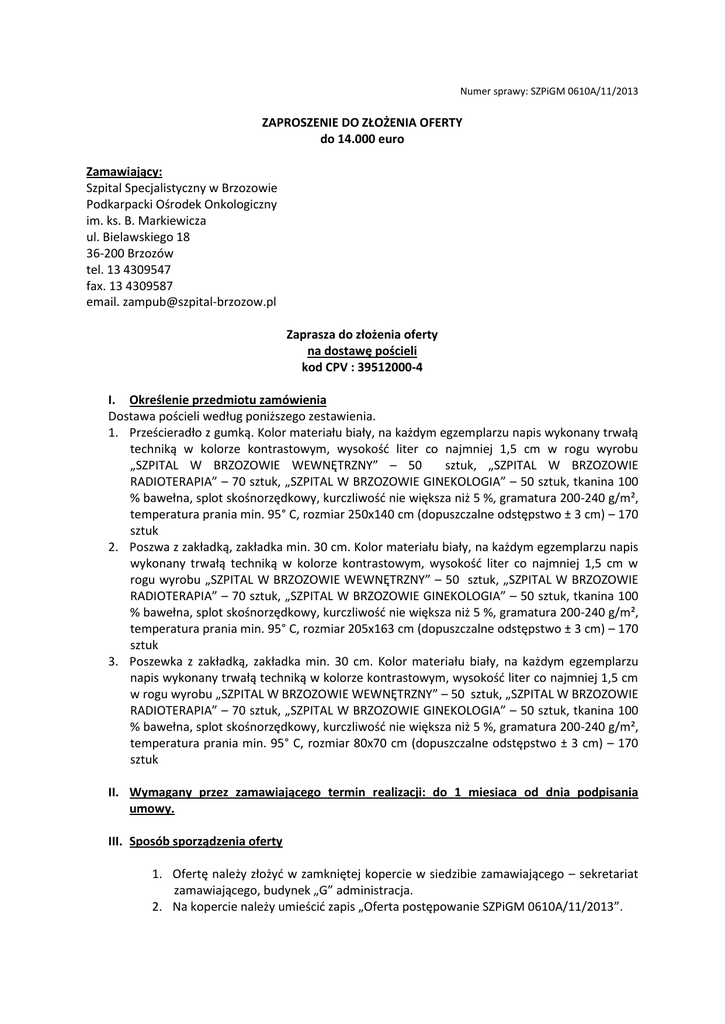 Numer sprawy: SZPiGM 0610A/11/2013 ZAPROSZENIE DO ZŁOŻENIA OFERTY do 14.000 euro Zamawiający: Szpital Specjalistyczny w Brzozowie Podkarpacki Ośrodek Onkologiczny im. ks. B. Markiewicza ul. Bielawskiego 18 36-200 Brzozów tel. 13 4309547 fax. 13 4309587 email. [email protected] Zaprasza do złożenia oferty na dostawę pościeli kod CPV : 39512000-4 I. Określenie przedmiotu zamówienia Dostawa pościeli według poniższego zestawienia. 1. Prześcieradło z gumką. Kolor materiału biały, na każdym egzemplarzu napis wykonany trwałą techniką w kolorze kontrastowym, wysokość liter co najmniej 1,5 cm w rogu wyrobu „SZPITAL W BRZOZOWIE WEWNĘTRZNY” – 50 sztuk, „SZPITAL W BRZOZOWIE RADIOTERAPIA” – 70 sztuk, „SZPITAL W BRZOZOWIE GINEKOLOGIA” – 50 sztuk, tkanina 100 % bawełna, splot skośnorzędkowy, kurczliwość nie większa niż 5 %, gramatura 200-240 g/m², temperatura prania min. 95° C, rozmiar 250x140 cm (dopuszczalne odstępstwo ± 3 cm) – 170 sztuk 2. Poszwa z zakładką, zakładka min. 30 cm. Kolor materiału biały, na każdym egzemplarzu napis wykonany trwałą techniką w kolorze kontrastowym, wysokość liter co najmniej 1,5 cm w rogu wyrobu „SZPITAL W BRZOZOWIE WEWNĘTRZNY” – 50 sztuk, „SZPITAL W BRZOZOWIE RADIOTERAPIA” – 70 sztuk, „SZPITAL W BRZOZOWIE GINEKOLOGIA” – 50 sztuk, tkanina 100 % bawełna, splot skośnorzędkowy, kurczliwość nie większa niż 5 %, gramatura 200-240 g/m², temperatura prania min. 95° C, rozmiar 205x163 cm (dopuszczalne odstępstwo ± 3 cm) – 170 sztuk 3. Poszewka z zakładką, zakładka min. 30 cm. Kolor materiału biały, na każdym egzemplarzu napis wykonany trwałą techniką w kolorze kontrastowym, wysokość liter co najmniej 1,5 cm w rogu wyrobu „SZPITAL W BRZOZOWIE WEWNĘTRZNY” – 50 sztuk, „SZPITAL W BRZOZOWIE RADIOTERAPIA” – 70 sztuk, „SZPITAL W BRZOZOWIE GINEKOLOGIA” – 50 sztuk, tkanina 100 % bawełna, splot skośnorzędkowy, kurczliwość nie większa niż 5 %, gramatura 200-240 g/m², temperatura prania min. 95° C, rozmiar 80x70 cm (dopuszczalne odstępstwo ± 3 cm) – 170 sztuk II. Wymagany przez zamawiającego termin realizacji: do 1 miesiaca od dnia podpisania umowy. III. Sposób sporządzenia oferty 1. Ofertę należy złożyć w zamkniętej kopercie w siedzibie zamawiającego – sekretariat zamawiającego, budynek „G” administracja. 2. Na kopercie należy umieścić zapis „Oferta postępowanie SZPiGM 0610A/11/2013”. 3. Oferta musi być podpisana przez osobę uprawnioną do reprezentowania wykonawcy bądź osobę upoważnioną przez wykonawcę na piśmie. 4. Ceny w ofercie muszą być wyrażone w polskich złotych zgodnie z obowiązującym systemem monetarnym (zaokrąglone do dwóch miejsc po przecinku). 5. Zamawiający informuje, że rozliczenia miedzy zamawiającym a wykonawcą będą prowadzone tylko w złotych polskich. 6. Zamawiający informuje, że w trakcie realizacji umowy mogą wystąpić z jego strony opóźnienia w płatności zobowiązań wynikających z niniejszego zamówienia, do 120 dni po terminie płatności faktury. IV. Oferta musi zawierać następujące dokumenty i informacje 1. Formularz oferty wykonawcy – według załączonego wzoru załącznik nr 1 V. Termin złożenia oferty: do 1 marca 2013 r. do godz. 12.00. VI. Osoba uprawnioną do kontaktów z wykonawcami jest mgr Sławomir Szałajko, dane kontaktowe jak w nagłówku. VII. Przy wyborze oferty zamawiający będzie się kierował kryterium: cena – 100 % VIII.Po wyborze najkorzystniejszej oferty zamawiający wyśle do wybranego wykonawcy umowę do podpisania i zwrotu jednego egzemplarza. IX. Zamawiający zastrzega sobie prawo unieważnienia postępowania na każdym etapie przed podpisaniem umowy bez podawania przyczyn. X. Załączniki: 1. Formularz oferty wykonawcy. 2. Wzór umowy. Załącznik nr 1 OFERTA WYKONAWCY Dane dotyczące Wykonawcy: Nazwa: ................................................................................................................................................ Siedziba: ......................................................................................................................................... REGON: ………………………………………………………….. NIP: ………………………………………………………………………….. Tel. ................................................................. Fax. ......................................................................... Email. .............................................................................................................................................. Zobowiązania wykonawcy: 1. Nawiązując do zaproszenia do złożenia oferty (numer sprawy SZPiGM 0610A/11/2013) na dostawę pościeli oferuję wykonanie przedmiotu zamówienia za cenę: netto .................................... PLN słownie ............................................................................................................................... stawka podatku VAT............................. % brutto .................................... PLN słownie .............................................................................................................................. Lp. Asortyment 1 Prześcieradło z gumką. Kolor materiału biały, na każdym egzemplarzu napis wykonany trwałą techniką w kolorze kontrastowym, wysokość liter co najmniej 1,5 cm w rogu wyrobu „SZPITAL W BRZOZOWIE WEWNĘTRZNY” – 50 sztuk, „SZPITAL W BRZOZOWIE RADIOTERAPIA” – 70 sztuk, „SZPITAL W BRZOZOWIE GINEKOLOGIA” – 50 sztuk, tkanina 100 % bawełna, splot skośnorzędkowy, kurczliwość nie większa niż 5 %, gramatura 200-240 g/m², temperatura prania min. 95° C, rozmiar 250x140 cm (dopuszczalne odstępstwo ± 3 cm) – 170 sztuk Poszwa z zakładką, zakładka min. 30 cm. Kolor materiału biały, na każdym egzemplarzu napis wykonany trwałą techniką w kolorze ko