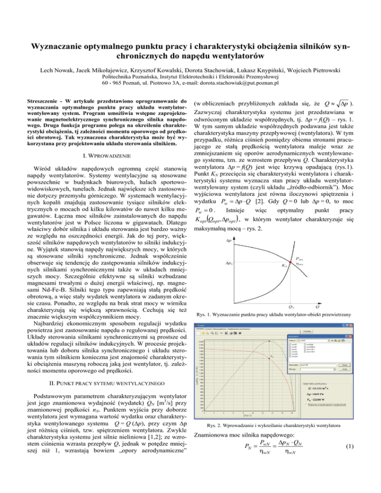 Wyznaczanie optymalnego punktu pracy i charakterystyki obciążenia silników synchronicznych do napędu wentylatorów Lech Nowak, Jacek Mikołajewicz, Krzysztof Kowalski, Dorota Stachowiak, Łukasz Knypiński, Wojciech Pietrowski Politechnika Poznańska, Instytut Elektrotechniki i Elektroniki Przemysłowej 60 - 965 Poznań, ul. Piotrowo 3A, e-mail: [email protected] Streszczenie - W artykule przedstawiono oprogramowanie do wyznaczania optymalnego punktu pracy układu wentylatorwentylowany system. Program umożliwia wstępne zaprojektowanie magnetoelektrycznego synchronicznego silnika napędowego. Druga funkcja programu polega na określeniu charakterystyki obciążenia, tj zależności momentu oporowego od prędkości obrotowej. Tak wyznaczona charakterystyka może być wykorzystana przy projektowaniu układu sterowania silnikiem. I. WPROWADZENIE Wśród układów napędowych ogromną część stanowią napędy wentylatorów. Systemy wentylacyjne są stosowane powszechnie w budynkach biurowych, halach sportowowidowiskowych, tunelach. Jednak największe ich zastosowanie dotyczy przemysłu górniczego. W systemach wentylacyjnych kopalń znajdują zastosowanie tysiące silników elektrycznych o mocach od kilku kilowatów do nawet kilku megawatów. Łączna moc silników zainstalowanych do napędu wentylatorów jest w Polsce liczona w gigawatach. Dlatego właściwy dobór silnika i układu sterowania jest bardzo ważny ze względu na oszczędności energii. Jak do tej pory, większość silników napędowych wentylatorów to silniki indukcyjne. Wyjątek stanowią napędy największych mocy, w których są stosowane silniki synchroniczne. Jednak współcześnie obserwuje się tendencję do zastępowania silników indukcyjnych silnikami synchronicznymi także w układach mniejszych mocy. Szczególnie efektywne są silniki wzbudzane magnesami trwałymi o dużej energii właściwej, np. magnesami Nd-Fe-B. Silniki tego typu zapewniają stałą prędkość obrotową, a więc stały wydatek wentylatora w zadanym okresie czasu. Ponadto, ze względu na brak strat mocy w wirniku charakteryzują się większą sprawnością. Cechują się też znacznie większym współczynnikiem mocy. Najbardziej ekonomicznym sposobem regulacji wydatku powietrza jest zastosowanie napędu o regulowanej prędkości. Układy sterowania silnikami synchronicznymi są prostsze od układów regulacji silników indukcyjnych. W procesie projektowania lub doboru silnika synchronicznego i układu sterowania tym silnikiem konieczna jest znajomość charakterystyki obciążenia maszyną roboczą jaką jest wentylator, tj. zależności momentu oporowego od prędkości. (w obliczeniach przybliżonych zakłada się, że Q p ). Zazwyczaj charakterystyka systemu jest przedstawiana w odwróconym układzie współrzędnych, tj. p = f(Q) – rys. 1. W tym samym układzie współrzędnych podawana jest także charakterystyka maszyny przepływowej (wentylatora). W tym przypadku, różnica ciśnień pomiędzy obiema stronami pracującego ze stałą prędkością wentylatora maleje wraz ze zmniejszaniem się oporów aerodynamicznych wentylowanego systemu, tzn. ze wzrostem przepływu Q. Charakterystyka wentylatora p = f(Q) jest więc krzywą opadającą (rys.1). Punkt KN przecięcia się charakterystyki wentylatora i charakterystyki systemu wyznacza stan pracy układu wentylatorwentylowany system (czyli układu „źródło-odbiornik”). Moc wyjściowa wentylatora jest równa iloczynowi spiętrzenia i wydatku Pw p Q [2]. Gdy Q = 0 lub p = 0, to moc Istnieje więc optymalny punkt pracy Pw 0 . K opt Qopt , popt , w którym wentylator charakteryzuje się maksymalną mocą – rys. 2. Rys. 1. Wyznaczanie punktu pracy układu wentylator-obiekt przewietrzany II. PUNKT PRACY SYTEMU WENTYLACYJNEGO Podstawowym parametrem charakteryzującym wentylator jest jego znamionowa wydajność (wydatek) QN [m3/s] przy znamionowej prędkości nN. Punktem wyjścia przy doborze wentylatora jest wymagana wartość wydatku oraz charakterystyka wentylowanego systemu Q = Q (p), przy czym p jest różnicą ciśnień, tzw. spiętrzeniem wentylatora. Zwykle charakterystyka systemu jest silnie nieliniowa [1,2]; ze wzrostem ciśnienia wzrasta przepływ Q, jednak w potędze mniejszej niż 1, wzrastają bowiem „opory aerodynamiczne” Rys. 2. Wprowadzanie i wykreślanie charakterystyki wentylatora Znamionowa moc silnika napędowego: P p Q PN wN N N wN wN (1) zaś jego znamionowy moment obrotowy: PwN Q p N TN N N wN N wN (2) przy czym N , wN – znamionowa prędkość kątowa i znamionowa sprawność wentylatora. Wentylator powinien być tak dobrany do systemu by jego znamionowy punkt pracy odpowiadał maksymalnej wydatkowanej mocy. Wówczas z zależności (1) i (2) wyznacza się moc znamionową i moment silnika napędowego. III. WYZNACZANIE CHARAKTERYSTYKI OBCIĄŻENIA Rozważania dotyczą napędów do wentylatorów o regulowanym wydatku – poprzez zmianę prędkości obrotowej silnika napędowego. Wydatek wentylatora jest przy zachowaniu stałego spiętrzenia proporcjonalny do prędkości obrotowej natomiast spiętrzenie – do kwadratu prędkości [1,2]: 2 p N (3) p N Na tej podstawie można wyznaczyć charakterystykę wentylatora oraz punkt pracy układu dla dowolnej, różnej od znamionowej prędkości obrotowej. Na rys. 3 przedstawiono rodzinę charakterystyk dla N oraz =0,9; 0,8; 0,7 i 0,6 N . Punkty przecięcia się krzywych z charakterystyką systemu wyznaczają stany pracy układu dla tych prędkości. Jeżeli przyjąć, że opory aerodynamiczne są proporcjonalne do prędkości, a sprawność wentylatora jest od prędkości niezależna, to z zal. (3) wynika, że moment jest proporcjonalny do kwadratu prędkości. Jednak w realnym układzie wydatek i spiętrzenie zmieniają się swobodnie wraz ze zmianą prędkości obrotowej wentylatora, a relacja pomiędzy tymi parametrami jest zarówno w odniesieniu do wentylatora jak też wentylowanego systemu silnie nielinio