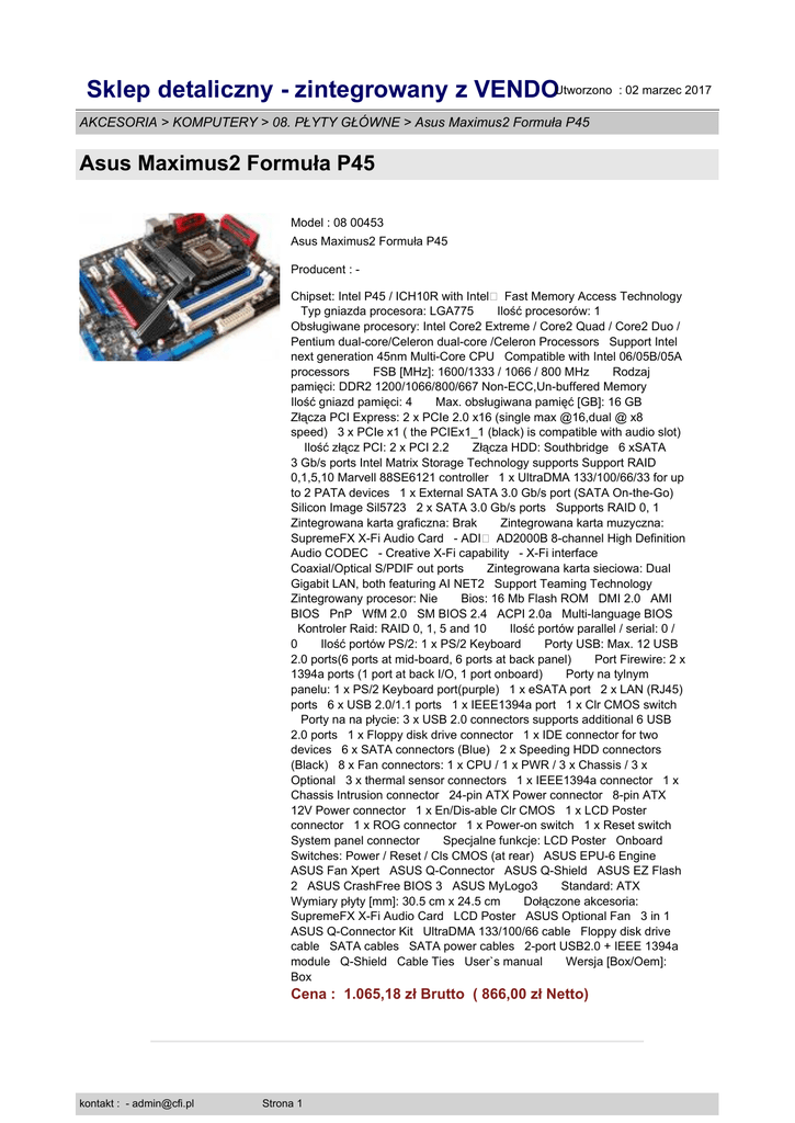Sklep detaliczny - zintegrowany z VENDOUtworzono : 02 marzec 2017 AKCESORIA > KOMPUTERY > 08. PŁYTY GŁÓWNE > Asus Maximus2 Formuła P45 Asus Maximus2 Formuła P45 Model : 08 00453 Asus Maximus2 Formuła P45 Producent : Chipset: Intel P45 / ICH10R with Intel Fast Memory Access Technology Typ gniazda procesora: LGA775 Ilość procesorów: 1 Obsługiwane procesory: Intel Core2 Extreme / Core2 Quad / Core2 Duo / Pentium dual-core/Celeron dual-core /Celeron Processors Support Intel next generation 45nm Multi-Core CPU Compatible with Intel 06/05B/05A processors FSB [MHz]: 1600/1333 / 1066 / 800 MHz Rodzaj pamięci: DDR2 1200/1066/800/667 Non-ECC,Un-buffered Memory Ilość gniazd pamięci: 4 Max. obsługiwana pamięć [GB]: 16 GB Złącza PCI Express: 2 x PCIe 2.0 x16 (single max @16,dual @ x8 speed) 3 x PCIe x1 ( the PCIEx1_1 (black) is compatible with audio slot) Ilość złącz PCI: 2 x PCI 2.2 Złącza HDD: Southbridge 6 xSATA 3 Gb/s ports Intel Matrix Storage Technology supports Support RAID 0,1,5,10 Marvell 88SE6121 controller 1 x UltraDMA 133/100/66/33 for up to 2 PATA devices 1 x External SATA 3.0 Gb/s port (SATA On-the-Go) Silicon Image Sil5723 2 x SATA 3.0 Gb/s ports Supports RAID 0, 1 Zintegrowana karta graficzna: Brak Zintegrowana karta muzyczna: SupremeFX X-Fi Audio Card - ADI AD2000B 8-channel High Definition Audio CODEC - Creative X-Fi capability - X-Fi interface Coaxial/Optical S/PDIF out ports Zintegrowana karta sieciowa: Dual Gigabit LAN, both featuring AI NET2 Support Teaming Technology Zintegrowany procesor: Nie Bios: 16 Mb Flash ROM DMI 2.0 AMI BIOS PnP WfM 2.0 SM BIOS 2.4 ACPI 2.0a Multi-language BIOS Kontroler Raid: RAID 0, 1, 5 and 10 Ilość portów parallel / serial: 0 / 0 Ilość portów PS/2: 1 x PS/2 Keyboard Porty USB: Max. 12 USB 2.0 ports(6 ports at mid-board, 6 ports at back panel) Port Firewire: 2 x 1394a ports (1 port at back I/O, 1 port onboard) Porty na tylnym panelu: 1 x PS/2 Keyboard port(purple) 1 x eSATA port 2 x LAN (RJ45) ports 6 x USB 2.0/1.1 ports 1 x IEEE1394a port 1 x Clr CMOS switch Porty na na płycie: 3 x USB 2.0 connectors supports additional 6 USB 2.0 ports 1 x Floppy disk drive connector 1 x IDE connector for two devices 6 x SATA connectors (Blue) 2 x Speeding HDD connectors (Black) 8 x Fan connectors: 1 x CPU / 1 x PWR / 3 x Chassis / 3 x Optional 3 x thermal sensor connectors 1 x IEEE1394a connector 1 x Chassis Intrusion connector 24-pin ATX Power connector 8-pin ATX 12V Power connector 1 x En/Dis-able Clr CMOS 1 x LCD Poster connector 1 x ROG connector 1 x Power-on switch 1 x Reset switch System panel connector Specjalne funkcje: LCD Poster Onboard Switches: Power / Reset / Cls CMOS (at rear) ASUS EPU-6 Engine ASUS Fan Xpert ASUS Q-Connector ASUS Q-Shield ASUS EZ Flash 2 ASUS CrashFree BIOS 3 ASUS MyLogo3 Standard: ATX Wymiary płyty [mm]: 30.5 cm x 24.5 cm Dołączone akcesoria: SupremeFX X-Fi Audio Card LCD Poster ASUS Optional Fan 3 in 1 ASUS Q-Connector Kit UltraDMA 133/100/66 cable Floppy disk drive cable SATA cables SATA power cables 2-port USB2.0 + IEEE 1394a module Q-Shield Cable Ties User`s manual Wersja [Box/Oem]: Box Cena : 1.065,18 zł Brutto ( 866,00 zł Netto) kontakt : - [email protected] Strona 1 Sklep detaliczny - zintegrowany z VENDOUtworzono : 02 marzec 2017 AKCESORIA > KOMPUTERY > 08. PŁYTY GŁÓWNE > Asus Maximus2 Formuła P45 Asus Maximus2 Formuła P45 Dostępność: Produkt dostępny w naszym sklepie od kontakt : - [email protected] Strona 2