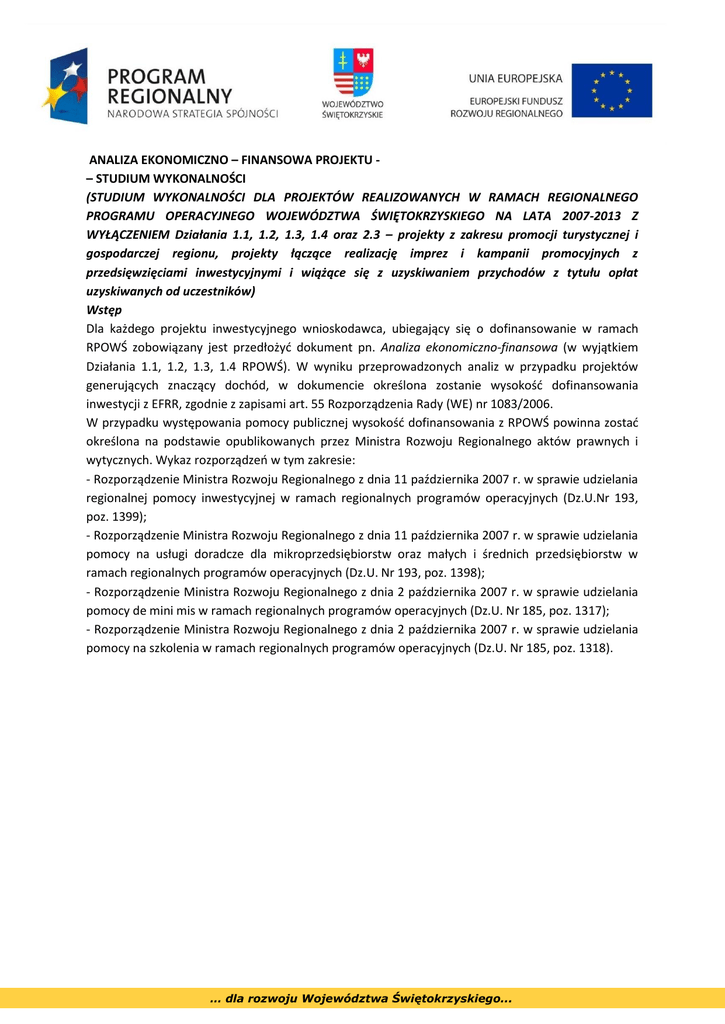 ANALIZA EKONOMICZNO – FINANSOWA PROJEKTU – STUDIUM WYKONALNOŚCI (STUDIUM WYKONALNOŚCI DLA PROJEKTÓW REALIZOWANYCH W RAMACH REGIONALNEGO PROGRAMU OPERACYJNEGO WOJEWÓDZTWA ŚWIĘTOKRZYSKIEGO NA LATA 2007-2013 Z WYŁĄCZENIEM Działania 1.1, 1.2, 1.3, 1.4 oraz 2.3 – projekty z zakresu promocji turystycznej i gospodarczej regionu, projekty łączące realizację imprez i kampanii promocyjnych z przedsięwzięciami inwestycyjnymi i wiążące się z uzyskiwaniem przychodów z tytułu opłat uzyskiwanych od uczestników) Wstęp Dla każdego projektu inwestycyjnego wnioskodawca, ubiegający się o dofinansowanie w ramach RPOWŚ zobowiązany jest przedłożyd dokument pn. Analiza ekonomiczno-finansowa (w wyjątkiem Działania 1.1, 1.2, 1.3, 1.4 RPOWŚ). W wyniku przeprowadzonych analiz w przypadku projektów generujących znaczący dochód, w dokumencie określona zostanie wysokośd dofinansowania inwestycji z EFRR, zgodnie z zapisami art. 55 Rozporządzenia Rady (WE) nr 1083/2006. W przypadku występowania pomocy publicznej wysokośd dofinansowania z RPOWŚ powinna zostad określona na podstawie opublikowanych przez Ministra Rozwoju Regionalnego aktów prawnych i wytycznych. Wykaz rozporządzeo w tym zakresie: - Rozporządzenie Ministra Rozwoju Regionalnego z dnia 11 października 2007 r. w sprawie udzielania regionalnej pomocy inwestycyjnej w ramach regionalnych programów operacyjnych (Dz.U.Nr 193, poz. 1399); - Rozporządzenie Ministra Rozwoju Regionalnego z dnia 11 października 2007 r. w sprawie udzielania pomocy na usługi doradcze dla mikroprzedsiębiorstw oraz małych i średnich przedsiębiorstw w ramach regionalnych programów operacyjnych (Dz.U. Nr 193, poz. 1398); - Rozporządzenie Ministra Rozwoju Regionalnego z dnia 2 października 2007 r. w sprawie udzielania pomocy de mini mis w ramach regionalnych programów operacyjnych (Dz.U. Nr 185, poz. 1317); - Rozporządzenie Ministra Rozwoju Regionalnego z dnia 2 października 2007 r. w sprawie udzielania pomocy na szkolenia w ramach regionalnych programów operacyjnych (Dz.U. Nr 185, poz. 1318). … dla rozwoju Województwa Świętokrzyskiego... W przypadku projektów dużych, zakres informacji przedkładanych Instytucji Zarządzającej RPOWŚ jest określony w art. 40 Rozporządzenia Rady (WE) nr 1083/2006. Przygotowując Analizę beneficjent zobowiązany jest do zapoznania się z dokumentami Komisji Europejskiej stanowiącymi wytyczne oraz wyznaczającymi metodologię przeprowadzania analiz dla projektów infrastrukturalnych. Wykaz najważniejszych dokumentów: - „Wytyczne do przygotowania inwestycji w zakresie środowiska współfinansowanych przez Fundusz Spójności i Europejski Fundusz Rozwoju Regionalnego w latach 2007-2013” opracowany w ramach Programu JASPERS (KE 01/2007); - „Wytyczne dotyczące metodologii przeprowadzania analizy kosztów i korzyści” (KE; DG Regio 08/2006); - Przewodnik Analiza Kosztów i Korzyści projektów inwestycyjnych (KE 2002); - Niebieska Księga – AKK projektów inwestycyjnych w sektorze transportu (KE 2002); - „Wytyczne Ministra Rozwoju Regionalnego w zakresie wybranych zagadnieo związanych z przygotowaniem projektów inwestycyjnych, w tym projektów generujących dochód”, - Instrukcje oceny efektywności ekonomicznej przedsięwzięd drogowych i mostowych dla dróg wojewódzkich/powiatowych/gminnych. … dla rozwoju Województwa Świętokrzyskiego... SPIS TREŚCI ANALIZY EKONOMICZNO-FINANSOWEJ: 1. TYTUŁ PROJEKTU (powinien byd możliwie krótki - do 200 znaków - zwięzły i oddający charakter projektu; powinien w jasny sposób identyfikowad Projekt i nie powielad tytułu innych Projektów realizowanych przez Beneficjenta lub przez inne podmioty; nazwa Projektu powinna zawierad przedmiot, lokalizację i etap/fazę zadania jeśli jest częścią większej inwestycji; tytuł umieszczony w niniejszym dokumencie musi byd spójny z tytułem umieszczonym we wniosku aplikacyjnym) 2. LOKALIZACJA INWESTYCJI (nie więcej niż 1 strona; wszystkie realizowane projekty inwestycyjne muszą byd zlokalizowane w granicach administracyjnych województwa świętokrzyskiego; Beneficjent w tym punkcie powinien podad powiat, miejscowośd, w której będzie realizowany projekt, ulicę przy której zlokalizowano inwestycję oraz numery działek; Beneficjent może również zawrzed inne informacje, które mogą okazad się pomocne w lokalizacji inwestycji, szczególnie istotne przedstawienie jest inwestycji na załączonych mapach sytuacyjnych; w przypadku kiedy projekt będzie realizowany na terenie kilku gmin lub powiatów należy je wówczas wymienid, dokładnie wskazując miejsce realizacji projektu) 3. KRÓTKI OPIS BENEFICJENTA (nie więcej niż 1 strona, w przypadku realizacji projektów przez podmiot reprezentujący nie więcej niż 2 strony. W przypadku projektu partnerskiego nie więcej niż 4 strony; Beneficjent obligatoryjnie powinien zawrzed następujące informacje: pełna nazwa Beneficjenta i dane teleadresowe zgodnie z odpowiednim, aktualnym dokumentem rejestrowym, status prawny Beneficjenta zgodnie z odpowiednim, aktualnym dokumentem rejestrowym, numer i nazwa aktualnego dokumentu rejestrowego, opis podmiotu reprezentującego Beneficjenta z uwzględnieniem formy prawnej i podaniem danych dotyczących dokumentu rejestrowego oraz danych teleadresowych, w przypadku partnerstwa przy realizacji projektu opis partnerów projektu odpowiadających za poszczególne elementy projektu z uwzględnieniem formy prawnej i podaniem danych dotyczących dokumentu rejestrowego oraz danych teleadresowych, w przypadku realizacji projektów przez podmiot reprezentujący lub na zasadzie partnerstwa należy zawrzed opis powiązao pomiędzy podmiotami; ponadto, Beneficjent może zawrzed inne ważne informacje np. na temat swojej historii, profilu działalności, udziału w rynku, doświadczenia w realizacji innych projektów w sektorze, w którym realizowany jest dany projekt itp.) 4. DEFINICJA CELÓW PROJ