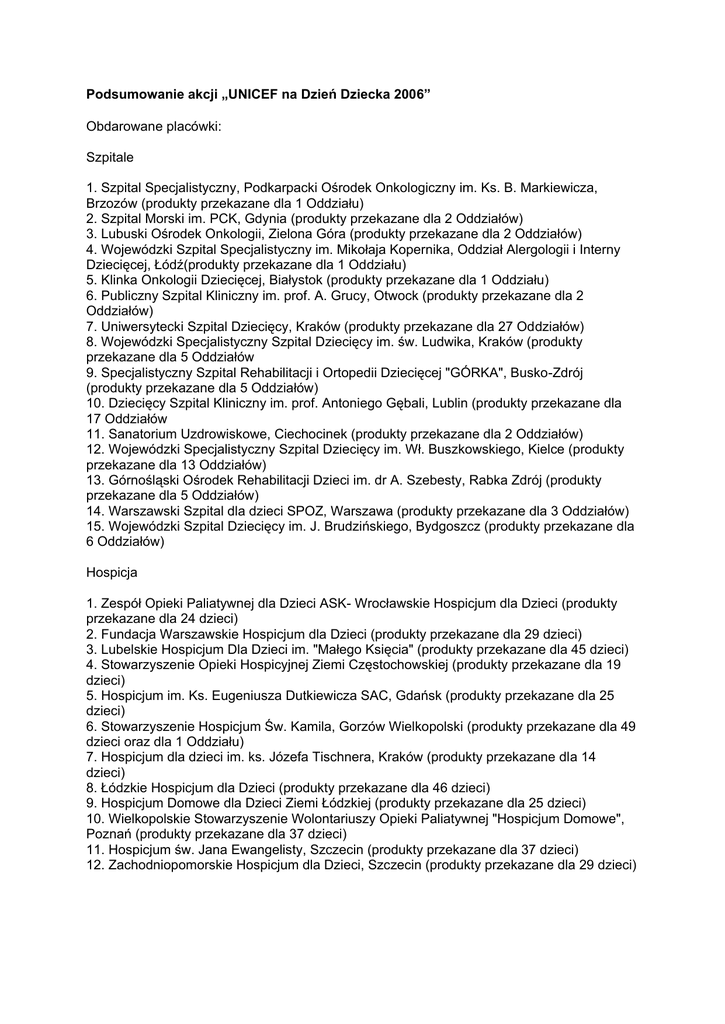 Podsumowanie akcji „UNICEF na Dzień Dziecka 2006” Obdarowane placówki: Szpitale 1. Szpital Specjalistyczny, Podkarpacki Ośrodek Onkologiczny im. Ks. B. Markiewicza, Brzozów (produkty przekazane dla 1 Oddziału) 2. Szpital Morski im. PCK, Gdynia (produkty przekazane dla 2 Oddziałów) 3. Lubuski Ośrodek Onkologii, Zielona Góra (produkty przekazane dla 2 Oddziałów) 4. Wojewódzki Szpital Specjalistyczny im. Mikołaja Kopernika, Oddział Alergologii i Interny Dziecięcej, Łódź(produkty przekazane dla 1 Oddziału) 5. Klinka Onkologii Dziecięcej, Białystok (produkty przekazane dla 1 Oddziału) 6. Publiczny Szpital Kliniczny im. prof. A. Grucy, Otwock (produkty przekazane dla 2 Oddziałów) 7. Uniwersytecki Szpital Dziecięcy, Kraków (produkty przekazane dla 27 Oddziałów) 8. Wojewódzki Specjalistyczny Szpital Dziecięcy im. św. Ludwika, Kraków (produkty przekazane dla 5 Oddziałów 9. Specjalistyczny Szpital Rehabilitacji i Ortopedii Dziecięcej "GÓRKA", Busko-Zdrój (produkty przekazane dla 5 Oddziałów) 10. Dziecięcy Szpital Kliniczny im. prof. Antoniego Gębali, Lublin (produkty przekazane dla 17 Oddziałów 11. Sanatorium Uzdrowiskowe, Ciechocinek (produkty przekazane dla 2 Oddziałów) 12. Wojewódzki Specjalistyczny Szpital Dziecięcy im. Wł. Buszkowskiego, Kielce (produkty przekazane dla 13 Oddziałów) 13. Górnośląski Ośrodek Rehabilitacji Dzieci im. dr A. Szebesty, Rabka Zdrój (produkty przekazane dla 5 Oddziałów) 14. Warszawski Szpital dla dzieci SPOZ, Warszawa (produkty przekazane dla 3 Oddziałów) 15. Wojewódzki Szpital Dziecięcy im. J. Brudzińskiego, Bydgoszcz (produkty przekazane dla 6 Oddziałów) Hospicja 1. Zespół Opieki Paliatywnej dla Dzieci ASK- Wrocławskie Hospicjum dla Dzieci (produkty przekazane dla 24 dzieci) 2. Fundacja Warszawskie Hospicjum dla Dzieci (produkty przekazane dla 29 dzieci) 3. Lubelskie Hospicjum Dla Dzieci im. "Małego Księcia" (produkty przekazane dla 45 dzieci) 4. Stowarzyszenie Opieki Hospicyjnej Ziemi Częstochowskiej (produkty przekazane dla 19 dzieci) 5. Hospicjum im. Ks. Eugeniusza Dutkiewicza SAC, Gdańsk (produkty przekazane dla 25 dzieci) 6. Stowarzyszenie Hospicjum Św. Kamila, Gorzów Wielkopolski (produkty przekazane dla 49 dzieci oraz dla 1 Oddziału) 7. Hospicjum dla dzieci im. ks. Józefa Tischnera, Kraków (produkty przekazane dla 14 dzieci) 8. Łódzkie Hospicjum dla Dzieci (produkty przekazane dla 46 dzieci) 9. Hospicjum Domowe dla Dzieci Ziemi Łódzkiej (produkty przekazane dla 25 dzieci) 10. Wielkopolskie Stowarzyszenie Wolontariuszy Opieki Paliatywnej "Hospicjum Domowe", Poznań (produkty przekazane dla 37 dzieci) 11. Hospicjum św. Jana Ewangelisty, Szczecin (produkty przekazane dla 37 dzieci) 12. Zachodniopomorskie Hospicjum dla Dzieci, Szczecin (produkty przekazane dla 29 dzieci)