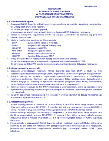Tekst jednolity REGULAMIN ROZGRYWEK PGNiG SUPERLIGI W PIŁCE RĘCZNEJ KOBIET I MĘŻCZYZN OBOWIĄZUJĄCY W SEZONIE 2011/2012 § 1. Postanowienia ogólne. 1. Rozgrywki PGNiG Superligi kobiet i mężczyzn prowadzone są zgodnie z zasadami zawartymi w: 1) „Przepisach gry w piłkę ręczną”, 2) niniejszym Regulaminie rozgrywek, oraz obowiązują w nich inne uchwały i decyzje Zarządu ZPRP dotyczące rozgrywek. 2. Ilekroć w niniejszym regulaminie używa się pojęcia „zawodnik” to rozumie się pod nim również zawodniczkę. 3. Użyte w regulaminie poniższe skróty oznaczają: - ZPRP - Związek Piłki Ręcznej w Polsce, - WZPR - Wojewódzki Związek Piłki Ręcznej, - KOL ZPRP - Kolegium Ligi ZPRP, - KSW ZPRP - Kolegium Sędziów ZPRP. - KD ZPRP - Komisja Dyscyplinarna ZPRP, - KO ZPRP - Komisja Odwoławcza ZPRP. 4. Kluby biorące udział w rozgrywkach pocztą elektroniczną lub pocztą: 1) kierują korespondencję w sprawach rozgrywek bezpośrednio do KOL ZPRP; 2) otrzymują od KOL ZPRP pocztą elektroniczną komunikaty i pisma dotyczące rozgrywek. § 2. Organ prowadzący rozgrywki. 1. Organem prowadzącym rozgrywki PGNiG Superligi jest KOL ZPRP, a kluby w nich uczestniczące bezpośrednio podlegają temu organowi w sprawach związanych z rozgrywkami. 2. Bieżące decyzje w sprawach organizacyjno-porządkowych związanych z przebiegiem rozgrywek podejmuje Komisarz Ligi, który prowadzi także postępowania dyscyplinarne i wydaje decyzje w I instancji w sprawach naruszenia przepisów przez kluby, zawodników, trenerów i pozostałe osoby towarzyszące uczestniczące w rozgrywkach. 3. Komisarz Ligi przekazuje do KD ZPRP informację o wykroczeniach, które są zagrożone karą dyskwalifikacji czasowej oraz dotyczą braku porządku na obiekcie sportowym przed, w trakcie i po zawodach. 4. KO ZPRP podejmuje rozstrzygnięcia w II instancji w wyniku odwołań od decyzji Komisarza Ligi w sprawach wymienionych w ust. 2. § 3. Uczestnicy rozgrywek. 1. PGNiG Superliga kobiet – uczestniczy 12 zespołów tj. 9 zespołów, które zajęły miejsca od I do IX w rozgrywkach sezonu 2010/2011, 2 zespoły I ligi, który w rozgrywkach sezonu 2010/2011 zajęły I miejsce w grupach A i B I ligi oraz zwycięzca barażu o PGNiG Superligę kobiet. 2. PGNiG Superliga mężczyzn - uczestniczy 12 zespołów tj. 9 zespołów, które zajęły miejsca od I do IX w rozgrywkach sezonu 2010/2011, 2 zespoły I ligi, które w rozgrywkach sezonu 2010/2011 zajęły I miejsce w grupach A i B I ligi oraz zwycięzca barażu o PGNiG Superligę mężczyzn. 3. Prawo udziału w rozgrywkach PGNiG Superligi kobiet i mężczyzn ma zespół klubu, który na co najmniej 30 dni przed ich rozpoczęciem przejął zespół klubu wycofującego się z rozgrywek, jednakże pod warunkiem uregulowania wszelkich jego zobowiązań wobec ZPRP i jego członków. 4. W rozgrywkach mogą uczestniczyć zespoły klubów będących członkami ZPRP, posiadających aktualną licencję klubową. § 4. System rozgrywek. 1. Rozgrywki prowadzone są systemem mieszanym. 2. W I i II rundzie zespoły rozgrywają zawody systemem każdy z każdym, mecz i rewanż - każdy zespół rozegra po 22 spotkania. 3. Na podstawie klasyfikacji po zakończeniu II rundy zespoły są dzielone na dwie grupy, w ramach których: 1) pierwszych 8 zespołów rozgrywa mecze o miejsca I-VIII wg systemu określonego w ust. 5; 2) pozostałe 4 zespoły rozgrywają w dwóch rundach mecze o miejsca IX-XII w klasyfikacji końcowej systemem każdy z każdym mecz i rewanż, przy czym III rundę rozgrywek rozpisuje się następująco: 23 kolejka XII-XI;IX-X, 24 kolejka X-XII;IX-XI, 25 kolejka XII-IX;XI-X, a gospodarzem spotkań są zespoły wymienione na pierwszym miejscu, natomiast w IV rundzie rozgrywek i kolejkach 26-28 gospodarzami meczów są zespoły, które w III rundzie występowały w charakterze gości. 4. Do klasyfikacji po zakończeniu II rundy rozgrywek oraz końcowej zespołów walczących o miejsca IX-XII zalicza się wyniki ze wszystkich spotkań. 5. Zespoły, o których mowa w ust. 3 pkt 1, rozgrywają zawody o miejsca w końcowej klasyfikacji jak niżej: 1) systemem play-off (z zastrzeżeniem wynikającym z pkt 5.5) przy zachowaniu poniższych zasad: a) w meczach ćwierćfinałowych do awansu do półfinałów wymagane są dwa zwycięstwa nad zespołem przeciwnym, przy czym gospodarzem pierwszego meczu jest zawsze zespół, który w klasyfikacji po II rundzie zajął wyższe miejsce, a drugiego zespół przeciwny i ewentualnie trzeciego meczu zespół będący gospodarzem pierwszego, b) w meczach na etapie półfinałów do awansu do finału wymagane są trzy zwycięstwa nad zespołem przeciwnym, przy czym gospodarzem pierwszego i drugiego meczu jest zespół, który w klasyfikacji po II rundzie rozgrywek zajął wyższe miejsce, gospodarzem trzeciego i ewentualnie czwartego meczu jest zespół przeciwny, a gospodarzem ewentualnie piątego meczu zespół będący gospodarzem pierwszych dwóch spotkań, c) w meczach finałowych bezpośrednio decydujących o I i III miejscu w tabeli końcowej rozgrywek odpowiednio tytuł Mistrza Polski lub brązowy medal zdobywa zespół, który wygrał trzy spotkania, przy czym gospodarzem pierwszego i drugiego meczu jest zespół, który w klasyfikacji po II rundzie zajął wyższe miejsce, a gospodarzem trzeciego i ewentualnie czwartego meczu zespół przeciwny, a ewentualnie piątego meczu zespół będący gospodarzem pierwszego spotkania. Zespoły, które przegrały rywalizację w meczach finałowych zajmują odpowiednio II lub IV miejsca w klasyfikacji końcowej, d) wszystkie mecze rozgrywane systemem play-off muszą zakończyć się wynikiem roztrzygniętym, e) punkty zdobyte przez zespoły uczestniczące w fazie play-off nie są brane pod uwagę w klasyfikacji końcowej, a o ostatecznej kolejności tych zespołów w rozgrywkach decydują ustalenia zawarte w niniejszym ust.; w trakcie rozgrywek o miejsca I-VIII nie sporządza się 