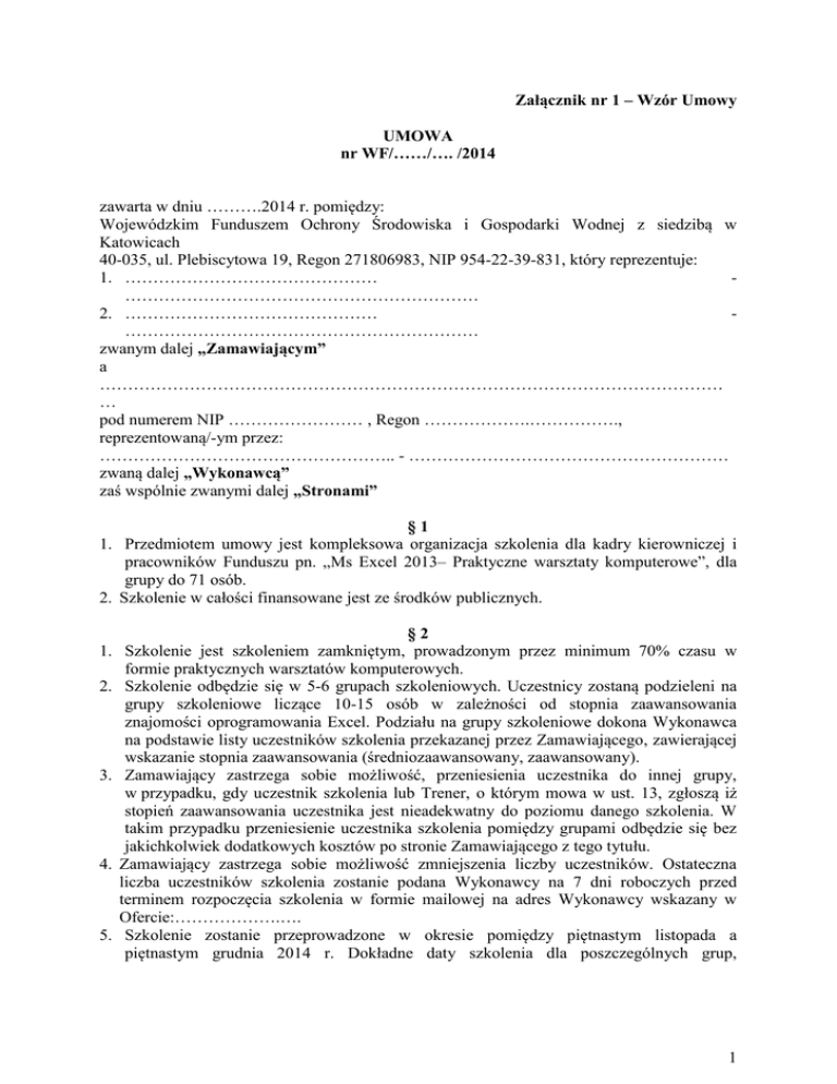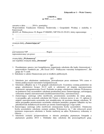 Załącznik nr 1 – Wzór Umowy UMOWA nr WF/……/…. /2014 zawarta w dniu ……….2014 r. pomiędzy: Wojewódzkim Funduszem Ochrony Środowiska i Gospodarki Wodnej z siedzibą w Katowicach 40-035, ul. Plebiscytowa 19, Regon 271806983, NIP 954-22-39-831, który reprezentuje: 1. ……………………………………… ……………………………………………………… 2. ……………………………………… ……………………………………………………… zwanym dalej „Zamawiającym” a ………………………………………………………………………………………………… … pod numerem NIP …………………… , Regon ……………….……………., reprezentowaną/-ym przez: …………………………………………….. - ………………………………………………… zwaną dalej „Wykonawcą” zaś wspólnie zwanymi dalej „Stronami” §1 1. Przedmiotem umowy jest kompleksowa organizacja szkolenia dla kadry kierowniczej i pracowników Funduszu pn. „Ms Excel 2013– Praktyczne warsztaty komputerowe”, dla grupy do 71 osób. 2. Szkolenie w całości finansowane jest ze środków publicznych. 1. 2. 3. 4. 5. §2 Szkolenie jest szkoleniem zamkniętym, prowadzonym przez minimum 70% czasu w formie praktycznych warsztatów komputerowych. Szkolenie odbędzie się w 5-6 grupach szkoleniowych. Uczestnicy zostaną podzieleni na grupy szkoleniowe liczące 10-15 osób w zależności od stopnia zaawansowania znajomości oprogramowania Excel. Podziału na grupy szkoleniowe dokona Wykonawca na podstawie listy uczestników szkolenia przekazanej przez Zamawiającego, zawierającej wskazanie stopnia zaawansowania (średniozaawansowany, zaawansowany). Zamawiający zastrzega sobie możliwość, przeniesienia uczestnika do innej grupy, w przypadku, gdy uczestnik szkolenia lub Trener, o którym mowa w ust. 13, zgłoszą iż stopień zaawansowania uczestnika jest nieadekwatny do poziomu danego szkolenia. W takim przypadku przeniesienie uczestnika szkolenia pomiędzy grupami odbędzie się bez jakichkolwiek dodatkowych kosztów po stronie Zamawiającego z tego tytułu. Zamawiający zastrzega sobie możliwość zmniejszenia liczby uczestników. Ostateczna liczba uczestników szkolenia zostanie podana Wykonawcy na 7 dni roboczych przed terminem rozpoczęcia szkolenia w formie mailowej na adres Wykonawcy wskazany w Ofercie:……………….…. Szkolenie zostanie przeprowadzone w okresie pomiędzy piętnastym listopada a piętnastym grudnia 2014 r. Dokładne daty szkolenia dla poszczególnych grup, 1 Wykonawca poda najpóźniej na 5 dni roboczych przed terminem szkolenia w formie mailowej na adres:…………………… …. 6. Szkolenie dla jednej grupy będzie trwało dwa dni. Szkolenie będzie się odbywać w dni robocze w godz. pomiędzy 9 a 15. 7. Wykonawca zapewnia na czas trwania szkolenia stanowiska z pracy z komputerami dla każdego uczestnika. Wykonawca, oświadcza, iż sprzęt komputerowy na którym prowadzone będzie szkolenie zapewnia właściwą i sprawną realizację szkolenia. 8. Wykonawca przeprowadzi szkolenie w następującym miejscu: …………………………………………………….………………………………………… ……... 9. Wykonawca oświadcza, iż ww. miejsce szkolenia dysponuje zapleczem szkoleniowokonferencyjnym, i spełnia minimum następujące warunki: - sala szkoleniowa zapewniająca dobrą widoczność na ekran (bez kolumn), wielkość sali umożliwiająca usadowienie uczestników szkolenia w sposób wygodny i komfortowy. Sala wyposażona w: sprzęt multimedialny, m.in. rzutnik, ekran, nagłośnienie; klimatyzację, internet bezprzewodowy. 10. Zamawiający dopuszcza możliwość zmiany miejsca szkolenia, pod warunkiem, iż będzie to ośrodek dysponujący zapleczem szkoleniowo-konferencyjnym, zlokalizowany w Katowicach i spełniający wszystkie wymogi opisane w ust. 9. Zmiana taka, nastąpić może jedynie na pisemny wniosek Wykonawcy złożony nie później niż na 7 dni roboczych przed terminem szkolenia dla danej grupy. Zmiana taka, nie wymaga zmiany postanowień niniejszej Umowy. 11. Wykonawca w ramach szkolenia, zapewnia w każdym dniu szkoleniowym poczęstunek dla uczestników: 1 bufet kawowy dziennie, obejmujący kawę, herbatę, wodę gazowaną i niegazowaną, soki (100%) w butelkach o pojemności max. 0.5 l. lub w dzbankach, ciastka, owoce, kanapki – min. 3 szt./os. Poczęstunek serwowany będzie wyłącznie przy użyciu szklanych naczyń. 12. Wykonawca zobowiązany jest przygotować agendę szkolenia i przedstawić ją Zamawiającemu nie później niż na 5 dni przed rozpoczęciem szkolenia dla pierwszej grupy szkoleniowej drogą mailową na adres wskazany w Ofercie Wykonawcy. 13. Wykonawca przeprowadzi szkolenie przy pomocy Trenera/ów wskazanego/ych w Ofercie Wykonawcy, t.j.: …………………………………………………………… który/rzy posiada/ją doświadczenie w przeprowadzaniu szkoleń i praktycznych warsztatów, z obsługi programu Excel (minimum 5 szkoleń z obsługi programu Excel przeprowadzonych w ciągu ostatnich 3 lat). 14. Zamawiający dopuszcza możliwość zmiany Trenera/ów, pod warunkiem posiadania przez nowego/ych Trenera/ów co najmniej kwalifikacji opisanych w ust.13. Zmiana taka, nastąpić może jedynie na pisemny wniosek Wykonawcy i nie wymaga zmiany postanowień niniejszej Umowy. 15. Wykonawca wystawi każdemu z uczestników szkolenia stosowne zaświadczenie / certyfikat o ukończonym szkoleniu. 16. Wykonawca zapewni w trakcie trwania szkolenia obsługę organizatorską. 17. Po zrealizowaniu szkolenia dla każdej z grup, Wykonawca przedstawi protokół, zawierający co najmniej: datę odbycia szkolenia, imię i nazwisko Trenera, listę obecności uczestników, którzy faktycznie wzięli udział w szkoleniu oraz ewentualne uwagi co do przebiegu szkolenia. Ww. dokumenty, będą stanowiły