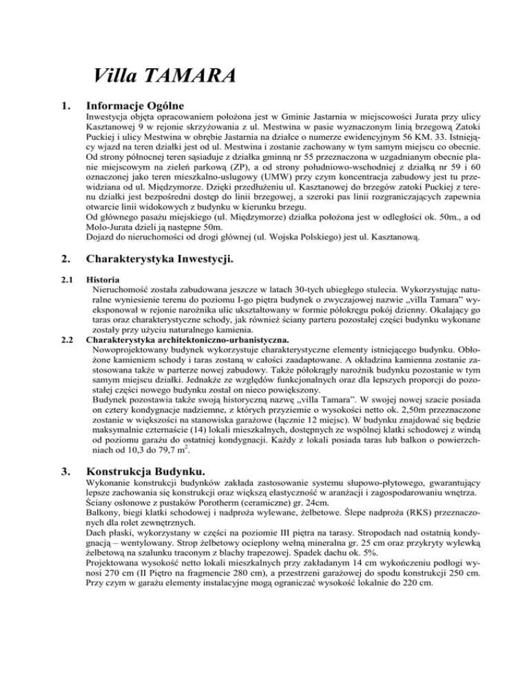 Villa TAMARA 1. Informacje Ogólne Inwestycja objęta opracowaniem połoŜona jest w Gminie Jastarnia w miejscowości Jurata przy ulicy Kasztanowej 9 w rejonie skrzyŜowania z ul. Mestwina w pasie wyznaczonym linią brzegową Zatoki Puckiej i ulicy Mestwina w obrębie Jastarnia na działce o numerze ewidencyjnym 56 KM. 33. Istniejący wjazd na teren działki jest od ul. Mestwina i zostanie zachowany w tym samym miejscu co obecnie. Od strony północnej teren sąsiaduje z działka gminną nr 55 przeznaczona w uzgadnianym obecnie planie miejscowym na zieleń parkową (ZP), a od strony południowo-wschodniej z działką nr 59 i 60 oznaczonej jako teren mieszkalno-uslugowy (UMW) przy czym koncentracja zabudowy jest tu przewidziana od ul. Międzymorze. Dzięki przedłuŜeniu ul. Kasztanowej do brzegów zatoki Puckiej z terenu działki jest bezpośredni dostęp do linii brzegowej, a szeroki pas linii rozgraniczających zapewnia otwarcie linii widokowych z budynku w kierunku brzegu. Od głównego pasaŜu miejskiego (ul. Międzymorze) działka połoŜona jest w odległości ok. 50m., a od Molo-Jurata dzieli ją następne 50m. Dojazd do nieruchomości od drogi głównej (ul. Wojska Polskiego) jest ul. Kasztanową. 2. Charakterystyka Inwestycji. 2.1 Historia Nieruchomość została zabudowana jeszcze w latach 30-tych ubiegłego stulecia. Wykorzystując naturalne wyniesienie terenu do poziomu I-go piętra budynek o zwyczajowej nazwie „villa Tamara” wyeksponował w rejonie naroŜnika ulic ukształtowany w formie półokręgu pokój dzienny. Okalający go taras oraz charakterystyczne schody, jak równieŜ ściany parteru pozostałej części budynku wykonane zostały przy uŜyciu naturalnego kamienia. Charakterystyka architektoniczno-urbanistyczna. Nowoprojektowany budynek wykorzystuje charakterystyczne elementy istniejącego budynku. ObłoŜone kamieniem schody i taras zostaną w całości zaadaptowane. A okładzina kamienna zostanie zastosowana takŜe w parterze nowej zabudowy. TakŜe półokrągły naroŜnik budynku pozostanie w tym samym miejscu działki. JednakŜe ze względów funkcjonalnych oraz dla lepszych proporcji do pozostałej części nowego budynku został on nieco powiększony. Budynek pozostawia takŜe swoją historyczną nazwę „villa Tamara”. W swojej nowej szacie posiada on cztery kondygnacje nadziemne, z których przyziemie o wysokości netto ok. 2,50m przeznaczone zostanie w większości na stanowiska garaŜowe (łącznie 12 miejsc). W budynku znajdować się będzie maksymalnie czternaście (14) lokali mieszkalnych, dostępnych ze wspólnej klatki schodowej z windą od poziomu garaŜu do ostatniej kondygnacji. KaŜdy z lokali posiada taras lub balkon o powierzchniach od 10,3 do 79,7 m2. 2.2 3. Konstrukcja Budynku. Wykonanie konstrukcji budynków zakłada zastosowanie systemu słupowo-płytowego, gwarantujący lepsze zachowania się konstrukcji oraz większą elastyczność w aranŜacji i zagospodarowaniu wnętrza. Ściany osłonowe z pustaków Porotherm (ceramiczne) gr. 24cm. Balkony, biegi klatki schodowej i nadproŜa wylewane, Ŝelbetowe. Ślepe nadproŜa (RKS) przeznaczonych dla rolet zewnętrznych. Dach płaski, wykorzystany w części na poziomie III piętra na tarasy. Stropodach nad ostatnią kondygnacją – wentylowany. Strop Ŝelbetowy ocieplony wełną mineralna gr. 25 cm oraz przykryty wylewką Ŝelbetową na szalunku traconym z blachy trapezowej. Spadek dachu ok. 5%. Projektowana wysokość netto lokali mieszkalnych przy zakładanym 14 cm wykończeniu podłogi wynosi 270 cm (II Piętro na fragmencie 280 cm), a przestrzeni garaŜowej do spodu konstrukcji 250 cm. Przy czym w garaŜu elementy instalacyjne mogą ograniczać wysokość lokalnie do 220 cm. 2 4. Wykończenie. 4.1 Wykończenie zewnętrzne. • Ściany w strefie cokołowej i przyziemia z okładziny kamiennej jak na budynku istniejącym. • Ściany pięter wykończone wyprawą lekką suchą, akrylową. • Okładzina z drewna impregnowanego IROCA lub BANKIRAI na ścianach III piętra i tarasów. • Balkony wykończone terakotą mrozoodporną. • Tarasy na III-cim piętrze wykończone gretingiem z drewna impregnowanego – Daldecor-Soprema. • Stolarka okienna i drzwiowa – aluminiowa ze szkleniem zespolonym o współczynniku k= 1,1 w kolorze szarym (RAL 7045 mat). • Rolety zewnętrzne aluminiowe chowane w „ślepych” nadproŜach. Kolor szary (RAL 9006). • Markizy – f-my DRAGON, operowane elektrycznie przy lokalach M1, M2, M7, M8, M13 i M14. • Balustrady z konstrukcją oraz relingami ze stali nierdzewnej z wypełnieniem szklanym. • Elementy nastopnic, podestów schodów wejściowych zewnętrznych oraz tarasu naziemnego na poziomie I-go Piętra z granitu w kolorze szaro-Ŝołtym (np. Ŝółty Yellow-Pink młotkowany). • Brama wjazdowa do garaŜu segmentowa, otwierana automatycznie. Wykończenie wewnętrzne części wspólnych i ogólnodostępnych. • Tynki wewnętrzne w pomieszczeniach przyziemia kat. III cem.wapienne. • Tynki wewnętrzne gipsowe w klatce schodowej. Malowanie farbą akrylową w kolorze beŜ. • Klamki i szyldy nierdzewne. Samozamykacze w drzwiach wejściowych przesionka oraz wejścia do garaŜu i z garaŜu na klatkę schodową. Zamki w systemie Master Key (klasa „C”). • Parapety kamienne z granitu gr. 3 cm (santa Cecylia lub podobny). • Wykończenie korytarzy oraz podestów, podstopnic klatki schodowej z płyt granitowych gr. 1,5cm, nastopnice ze slabów granitowych gr. 3 cm (santa Cecylia lub podobny). • Balustrady klatki schodowej ze stali nierdzewnej z wypełnieniem ze szkła hartowanego. Wykończenie wewnętrzne lokali mieszkalnych. • Tynki wewnętrzne gipsowe kat. III w pomieszczeniach mieszkalnych. • Marmur (Breccia) na ścianach i fragmentach podłóg w pomieszczeniach łazienek i WC. • Podłogi wykończone terakotą (granitogres) we wszystkich kuchniach i łazienkach oraz pokojach dziennych, przedpokojach i garderobach. • Listwy przypod