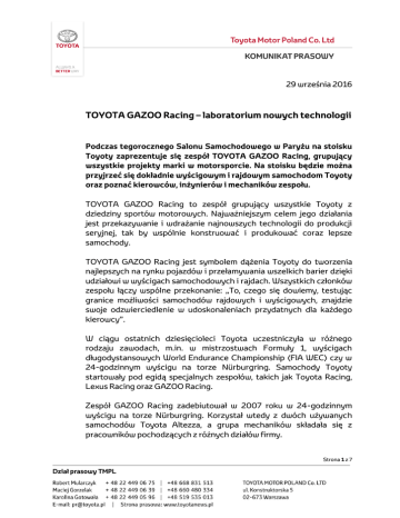 29 września 2016 TOYOTA GAZOO Racing – laboratorium nowych technologii Podczas tegorocznego Salonu Samochodowego w Paryżu na stoisku Toyoty zaprezentuje się zespół TOYOTA GAZOO Racing, grupujący wszystkie projekty marki w motorsporcie. Na stoisku będzie można przyjrzeć się dokładnie wyścigowym i rajdowym samochodom Toyoty oraz poznać kierowców, inżynierów i mechaników zespołu. TOYOTA GAZOO Racing to zespół grupujący wszystkie Toyoty z dziedziny sportów motorowych. Najważniejszym celem jego działania jest przekazywanie i wdrażanie najnowszych technologii do produkcji seryjnej, tak by wspólnie konstruować i produkować coraz lepsze samochody. TOYOTA GAZOO Racing jest symbolem dążenia Toyoty do tworzenia najlepszych na rynku pojazdów i przełamywania wszelkich barier dzięki udziałowi w wyścigach samochodowych i rajdach. Wszystkich członków zespołu łączy wspólne przekonanie: „To, czego się dowiemy, testując granice możliwości samochodów rajdowych i wyścigowych, znajdzie swoje odzwierciedlenie w udoskonaleniach przydatnych dla każdego kierowcy”. W ciągu ostatnich dziesięcioleci Toyota uczestniczyła w różnego rodzaju zawodach, m.in. w mistrzostwach Formuły 1, wyścigach długodystansowych World Endurance Championship (FIA WEC) czy w 24-godzinnym wyścigu na torze Nürburgring. Samochody Toyoty startowały pod egidą specjalnych zespołów, takich jak Toyota Racing, Lexus Racing oraz GAZOO Racing. Zespół GAZOO Racing zadebiutował w 2007 roku w 24-godzinnym wyścigu na torze Nürburgring. Korzystał wtedy z dwóch używanych samochodów Toyota Altezza, a grupa mechaników składała się z pracowników pochodzących z różnych działów firmy. Strona 1 z 7 Sposób, w jaki skompletowano pierwszy zespół GAZOO, był zgodny z filozofią założyciela przedsiębiorstwa, Kiichiro Toyody, który już w 1952 roku powiedział: „Motorsport to coś więcej niż tylko rozrywka. To kluczowy element rozwoju branży motoryzacyjnej. Podobnie jak sportowcy nie szczędząc sił sprawdzają swoje możliwości na igrzyskach olimpijskich, tak producenci samochodów podczas wyścigów mają okazję zbliżyć się do granic osiągów auta, walcząc o zajęcie pierwszego miejsca i przy okazji poznając nowe obszary, w których można udoskonalić rozwiązania techniczne”. Toyota postanowiła wrócić do tej koncepcji, dlatego od kwietnia 2015 roku wszystkie działania firmy w obszarze sportów samochodowych zostały zebrane pod marką TOYOTA GAZOO Racing. Dzięki udziałowi w zawodach Toyota nieustannie udoskonala swoje technologie, co przekłada się na jakość aut dostępnych na rynku. Dzięki doświadczeniu zdobytemu podczas prac nad budową napędów hybrydowych w samochodach wyścigowych TS030 i TS040 HYBRID klasy LMP1 udało się poczynić znaczne postępy w konstrukcji hybrydowych napędów w autach produkcyjnych, na przykład zmniejszyć rozmiary poszczególnych elementów i usprawnić chłodzenie silnika. Inżynierowie Toyoty poszerzyli swoją wiedzę, wkraczając w niestandardowe dla nich obszary. Doświadczenie zdobyte w motorsporcie pozwoliło rozwinąć kompetencje projektantów, inżynierów i mechaników. To jednak nie wszystkie korzyści. Sport to także dziedzina, w której Toyota ma okazję podzielić się z klientami i fanami marki emocjami związanymi z prowadzeniem samochodu, zgodnie z dewizą Akio Toyody, że samochód powinien dawać prawdziwą radość z jazdy. W 2017 roku Toyota wraca do serii World Rally Championship. Zespół TOYOTA GAZOO Racing weźmie udział w kolejnych prestiżowych mistrzostwach, w których auta będą docierać do granic swoich możliwości. Strona 2 z 7 TOYOTA GAZOO RACING W EUROPIE FIA World Endurance Championship (WEC) Mistrzostwa świata w wyścigach długodystansowych FIA to seria co najmniej sześciogodzinnych wyścigów organizowanych na prestiżowych torach wyścigowych w Europie, Stanach Zjednoczonych i Azji. Najbardziej znany jest 24-godzinny wyścig w Le Mans, należący do tzw. potrójnej korony sportów motorowych i jednocześnie będący najważniejszym wydarzeniem wśród wyścigów typu endurance. TOYOTA startowała w Le Mans osiemnastokrotnie, począwszy od 1985 roku. Zespół był o krok od zwycięstwa w tegorocznych zawodach. Udział w wyścigu Le Mans wymaga wyjątkowej szybkości i niezawodności, a zespół TOYOTA GAZOO Racing chce sprostać temu wyzwaniu, wciąż pracując nad udoskonaleniem hybrydowego układu napędowego z wykorzystaniem najnowocześniejszych technologii. 1000-konny napęd został opracowany przez inżynierów Toyoty, którzy uczestniczyli w wyścigu w funkcji wsparcia technicznego. W skład zespołu wchodzą osoby w różnym wieku i z różnym doświadczeniem, wszyscy jednak dążą do realizacji wspólnego celu, czyli budowania coraz doskonalszych samochodów. 24-godzinny wyścig na torze Nürburgring Co roku fabryczne i prywatne zespoły z całego świata biorą udział w 24godzinnym wyścigu na niemieckim torze Nürburgring, uważanym za najtrudniejszy na świecie. W tym roku zespół TOYOTA GAZOO Racing wystartował w nim po raz dziesiąty, zgłaszając do zawodów Lexusa RC, Lexusa RC F oraz koncepcyjną Toyotę C-HR Racing. Toyota C-HR Racing zajęła trzecie miejsce w swojej klasie, natomiast Lexus RC F zajął 24. miejsce w klasyfikacji generalnej i okazał się najlepszy w swojej klasie. Lexus RC musiał wycofać się z wyścigu z powodu problemów z układem napędowym. Wyścig na torze Nürburgring umożliwia Toyocie dalszy rozwój kwalifikacji personelu dzięki zaangażowaniu mechaników, inżynierów i kierowców testowych zatrudnionych w działach zajmujących się pojazdami produkcyjnymi. Cel uczestnictwa Toyoty i jej luksusowej marki Lexus w wyścigu jest taki sam, jak dziesięć lat temu: sprawdzenie Strona 3 z 7 najszybszych samochodów obu marek w zawodach o dużym stopniu trudności i wykorzystanie zdobytych doświadczeń w autach seryjnych