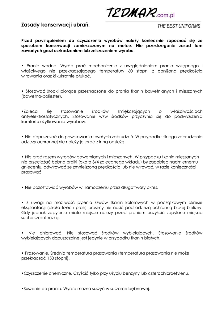 Zasady konserwacji ubrań. Przed przystąpieniem do czyszczenia wyrobów należy koniecznie zapoznać się ze sposobem konserwacji zamieszczonym na metce. Nie przestrzeganie zasad tam zawartych grozi uszkodzeniem lub zniszczeniem wyrobu. • Pranie wodne. Wyrób prać mechanicznie z uwzględnieniem prania wstępnego i właściwego nie przekraczającego temperatury 60 stopni z obniżona prędkością wirowania oraz kilkukrotnie płukać. • Stosować środki piorące przeznaczone do prania tkanin bawełnianych i mieszanych (bawełna-poliester). •Zaleca się stosowanie środków zmiękczających o właściwościach antyelektrostatycznych. Stosowanie w/w środków przyczynia się do podwyższenia komfortu użytkowania wyrobów. • Nie dopuszczać do powstawania trwałych zabrudzeń. W przypadku silnego zabrudzenia odzieży ochronnej nie należy jej prać z inną odzieżą. • Nie prać razem wyrobów bawełnianych i mieszanych. W przypadku tkanin mieszanych nie przeciążać bębna pralki (około 3/4 zalecanego wkładu) by zapobiec nadmiernemu gnieceniu, odwirować ze zmniejszoną prędkością lub nie wirować, w razie konieczności prasować. • Nie pozostawiać wyrobów w namoczeniu przez długotrwały okres. • Z uwagi na możliwość pylenia szwów tkanin kolorowych w początkowym okresie eksploatacji (około trzech prań) prosimy nie nosić pod odzieżą ochronną białej bielizny. Gdy jednak zapylenie miało miejsce należy przed praniem oczyścić zapylone miejsca sucha szczoteczką. • Nie chlorować. Nie stosować środków wybielających. Stosowanie wybielających dopuszczalne jest jedynie w przypadku tkanin białych. środków • Prasowanie. Średnia temperatura prasowania (temperatura prasowania nie może przekraczać 150 stopni). •Czyszczenie chemiczne. Czyścić tylko przy użyciu benzyny lub czterochloroetylenu. •Suszenie po praniu. Wyrób można suszyć w suszarce bębnowej.