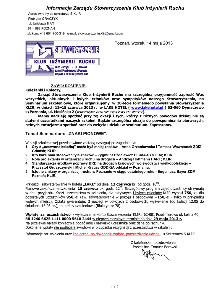 IInformacja Zarządu Stowarzyszenia Klub Inżynierii Ruchu AAdres zwrotny do sekretarza S-KLIR: PPiotr Jan GRACZYK Uul. Unisława 8 A/1 661 – 063 POZNAŃ ttel. kom. +48 601-700-319 e-mail: [email protected] I Poznań, wtorek, 14 maja 2013 ZAWIADOMIENIE Koleżanki i Koledzy, Zarząd Stowarzyszenia Klub Inżynierii Ruchu ma szczególną przyjemność zaprosić Was wszystkich, aktualnych i byłych członków oraz sympatyków naszego Stowarzyszenia, na Seminarium szkoleniowe, które organizujemy, w 20-lecie formalnego powstania Stowarzyszenia KLIR, w dniach 12–15 czerwca 2013 r. w LAKE HOTEL ( www.lakehotel.pl ) 62-060 Dymaczewo k/Poznania, ul. Mosińska 2 (współrzędne GPS: 52° 14' 35" N i 16° 45' 9" E). Mamy nadzieję spotkać przy tej okazji i tych, którzy z różnych powodów dzisiaj nie są stałymi uczestnikami naszych szkoleń. Będzie szczególna okazja do powspominania pierwszych, pełnych entuzjazmu spotkań oraz do wzięcia udziału w seminarium. Zapraszamy. Temat Seminarium: „ZNAKI PIONOWE”. W sesji szkoleniowej przedstawione zostaną następujące zagadnienia: 1. Czy z „czerwoną książką” może być mniej znaków – Anna Grzonkowska i Tomasz Wawrzonek ZDiZ Gdańsk; KLIR . 2. Kto każe nam stosować tyle znaków – Zygmunt Użdalewicz SIGMA-SYSTEM; KLIR. 3. Rola projektanta w organizacji ruchu na drogach – Andrzej Hoffmann HART; KLIR. 4. Standaryzacja środków poprawy BRD na drogach krajowych województwa wielkopolskiego – Krzysztof Gruszczyński i Michał Krauze GDDKiA oddział w Poznaniu. 5. Istotne zmiany w organizacji ruchu w Poznaniu w ciągu ostatniego roku - Eugeniusz Bayer ZDM Poznań; KLIR. Przyjazd i zakwaterowanie w hotelu „LAKE” od dnia 12 czerwca br. od godz. 1600. Planowe zakończenie szkolenia 15 czerwca ok. godz. 1200. Szczegółowy program zajęć uczestnicy otrzymają w dniu przyjazdu. Koszt uczestnictwa w szkoleniu, dla aktywnych i byłych członków KLIR wynosi 750,-zł, dla pozostałych uczestników 950,-zł (ew. zakwaterowanie w pokoju 1 osobowym +150,-zł - tylko w przypadku wolnych miejsc). Opłata gwarantuje: 3 noclegi w pokojach 2 osobowych, wyżywienie (od kolacji 12.05 do śniadania 15.05.br.), materiały szkoleniowe (Biuletyn nr 78). Wpłaty za uczestnictwo - wyłącznie na konto Stowarzyszenia KLIR, 62-081 Przeźmierowo ul. Leśna 40, 68 1240 6625 1111 0000 5610 2444 w nieprzekraczalnym terminie do dnia 29 maja 2013 r. Na przelewie należy koniecznie podać imię i nazwisko uczestnika oraz dane do rachunku. Dokonane wpłaty nie podlegają zwrotowi w przypadku rezygnacji z uczestnictwa w szkoleniu. Informacje n/t szkolenia oraz konieczne, po dokonaniu wpłaty, potwierdzenie udziału: u Sekretarza S-KLIR. Z koleżeńskim pozdrowieniem Prezes inż. Tomasz Borowski 1z2 IInformacja Zarządu Stowarzyszenia Klub Inżynierii Ruchu AAdres zwrotny do sekretarza S-KLIR: PPiotr Jan GRACZYK Uul. Unisława 8 A/1 661 – 063 POZNAŃ ttel. kom. +48 601-700-319 e-mail: [email protected] 2z2