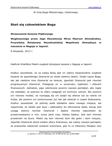 www.alislam.pl Streszczenie Kazania Piątkowego W Imię Boga Miłosiernego, Litościwego. Stań się człowiekiem Boga Streszczenie Kazania Piątkowego Wygłoszonego przez Jego Ekscelencja Mirza Masroor Ahmad(aba), Przywódcę Światowej Muzułmańskiej Wspólnoty Ahmadiyya w meczecie w Nagoja w Japonii. 8 listopada, 2013 r. Hadhrat Khalifatul Masih wygłosił dzisiejsze kazanie z Nagoja w Japonii. Hudhur powiedział, Ŝe za Łaską BoŜą jest on zdolny bezpośrednio wygłosić kazanie do japońskiego DŜama'at po około siedmiu latach. Dzięki Łasce Boga, tak jak niektóre inne DŜama’at na świecie, japoński DŜama’at jest równieŜ progresywnym DŜama’at. Postępuje on w szczerości, lojalności i ofiarach finansowych. JednakŜe, jego członkowie powinni zawsze pamiętać, aby nigdy nie zakładać, Ŝe poprzez te ofiary osiągnęli oni końcowy sukces. Nie powinni oni równieŜ myśleć, Ŝe rozwijają się oni dzięki tej ofierze lub Ŝe rośnie ich liczba, ale powinni oni kontynuować Ŝyć tak jak obiecali w czasie ślubowania. Hudhur powiedział, Ŝe później poda dokładne dane nowego miejsca, ale wspomniał, Ŝe obiekt jest duŜy i adekwatny do oferowania Salat, biorąc pod uwagę obecny rozmiar DŜama'at i będzie równieŜ odpowiedni do przeprowadzania w nim, przez jakiś czas, DŜelsa Salana. Jest tam równieŜ przestrzeń na biura. Mieści się tam równieŜ dom dla gości i dom misyjny. Japoński DŜama'at złoŜył wielkie ofiary finansowe, ale naleŜy zawsze pamiętać, Ŝe prawowita naleŜność zostanie wykonana, gdy to co Obiecany Mesjasz (as) Stowarzyszenie Muzułmańskie Ahmadiyya ul. Dymna 17, 02-411 Warszawa, tel. 22 863 88 92, fax. 22 863 8893 1/13 www.alislam.pl Streszczenie Kazania Piątkowego przekazał nam, co jest istotne dla prawdziwego muzułmanina, będzie rozpatrzone i wdroŜone w praktykę. Bezwątpienia poświęcenia i działania wynikające z powodu krótkotrwałego entuzjazmu czasami skłaniają człowieka ku poboŜności. Jeśli są one czynione w imię Boga, to człowiek jest obdarzony Łaską BoŜą. Jednak cele tych z nas, którzy przyjęli bai`at Obiecanego Mesjasza (as), zostaną spełnione w prawdziwym sensie, gdy będziemy starać się, by uczynić kaŜdy z naszych aktów zgodnym z bai`at w poszukiwaniu zadowolenia Boga i będziemy utrzymywać na uwadze cel DŜama'at Ahmadiyya. Obiecany Mesjasz (as) powiedział: ,,Doskonałości te moŜna znaleźć w Prorokach (pokój nich będzie z nimi) i jest to oświadczone w: drogą tych, których obsypałeś dobrodziejstwami (...) (01:07) Osiągnięcie tego jest prawdziwym celem kaŜdego człowieka. W szczególności nasze DŜama'at powinno na to zwrócić uwagę, poniewaŜ Allah WywyŜszony pragnął, aby poprzez ustanowienie tej Społeczności przygotować Wspólnotę taką jak ta, która została przygotowana przez Proroka (saw). Dlatego teŜ ona moŜe stać się świadectwem prawdziwości i wielkości Koranu i Proroka (saw). Obiecany Mesjasz (as) połoŜył na nas ogromną odpowiedzialność osiągnięcia tych celów, które starali się osiągnąć Towarzysze Proroka (pokój i błogosławieństwo Allaha nich będą z nimi). Oni to nieprzerwanie ofiarowywali swoje Ŝycie, mienie i czas iraz wywiązywali się ze swych obowiązków wobec Boga, wykazując jednocześnie bojaźń BoŜą. Błagali oni Boga i nigdy nie byli dumni z ponoszonych przez siebie ofiar, a raczej modlili się, aby ich wysiłki były zaakceptowane. TakŜe poziom ich czci Boga był tak podwyŜszony, Ŝe budzili się oni w nocy i nigdy nie zaniedbywali pamiętania o Bogu takŜe w ciągu Stowarzyszenie Muzułmańskie Ahmadiyya ul. Dymna 17, 02-411 Warszawa, tel. 22 863 88 92, fax. 22 863 8893 2/13 www.alislam.pl Streszczenie Kazania Piątkowego dnia, pomimo ich zajęć- handlu i rzemiosła. To jest cel, który kaŜdy z nas musi osiągnąć, o którym Koran mówi, Ŝe kiedy ten cel jest osiągnięty to cel naszego stworzenia zostaje osiągnięty. To rzeczywiście powinno być naszym celem, gdy budujemy meczety lub kiedy zakupujemy miejsca, aby czcić Boga. Ziemskie cele mają limity i po dotarciu do pewnego punktu, człowiek jest zadowolony z poczucia osiągnięcia i ujrzenia wyników swoich starań. Jednak z kultem Boga jest tak, Ŝe coraz to nowsze i nowsze drzwi otwierają się do bliskości Boga, a następnie jest nagroda po śmierci, w Ŝyciu przyszłym, gdzie człowiek rozwija się dzięki bezgranicznej Łasce BoŜej a otrzymane błogosławieństwa są poza granicami wyobraźni. To jest pogląd, z którym Towarzysze rozwijali się, a tym samym osiągnęli tytuł ,,Niech Allah będzie z nich zadowolony." To jest rodzaj duchowego postępu, jaki Obiecany Mesjasz (as) chciał widzieć u ludzi w swoim DŜama'at gdzie ich pozycja będzie podniesiona, a błogosławieństwa dla nich będą kontynuowane. Powiedział on, Ŝe chce, aby ludzie w jego DŜama'at dawali świadectwo wielkości Koranu i Proroka (saw). Czy wielkość Koranu moŜe być udowodniona poprzez nasze świadectwo? Czy wielkość Proroka (saw), ostatniego Proroka, najbardziej umiłowanego przez Boga, jest zgodna z naszymi praktykami? Nie, nie jest. Co Obiecany Mesjasz (as) miał na myśli to, to, Ŝe powinna nastąpić w naszych praktykach rewolucyjna zmiana i Ŝe poprzez działanie zgodne z nauczaniem Koranu i błogosławionym wzorem Proroka (saw) powinniśmy sprawić, Ŝe będzie to oczywiste dla świata, Ŝe jesteśmy ludźmi, wśród których zaszła rewolucyjna zmian pod wpływem Koranu i Sunny. Jest to moŜliwe do uzyskania poprzez wywiązywanie się z obowiązków wobec Boga i utrzymywanie wysokich standardów Jego czci oraz poprzez wywiązywanie się z obowiązków wobec ludzkości. Hadhrat Khalifatul Masih powiedział, Ŝe otrzymał informacje, Ŝe nasz japoński przyjaciel, prawnik, który nie jest muzułmaninem, wsparł bezinteresownie i pomógł w róŜnych etapach realizacji oraz w ominięciu przeszkód podczas Stowarzyszenie Muzułmańskie Ahmadiyya 