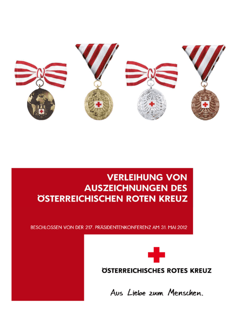 „Verleihung von Auszeichnungen des Österreichischen Roten Kreuzes“ beschlossen von der 181. Präsidentenkonferenz am 13. Juni 2003 mit den Änderungen der 192. Präsidentenkonferenz am 9. März 2006 mit den Änderungen der 217. Präsidentenkonferenz am 31. Mai 2012 Zugunsten der besseren Lesbarkeit wurde im Text auf die gleichzeitige Verwendung weiblicher und männlicher Personenbegriffe verzichtet. Gemeint und angesprochen sind natürlich immer beide Geschlechter (siehe auch ÖRK-Satzungen, §23). „Verleihung von Auszeichnungen des Österreichischen Roten Kreuz“, Seite 2 von 20; 31. Mai 2012 Inhalt 1 Richtlinie für die Verleihung von Verdienstkreuzen des Österreichischen Roten Kreuzes ... 4 1.1 Anträge auf Verleihung von Verdienstkreuzen des Österreichischen Roten Kreuzes ........ 4 2 Richtlinie für die Verleihung von Verdienstmedaillen des Österreichischen Roten Kreuzes 6 2.1 Anträge auf Verleihung von Verdienstmedaillen des Österreichischen Roten Kreuzes .... 7 3 Richtlinie für die Verleihung der Verdienstmedaille für Katastropheneinsätze und Entwicklungszusammenarbeit des Österreichischen Roten Kreuzes ................................................ 8 4 Richtlinie für die Verleihung der Verdienstmedaille des Österreichischen Roten Kreuzes für besondere Verdienste um das Blutspendewesen .............................................................................. 10 4.1 Anträge auf Verleihung der Verdienstmedaille des Österreichischen Roten Kreuzes für Verdienste um das Blutspendewesen ............................................................................................................11 5 Richtlinie für die Verleihung der Rotkreuzfahrtenspange ..................................................................... 13 6 Richtlinie für die Verleihung des Dienstjahrabzeichen des Österreichischen Roten Kreuzes ............................................................................................................................................................................................... 15 7 Richtlinie für die Verleihung der Brosche für freiwillige HelferInnen .............................................. 16 8 Richtlinie für die Verleihung der Brosche für PflegehelferInnen ........................................................ 16 9 Richtlinie für die Verleihung der Rotkreuz-Stundenspange ..................................................................17 10 Richtlinie für die Verleihung von Ehrenzeichen für Firmen und Organisationen..................... 19 10.1 Anträge auf Verleihung des Ehrenzeichens des Österreichischen Roten Kreuzes .......... 19 10.2 Beschreibung des Ehrenzeichen des Österreichischen Roten Kreuzes für Firmen und Organisationen ..................................................................................................................................................... 19 10.3 Verleihung des Ehrenzeichens des Österreichischen Roten Kreuzes ..................................... 20 Die Vorschriften des Österreichischen Roten Kreuzes finden sich im Internet unter http://vorschriften.roteskreuz.at „Verleihung von Auszeichnungen des Österreichischen Roten Kreuz“, Seite 3 von 20; 31. Mai 2012 1 Richtlinie für die Verleihung von Verdienstkreuzen des Österreichischen Roten Kreuzes (Angenommen in der 77. Sitzung des Arbeitsausschusses am 13.12.1969; abgeändert durch den Beschluß der 78. Sitzung des Arbeitsausschusses vom 21.3.1970 und der 97. Sitzung des Arbeitsausschusses vom 2.9.1977) §1 1. Besondere Verdienste um das Rote Kreuz werden durch die Verleihung nachstehender Auszeichnungen gewürdigt: "Verdienstkreuz I. Klasse" "Verdienstkreuz" 2. Beide Auszeichnungen bestehen aus einem weiß bordierten Balkenkreuz, 52 mm hoch und breit, das Verdienstkreuz in versilberter Ausführung. Die Vorderseite ist rot emailliert. In der Mitte des Kreuzes ist das schwarz emaillierte österreichische Staatswappen, das auf weiß emailliertem Brustschild das Zeichen des Roten Kreuzes in rotem Email aufweist, aufgelegt. 3. Das Verdienstkreuz I. Klasse wird an einem 40 mm breiten rot/weiß moirierten Band (wie das Band der Verdienstmedaille) getragen. Es wird sowohl von Herren als auch von Frauen um den Hals getragen. 4. Das Verdienstkreuz (Steckorden) wird an der linken Brustseite getragen. §2 Die Auszeichnungen werden nach Art und Größe der Verdienste um das Rote Kreuz abgestuft verliehen. Der Präsident des Österreichischen Roten Kreuzes und die Präsidenten der Landesverbände sind ex officio Träger des "Verdienstkreuzes I. Klasse". §3 Der Präsident des Österreichischen Roten Kreuzes verleiht die Auszeichnungen auf Grund wahrgenommener Verdienste im Einvernehmen mit einem Vizepräsidenten oder auf Vorschlag des Präsidenten eines Landesverbandes. §4 Die Überreichung der Auszeichnungen erfolgt in feierlicher Form durch den Präsidenten des Österreichischen Roten Kreuzes oder im Einvernehmen mit ihm durch den Präsidenten (Vizepräsidenten) des Landesverbandes, dem der Ausgezeichnete zugehört. Über die Verleihung ist in der Rotkreuz-Zeitschrift zu berichten. §5 Die Entscheidungen des Präsidenten über die Verleihung und Überreichung der Auszeichnung sind unanfechtbar. 1.1 Anträge auf Verleihung von Verdienstkreuzen des Österreichischen Roten Kreuzes Verdienstkreuze sind die höchsten Auszeichnungen des Österreichischen Roten Kreuzes. Um den Wert der Auszeichnung zu dokumentieren und zu wahren, wird bei der Verleihung ein strenger Maßstab anzulegen sein. 1. Das Verdienstkreuz beider Stufen soll an führende Persönlichkeiten des öffentlichen Lebens, anderer Organisationen und sonstige Personen verliehen werden, die das Österreichische „Verleihung von Auszeichnungen des Österreichischen Roten Kreuz“, Seite 4 von 20; 31. Mai 2012 Rote Kreuz entweder auf Bundesebene oder im Bereich von dessen Landesverbänden in hervorragendem Maß unterstützt haben oder unterstützen. 2. Für die Verleihu