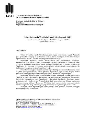 AKADEMIA GÓRNICZO-HUTNICZA IM. STANISŁAWA STASZICA W KRAKOWIE Prof. dr hab. inż. Maria Richert Dziekan Wydziału Metali Nieżelaznych Misja i strategia Wydziału Metali Nieżelaznych AGH Zatwierdzona Uchwałą Rady Wydziału Metali Nieżelaznych nr 13/2014 z dnia 28 stycznia 2014 r. Preambuła Celem Wydziału Metali Nieżelaznych jest ciągłe umacnianie pozycji Wydziału jako jednostki wiodącej w kształceniu kadr na rzecz przemysłu metali nieżelaznych i prowadzeniu badań z obszaru metalurgii metali nieżelaznych. Dążeniem Wydziału Metali Nieżelaznych jest realizowanie zamierzeń, prowadzących do ustawicznego doskonalenia jakości kształcenia i osiągania coraz wyższego poziomu naukowego kadry naukowo-dydaktycznej i naukowo-badawczej Wydziału, aby sprostać wymogom społeczeństwa nieprzerwanie rozwijającego się i ukierunkowanego na doskonalenie i innowacje. Naturalnym następstwem doskonalenia się w każdej dziedzinie realizowanej przez Wydział jest systematyczny wzrost prestiżu Wydziału i jego wysoka pozycja wśród jednostek realizujących podobne cele dydaktyczne, badawcze i organizacyjne. Dążeniem Wydziału jest zrównoważony rozwój jednostek (katedr) tworzących Wydział w celu zapewnienia kształcenia na realizowanych kierunkach: Metalurgia, Inżynieria Materiałowa oraz Zarządzanie i Inżynieria Produkcji. Realizacja celów dydaktycznych i badawczych Wydziału jest silnie uwarunkowana dobrym zapleczem laboratoryjnym, dlatego dążeniem Wydziału jest uzupełnianie, unowocześnianie i rozbudowywanie bazy laboratoryjnej zgodnie z najnowszymi osiągnięciami nauki. Istotnym celem Wydziału jest rozwój kadry, która powinna sprostać rosnącym wymogom jakości kształcenia. Akademia Górniczo-Hutnicza im. Stanisława Staszica w Krakowie Wydział Metali Nieżelaznych al. A. Mickiewicza 30, 30–059 Kraków tel. +48 12 617 26 51, +48 12 617 20 42, fax +48 12 633 23 16 Bank PEKAO S.A. Kraków, 96 1240 4722 1111 0000 4858 2922 REGON: 000001577, NIP: 6750001923 e–mail: [email protected], www.agh.edu.pl Misja Wydziału Wydział Metali Nieżelaznych – jedyny w Polsce, unikatowy nie tylko w skali kraju – powstał w 1962 roku w odpowiedzi na zapotrzebowanie dynamicznie rozwijającego się przemysłu metali nieżelaznych. Obecnie jest nowoczesną jednostką wpisującą się tradycjami, kierunkami badawczymi i nowoczesnymi sposobami kształcenia w tradycje i misję Akademii Górniczo-Hutniczej im. Stanisława Staszica w Krakowie. Wydział współpracuje z licznymi jednostkami badawczymi i uczelniami oraz z przemysłem metali nieżelaznych. Dążeniem Wydziału jest dalszy rozwój kontaktów z przemysłem, uczelniami, jednostkami PAN, instytutami badawczymi oraz innymi jednostkami badawczymi i dydaktycznymi w celu rozwoju i współpracy naukowej i dydaktycznej. W zakresie kształcenia misją Wydziału Metali Nieżelaznych jest prowadzenie dydaktyki na najwyższym poziomie, uwzględniającej zapotrzebowanie rynku pracy na absolwentów, ze szczególnym uwzględnieniem przemysłu metali nieżelaznych. Wydział jest w pełni otwarty na sugestie, nowe informacje i technologie, które mogłyby wzbogacić proces kształcenia. Wydział jest jednocześnie kreatorem licznych inicjatyw, mających na celu szeroki rozwój zarówno w dziedzinie nauki jak i dydaktyki, co przejawia się znaczącą liczbą projektów badawczych oraz ciągłym unowocześnianiem procesu dydaktycznego i wzrostem jakości kształcenia jak i obsługi procesu dydaktycznego. Kształcenie Priorytetem Wydziału w obszarze kształcenia jest utrzymanie wysokiej jakości kształcenia na prowadzonych kierunkach studiów: Metalurgia, Inżynieria Materiałowa oraz Zarządzanie i Inżynieria Produkcji. Wydział dba o budowanie trwałych i partnerskich relacji z pracodawcami. Analizując zapotrzebowanie przemysłu metali nieżelaznych i branż pokrewnych w oparciu o dane statystyczne i śledzenie losu absolwentów, dopasowuje strategię kształcenia do aktualnych wymogów i oczekiwań rynku pracy, mając na uwadze zmieniające się standardy produkcyjne i technologie. Ciągle doskonalone jest przez Wydział kształcenie na wszystkich poziomach studiów oraz sposób przekazu najnowszej wiedzy w zakresie wykładanych przedmiotów. Podnoszona jest świadomość i kwalifikacje pracowników, poszukiwane formy skutecznego motywowania do działań na rzecz poprawy jakości kształcenia. Doskonalone są programy studiów oraz wprowadzana możliwość studiowania w języku angielskim. Zapraszani są do wykładów wybitni specjaliści spoza uczelni – z kraju i z zagranicy. Podnoszona jest atrakcyjność i efektywność praktyk studenckich. Wydział popiera inicjatywy nawiązania wspólnych przedsięwzięć edukacyjnych z uczelniami krajowymi i zagranicznymi w zakresie studiów magisterskich oraz doktoranckich. Ponadto, wspiera inicjatywy wymiany studentów, studiowania studentów zagranicznych na naszym Wydziale oraz wyjazdów studentów w ramach programów unijnych i innych form współpracy międzynarodowej. Wydział aktywnie rozwija nowe formy kształcenia poprzez propozycje studiów podyplomowych, kursów, wykładów zamawianych i szukanie możliwości rozwijania ustawicznego kształcenia dla osób w różnych sytuacjach zawodowych i życiowych, które chcą pogłębiać i aktualizować wiedzę techniczną. Wydział wspiera działalność i rozwój kół naukowych oraz udział studentów w sesjach studenckich i konferencjach, stwarza możliwość uczestnictwa studentów w prowadzonych pracach naukowo-badawczych. Wydział stara się rozwijać możliwości studiowania i poszerzania wiedzy przez internet. Wspierana jest przez Wydział aktywność kulturalna i sportowa oraz działalność samorządowa studentów, szczególnie wspomagająca rozwój ich kompetencji społecznych. Najlepsi absolwenci Wydziału są promowani w środowisku przemysłowym metali nieżelaznych, otrzymują prestiżowe nagrody branżowego stowarzy