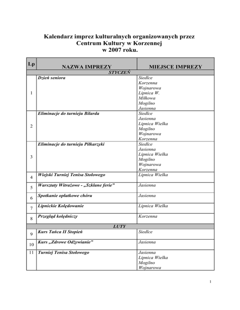 Kalendarz imprez kulturalnych organizowanych przez Centrum Kultury w Korzennej w 2007 roku. Lp NAZWA IMPREZY MIEJSCE IMPREZY STYCZEŃ Dzień seniora Wiejski Turniej Tenisa Stołowego Siedlce Korzenna Wojnarowa Lipnica W. Miłkowa Mogilno Jasienna Siedlce Jasienna Lipnica Wielka Mogilno Wojnarowa Korzenna Siedlce Jasienna Lipnica Wielka Mogilno Wojnarowa Korzenna Lipnica Wielka Warsztaty Witrażowe - „Szklane ferie” Jasienna Spotkanie opłatkowe chóru Jasienna Lipnickie Kolędowanie Lipnica Wielka Przegląd kolędniczy Korzenna 1 Eliminacje do turnieju Bilarda 2 Eliminacje do turnieju Piłkarzyki 3 4 5 6 7 8 LUTY 9 10 Kurs Tańca II Stopień Siedlce Kurs „Zdrowe Odżywianie” Jasienna 11 Turniej Tenisa Stołowego Jasienna Lipnica Wielka Mogilno Wojnarowa 1 Korzenna Lipnica Wielka Mogilno Zabawa Karnawałowa 12 MARZEC 13 Konkurs Rysunkowy - „Szukamy Wiosny” 14 „Babskie Posiadówy” 15 Świetlicowy konkurs „Najładniejsza Pisanka” KWIECIEŃ Konkurs Palm Wielkanocnych 16 Siedlce Jasienna Mogilno Siedlce Jasienna MAJ Dzień Matki 16 17 Dzień Strażaka Konkurs Rysunkowy „Jak będę spędzać 18 wakacje” CZERWIEC Dzień Dziecka 19 20 Przegląd Młodych Talentów Rozpoczęcie wakacji-dyskoteka młodzieżowa 21 Mogilno Siedlce Jasienna Lipnica Wielka Wojnarowa Mogilno Siedlce Wojnarowa Mogilno Siedlce Jasienna Lipnica Wielka Wojnarowa Lipnica Wielka Lipnica Wielka Mogilno LIPIEC Koncert Laureatów Przeglądu Młodych Lipnica Wielka 22 Talentów LIPIEC – SIERPIEŃ Wakacje z Biblioteką – wycieczki krajoznawcze Mogilno Siedlce Lipnica Wielka 23 Wojnarowa Jasienna 24 Turniej Siatkówki na wolnym powietrzu Wojnarowa Mogilno SIERPIEŃ 26 Jarmak Korzeński Lipnica Wielka Mogilno Korzenna WRZESIEŃ 27 Konkurs rysunkowy – „Moja Miejscowość” Jasienna 25 Zakończenie wakacji 2 28 Wycieczka „Rosochatka” 29 Dożynki 30 31 32 33 34 35 36 37 38 Mogilno Korzenna PAŹDZIERNIK Konkurs Rysunkowy - „Moja Rodzina” „Jesień z Piosenką” Koncert Laureatów „Jesień z Piosenką” Turniej Humoru LISTOPAD Gminny festiwal Małych Form tanecznych „Roztańczone nutki” „Roztańczone Nutki” - Finał Przegląd Pieśni Patriotycznej Konkurs Poezji i Prozy Patriotycznej Koncert Chóru Parafialnego Zabawa Andrzejkowa 39 Jasienna Wojnarowa Wojnarowa Mogilno Siedlce Siedlce Lipnica Wielka Jasienna Mogilno Lipnica Wielka Jasienna Mogilno GRUDZIEŃ 40 Jasełka „Betlejem Polskie” Wielkie Kolędowanie 41 Lipnica Wielka Wojnarowa Jasienna Mogilno Szczegóły na www.ck.korzenna.iap.pl Kontakt: [email protected] 3