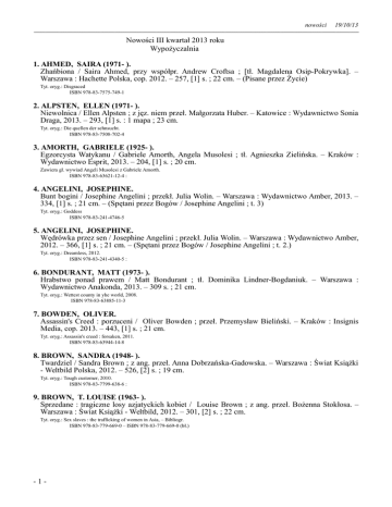 nowości 19/10/13 ‗‗‗‗‗‗‗‗‗‗‗‗‗‗‗‗‗‗‗‗‗‗‗‗‗‗‗‗‗‗‗‗‗‗‗‗‗‗‗‗‗‗‗‗‗‗‗‗‗‗‗‗‗‗‗‗‗‗‗‗‗‗‗‗‗‗‗‗‗‗‗‗‗‗‗‗‗‗‗‗‗‗‗‗‗‗‗‗‗‗‗‗‗‗‗‗‗‗‗‗‗‗‗‗‗‗‗‗‗‗‗‗‗‗‗‗‗‗‗‗‗‗‗‗‗‗‗‗‗‗‗‗‗‗‗‗‗‗‗‗‗ Nowości III kwartał 2013 roku Wypożyczalnia 1. AHMED, SAIRA (1971- ). Zhańbiona / Saira Ahmed, przy współpr. Andrew Croftsa ; [tł. Magdalena Osip-Pokrywka]. – Warszawa : Hachette Polska, cop. 2012. – 257, [1] s. ; 22 cm. – (Pisane przez Życie) Tyt. oryg.: Disgraced ISBN 978-83-7575-749-1 2. ALPSTEN, ELLEN (1971- ). Niewolnica / Ellen Alpsten ; z jęz. niem przeł. Małgorzata Huber. – Katowice : Wydawnictwo Sonia Draga, 2013. – 293, [1] s. : 1 mapa ; 23 cm. Tyt. oryg.: Die quellen der sehnsucht. ISBN 978-83-7508-702-4 3. AMORTH, GABRIELE (1925- ). Egzorcysta Watykanu / Gabriele Amorth, Angela Musolesi ; tł. Agnieszka Zielińska. – Kraków : Wydawnictwo Esprit, 2013. – 204, [1] s. ; 20 cm. Zawiera gł. wywiad Angeli Musolesi z Gabriele Amorth. ISBN 978-83-63621-12-4 : 4. ANGELINI, JOSEPHINE. Bunt bogini / Josephine Angelini ; przekł. Julia Wolin. – Warszawa : Wydawnictwo Amber, 2013. – 334, [1] s. ; 21 cm. – (Spętani przez Bogów / Josephine Angelini ; t. 3) Tyt. oryg.: Goddess ISBN 978-83-241-4746-5 5. ANGELINI, JOSEPHINE. Wędrówka przez sen / Josephine Angelini ; przekł. Julia Wolin. – Warszawa : Wydawnictwo Amber, 2012. – 366, [1] s. ; 21 cm. – (Spętani przez Bogów / Josephine Angelini ; t. 2.) Tyt. oryg.: Dreamless, 2012. ISBN 978-83-241-4340-5 : 6. BONDURANT, MATT (1973- ). Hrabstwo ponad prawem / Matt Bondurant ; tł. Dominika Lindner-Bogdaniuk. – Warszawa : Wydawnictwo Anakonda, 2013. – 309 s. ; 21 cm. Tyt. oryg.: Wettest county in yhe world, 2008. ISBN 978-83-63885-11-3 7. BOWDEN, OLIVER. Assassin's Creed : porzuceni / Oliver Bowden ; przeł. Przemysław Bieliński. – Kraków : Insignis Media, cop. 2013. – 443, [1] s. ; 21 cm. Tyt. oryg.: Assassin's creed : forsaken, 2011. ISBN 978-83-63944-14-8 8. BROWN, SANDRA (1948- ). Twardziel / Sandra Brown ; z ang. przeł. Anna Dobrzańska-Gadowska. – Warszawa : Świat Książki - Weltbild Polska, 2012. – 526, [2] s. ; 19 cm. Tyt. oryg.: Tough customer, 2010. ISBN 978-83-7799-638-6 : 9. BROWN, T. LOUISE (1963- ). Sprzedane : tragiczne losy azjatyckich kobiet / Louise Brown ; z ang. przeł. Bożenna Stokłosa. – Warszawa : Świat Książki - Weltbild, 2012. – 301, [2] s. ; 22 cm. Tyt. oryg.: Sex slaves : the trafficking of women in Asia, – Bibliogr. ISBN 978-83-779-669-0 – ISBN 978-83-779-669-0 (bł.) -1- nowości ‗‗‗‗‗‗‗‗‗‗‗‗‗‗‗‗‗‗‗‗‗‗‗‗‗‗‗‗‗‗‗‗‗‗‗‗‗‗‗‗‗‗‗‗‗‗‗‗‗‗‗‗‗‗‗‗‗‗‗‗‗‗‗‗‗‗‗‗‗‗‗‗‗‗‗‗‗‗‗‗‗‗‗‗‗‗‗‗‗‗‗‗‗‗‗‗‗‗‗‗‗‗‗‗‗‗‗‗‗‗‗‗‗‗‗‗‗‗‗‗‗‗‗‗‗‗ ‗‗‗‗‗‗‗‗‗‗‗‗‗‗‗nowości 19/10/13 19/10/13 ‗‗‗‗‗‗‗‗‗‗‗‗‗‗‗‗‗‗‗‗‗‗‗‗‗‗‗‗‗‗‗‗‗‗‗‗‗‗‗‗‗‗‗‗‗‗‗‗‗‗‗‗‗‗‗‗‗‗‗‗‗‗‗‗‗‗‗‗‗‗‗‗‗‗‗‗‗‗‗‗‗‗‗‗‗‗‗‗‗‗‗‗‗‗‗‗‗‗‗‗‗‗‗‗‗‗‗‗‗‗‗‗‗‗‗‗‗‗‗‗‗‗‗‗‗‗‗‗‗‗‗‗‗‗‗‗‗‗‗‗‗ 10. CABRÉ, JAUME (1947- ). Wyznaję / Jaume Cabré ; przeł. z jęz. katalońskiego Anna Sawicka. – Warszawa : Wydawnictwo Marginesy, 2013. – 766, [1] s. ; 24 cm. Tyt. oryg.: Jo confesso ISBN 978-83-63656-24-9 11. CARD, ORSON SCOTT (1951- ). Ruiny / Orson Scott Card / przeł. Kamil Lesiew, Maciejka Mazan. – Warszawa : Prószyński Media, 2013. – 382, [2] s. ; 21 cm. Stanowi kontynuację powieści pt.: Tropiciel. ISBN 978-83-7839-532-4 12. CAST, P. C. (1960- ). Ukryta / P. C. Cast, Kristin Cast ; przeł. z ang. Iwona Michałowska-Gabrych. – Poznań ; Katowice : Wydawnictwo „Książnica" : Publicat, cop. 2013. – 319 s. ; 21 cm. – (Dom Nocy / P. C. Cast, Kristin Cast ; t. 10) Tyt. oryg.: Hidden ISBN 978-83-245-8096-5 13. CÉDRIC, SIRE Gorączka i krew / Sire Cédric ; przekł. z jęz. fr. Marzena Dupuis. – Warszawa : Wydawnictwo Damidos, cop. 2013. – 419 s. ; 21 cm. Tyt. oryg.: De fièvre et de sang. – Na okł. i s. tyt.: Thriller. – Prix Polar du Festival de Cognac 2010 ; CinéCinéma Frisson 2011. ISBN 978-83-7855-039-6 14. CHA, ALY. Zanim przekwitną wiśnie / Aly Cha ; przeł. Ewelina Twardoch. – Warszawa : Prószyński Media, 2013. – 412, [1] s. ; 20 cm. Tyt. oryg.: Shnee im april ISBN 978-83-7839-571-3 15. CORNWELL, BERNARD (1944- ). Spustoszenie : bitwa pod Porto, 1809 / Bernard Cornwell ; [tł. Mateusz Pyziak]. – Warszawa : Instytut Wydawniczy Erica, 2013. – 445 s. ; 21 cm. – (Kampanie Richarda Sharpe'a / Bernard Cornwell.) Tyt. oryg.: Sharpe's havoc : Richard Sharpe and the campaign in Northern Portugal, spring 1809, 2003. – ISBN 978-83-62329-83-0 : 16. CUSSLER, CLIVE (1931- ). Królestwo / Clive Cussler [oraz] Grant Blackwood ; przekł. Maciej Pintara. – Warszawa : Wydawnictwo Amber, 2012. – 350, [1] s. ; 21 cm. Tyt. oryg.: The Kingdom. – Stanowi cz. 3 cyklu, cz. 1 pt.: Złoto Spartan, cz. 2 pt.: Zaginione imperium. ISBN 978-83-241-4188-3 17. DAY, SYLVIA. Wyznanie Crossa / Sylvia Day ; z ang. przeł. Małgorzata Miłosz i Ksenia Sadowska. – Warszawa : Wielka Litera, cop. 2013. – 412, [1] s. ; 20 cm. Stanowi cz. 3. trylogii, cz. 1. pt.: Dotyk Crossa, cz. 2. pt.: Płomień Crossa. ISBN 978-83-64142-05-5 : 18. FICNER-OGONOWSKA, ANNA. Alibi na szczęście / Anna Ficner-Ogonowska. – Kraków : Społeczny Instytut Wydawniczy Znak, 