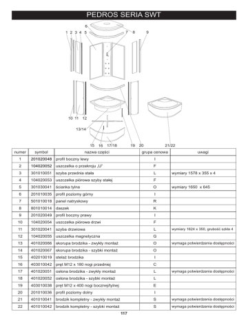 PEDROS SERIA SWT 6 7 1 2 3 4 5 8 9 10 11 12 13/14 19 15 16 17/18 numer symbol nazwa części 20 21/22 grupa cenowa uwagi 1 201020048 profil boczny lewy I 2 104020052 uszczelka o przekroju „U” F 3 301010051 szyba przednia stała L 4 104020053 uszczelka piórowa szyby stałej F 5 301030041 ścianka tylna O 6 201010035 profil poziomy górny I 7 501010018 panel natryskowy R 8 801010014 daszek K 9 201020049 profil boczny prawy I 10 104020054 uszczelka piórowa drzwi F 11 301020041 szyba drzwiowa L 12 104020055 uszczelka magnetyczna G 13 401020066 skorupa brodzika - zwykły montaż O 14 401020067 skorupa brodzika - szybki montaż O 15 402010019 stelaż brodzika I 16 403010042 pręt M12 x 180 nogi przedniej C 17 401020051 osłona brodzika - zwykły montaż L 18 401020052 osłona brodzika - szybki montaż L 19 403010038 pręt M12 x 400 nogi bocznej/tylnej E 20 201010036 profil poziomy dolny I 21 401010041 brodzik kompletny - zwykły montaż S wymaga potwierdzenia dostępności 22 401010042 brodzik kompletny - szybki montaż S wymaga potwierdzenia dostępności 117 wymiary 1578 x 355 x 4 wymiary 1650 x 645 wymiary 1624 x 350, grubość szkła 4 wymaga potwierdzenia dostępności wymaga potwierdzenia dostępności Pedros - elementy panelu natryskowego/akcesoria 1 2 3 4 5 6 7 8 9 10 11 12 13 14 15 16 17 18 19 20 numer symbol nazwa części grupa cenowa uwagi 1 501020018 korpus panelu natryskowego M wymaga potwierdzenia dostępności 2 106010007 bateria kompletna M rozstaw 90 3 103010001 głowica mieszacza - 40 mm G 4 103020012 głowica przełącznika funkcji G 5 101030026 uchwyt mieszacza F 6 101030023 uchwyt przełącznika funkcji F 7 102020022 rozeta mieszacza C 8 102020024 rozeta przełącznika funkcji C 9 102040017 osłona głowicy mieszacza D 10 105010006 dysza masażowa przelotowa D 11 105010007 dysza masażowa końcowa D 12 102030036 wąż połączeniowy dysz masażowych F długość całkowita 160 cm 13 102030037 wąż połączeniowy zestawu natryskowego E długość 40 cm 14 102030010 wąż połączeniowy deszczownicy F długość 130 cm 15 102060001 opaska zaciskowa B 16 102050007 kolanko węża połączeniowego - mosiądz C 17 502010016 nakładka panelu natryskowego D 18 702020017 uchwyt drzwi C 19 105010008 słuchawka natryskowa F 20 105030017 uchwyt słuchawki natryskowej D 118 Pedros - elementy panelu natryskowego/akcesoria 1 2 3 4 5 6 7 8 9 10 11 12 13 14 15 16 17 18 19 20 numer symbol nazwa części grupa cenowa uwagi 1 701020004 śruby uchwytu słuchawki A 2 105020004 wąż natryskowy E 3 701020002 nakrętka 1/2" z kołnierzem - tworzywo A 4 105010011 I 5 102050005 przyłącze węża natryskowego C 6 105050010 drenaż H 7 702010020 rolka górna E średnica kółka 25 8 702010021 rolka dolna E średnica kółka 25 9 701010020 zestaw wkrętów do montażu kabiny F 10 403010043 zestaw wkrętów do montażu brodzika E 11 403010005 nakrętka M12 A 12 403010032 nakrętka M12 z kołnierzem B 13 403010004 duży zatrzask osłony - zwykły montaż B 14 403010033 mały zatrzask osłony - zwykły montaż A 15 403010009 uchwyt osłony - zwykły montaż B 16 403010006 zaślepka osłony - zwykły montaż A 17 403010008 stopka - zwykły montaż B średnica 56 18 403010034 stopka - szybki montaż B średnica 38 19 403010022 zatrzask osłony - szybki montaż B 20 702010017 odbojnik B deszczownica 119 1/2" x 1/2" L1500 Pedros - elementy panelu natryskowego/akcesoria 1 2 3 4 5 6 7 8 9 10 11 12 13 14 15 16 17 18 19 20 numer symbol nazwa części grupa cenowa 1 104020050 uszczelka nakrętki 1/2" A 2 702020007 uchwyt szyby stałej A 3 4 5 6 7 8 9 10 11 12 13 14 15 16 17 18 19 20 120 uwagi Pedros - zestawy części symbol nazwa części grupa cenowa uwagi 901010122 paczka 1/4 T brodzik, profile poziome, osłona, stelaż, daszek, 901010123 paczka 2/4 S ścianki tylne 901010124 paczka 3/4 U panel natryskowy, nakładki, zestaw montażowy brodzika, zestaw montażowy kabiny 901010125 paczka 4/4 T szyby przednie, szyby drzwiowe, profile pionowe, uszczelki 902010018 zestaw montażowy R zestaw montażowy z paczki 3/4 121