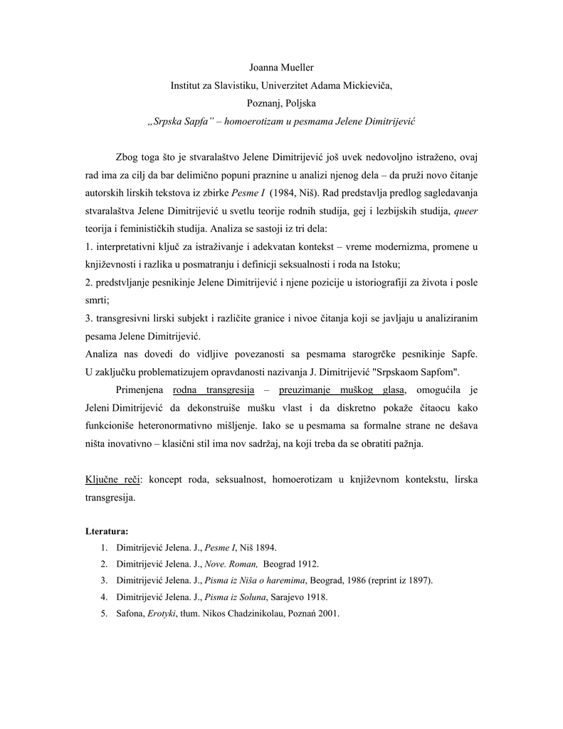 Joanna Mueller Institut za Slavistiku, Univerzitet Adama Mickieviča, Poznanj, Poljska „Srpska Sapfa” – homoerotizam u pesmama Jelene Dimitrijević Zbog toga što je stvaralaštvo Jelene Dimitrijević još uvek nedovoljno istraženo, ovaj rad ima za cilj da bar delimično popuni praznine u analizi njenog dela – da pruži novo čitanje autorskih lirskih tekstova iz zbirke Pesme I (1984, Niš). Rad predstavlja predlog sagledavanja stvaralaštva Jelene Dimitrijević u svetlu teorije rodnih studija, gej i lezbijskih studija, queer teorija i feminističkih studija. Analiza se sastoji iz tri dela: 1. interpretativni ključ za istraživanje i adekvatan kontekst – vreme modernizma, promene u književnosti i razlika u posmatranju i definicji seksualnosti i roda na Istoku; 2. predstvljanje pesnikinje Jelene Dimitrijević i njene pozicije u istoriografiji za života i posle smrti; 3. transgresivni lirski subjekt i različite granice i nivoe čitanja koji se javljaju u analiziranim pesama Jelene Dimitrijević. Analiza nas dovedi do vidljive povezanosti sa pesmama starogrčke pesnikinje Sapfe. U zaključku problematizujem opravdanosti nazivanja J. Dimitrijević "Srpskaom Sapfom". Primenjena rodna transgresija – preuzimanje muškog glasa, omogućila je Jeleni Dimitrijević da dekonstruiše mušku vlast i da diskretno pokaže čitaocu kako funkcioniše heteronormativno mišljenje. Iako se u pesmama sa formalne strane ne dešava ništa inovativno – klasični stil ima nov sadržaj, na koji treba da se obratiti pažnja. Ključne reči: koncept roda, seksualnost, homoerotizam u književnom kontekstu, lirska transgresija. Lteratura: 1. Dimitrijević Jelena. J., Pesme I, Niš 1894. 2. Dimitrijević Jelena. J., Nove. Roman, Beograd 1912. 3. Dimitrijević Jelena. J., Pisma iz Niša o haremima, Beograd, 1986 (reprint iz 1897). 4. Dimitrijević Jelena. J., Pisma iz Soluna, Sarajevo 1918. 5. Safona, Erotyki, tłum. Nikos Chadzinikolau, Poznań 2001. Sekundarna literatura: 1. Bečanović Nikolić Z., Paradoksi hibridnosti, orijentalizma (balkanizma) i subalternosti u romanu „Nove” Jelene Dimitrijević, Knjiženstvo 2011, http://www.knjizenstvo.rs/magazine.php?text=14 [wgląd: 11.11.2012.] 2. Brzeziński M., Transgresje cielesności [w:] (Nie)Obecne granice. Szkice o obliczach transgresji, red. K. Kuropatwa, D. Rode, Kraków 2003., dostępne online: http://postvideoart.wordpress.com/2010/11/22/transgresje-cielesnosci/, wgląd: 11.05.2013. 3. Butler J. , Akty performatywne a konstrukcja płci kulturowej, tłum. Marek Łata, w: Lektury inności, red. M. Dąbrowski, R. Pruszczyński, Warszawa 2007. 4. Butler J., Uwikłani w płeć, tłum. K. Krasuska, Warszawa 2008. 5. Chołuj B., Przestrzenie kobiecości – miejsca kobiet, w: „Katedra Gender Studies UW” 2/2001, s. 3. 6. Chudoba E., Literatura i homoseksualność. Zarys problematyki genderowej w kanonicznych tekstach literatury światowej i polskiej, Kraków 2012, 7. Coco C., Harem i jego sekrety, tłum. E. Romkowska, Warszawa 1998. 8. Andrejević D., Tri rukopisne zbirke Pesama Jelene Dimitrijecić, w: Jelena Dimitrijević život i delo, Niš 2004, s. 43-53. 9. Dojčinović B., Hronoloski pregled zivota i dela Jelene Dimitrijević, w: Nove, J. Dimitrijević Belgrad 2012, s. 260. 10. Đorđević M., Poezija Jelene Dimitrijević u svom vremenu i danas, w: Jelena Dimitrijević život i delo, Niš 2004. 11. Franczak J., Poszukiwanie realności : światopogląd polskiej prozy modernistycznej, Kraków 2007. 12. Górak-Sosnowska K., Nieobecne i niewidoczne. Lesbijki w świecie islamu, [w:] Queer a islam: alternatywna seksualność w krajach muzułmańskich, pod. red. K. Górak-Sosnowska, Sopot 2012 13. Jovanović M. R., Duhovni prostor u stvaralaštvu Jelene Dimitrijević – prilozi za biografiju, w: Jelena Dimitrijević život i delo, Niš 2004 14. Kaliściak T., Katastrofy odmieńców, Katowice 2001 15. Koch Marijana., …kiedy dojrzejemy jako kultura… Twórczość pisarek serbskich na początku XX wieku (kanon – genre – gender), Wrocław 2007. 16. Kopaliński W., Encyklopedia „drugiej płci”, Warszawa 1995, 17. Mizielińska J., (De)Konstrukcje kobiecości : podmiot feminizmu a problem wykluczenia, Gdańsk 2004. 18. Nowa świadomość płci w modernizmie : studia spod znaku gender w kulturze polskiej i rosyjskiej u schyłku stulecia, pod red. German Ritz, Christa Binswanger, Carmen Scheide, Kraków 2000. 19. Peković S., Jelenina pisma, w: Pisma iz Niša o haremima, Beograd-Gornji Milanovac, 1986, s. IV-XV. 20. Phillips U., Narcyza Żmichowska : feminizm i religia, tłum. K. Bojarska, Warszawa 2008. 21. Ritz G., Nić w labiryncie pożądnia. Gender i płeć w literaturze polskiej od romantyzmu do postmodernizmu, Warszawa 2002, 22. Schick I. C., Seksualność Orientu. Przestrzeń i eros, tłum. A. Gąsior-Niemiec, Warszawa 2012. 23. Skerlić J., Istorija nove srpske knjizevnosti, Beograd 1967, s. 465. 24. Živančević-Sekeruš I., Historia literatury serbskiej w perspektywie genderowej, tłum. E. Kraskowska, w: Literatury słowiańskie po roku 1989 : nowe zjawiska, tendencje, perspektywy, t. 2 Feminizm, pod red. E. Kraskowskiej, Warszawa 2005