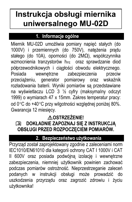 Instrukcja obsługi miernika uniwersalnego MU-02D 1. Informacje ogólne Miernik MU-02D umożliwia pomiary napięć stałych (do 1000V) i przemiennych (do 750V), natężenia prądu stałego (do 10A), oporności (do 2MΩ), współczynnika wzmocnienia tranzystorów hFE oraz sprawdzanie diod półprzewodnikowych i ciągłości obwodu elektrycznego. Posiada wewnętrzne zabezpieczenia przeciw przeciążeniu, generator pomiarowy oraz wskaźnik rozładowania baterii. Wyniki pomiarów są przedstawiane na wyświetlaczu LCD 3 ½ cyfry (maksymalny odczyt 1999) o wymiarach 47 x 15mm. Zakres temperatur pracy: od 0C do +40C przy wilgotności względnej poniżej 80%. Gwarancja 12 miesięcy. OSTRZEŻENIE! DOKŁADNIE ZAPOZNAJ SIĘ Z INSTRUKCJĄ OBSŁUGI PRZED ROZPOCZĘCIEM POMIARÓW. 2. Bezpieczeństwo użytkowania Przyrząd został zaprojektowany zgodnie z zaleceniami norm IEC1010/EN61010 dla kategorii ochrony CAT I 1000V i CAT II 600V oraz posiada podwójną izolację i wewnętrzne zabezpieczenia, niemniej użytkownik powinien zachować podczas pomiarów ostrożność. Nieprzestrzeganie zaleceń podanych w instrukcji obsługi może prowadzić do uszkodzenia przyrządu oraz zagrozić zdrowiu i życiu użytkownika! Kategorie ochrony przepięciowej CATI i CATII pozwalają wykorzystywać przyrząd do pomiarów w urządzeniach podłączonych do obwodów z ograniczonymi przepięciami o małym nasileniu oraz w urządzeniach pobierających energię z instalacji niskonapięciowej 230V/50Hz jak np. urządzenia domowe, biurowe, wyposażenie warsztatów itp. - Zachować szczególną ostrożność przy pomiarach napięć powyżej 60V DC lub 30V AC (wartość skuteczna). Napięcia takie mogą spowodować porażenie . - Nie wolno wykonywać pomiarów w obwodach, w których może wystąpić napięcie między punktami pomiarowymi wyższe od 1000VDC/750VAC, ani napięcie wyższe od 500V między COM a ziemią. - Nie należy przekraczać wartości ustawionych zakresów napięć i prądów. Jeśli jest możliwe, że mierzona wartość będzie wyższa od wartości zakresu, to należy zmienić zakres na odpowiednio wyższy. - Nie wolno używać miernika jeśli uległ on uszkodzeniu lub zostały uszkodzone (elektrycznie lub mechanicznie) przewody pomiarowe. - Przed wykonaniem pomiaru należy się upewnić czy przewody są włączone do właściwych gniazd pomiarowych oraz czy przełącznik obrotowy znajduje się w odpowiedniej pozycji. Podczas pomiarów nie wolno dotykać końcówek i gniazd pomiarowych. - Nie wykonywać pomiarów mokrymi rękami oraz w miejscach o dużej wilgotności. - Przed otwarciem obudowy (np. wymiana baterii lub bezpiecznika), należy odłączyć od niego przewody pomiarowe. 3. Opis przyrządu 1 2 6 3 4 5 1.Wyświetlacz - typu LCD 3 ½ cyfry (max. wskazanie 1999), wyświetla wartość mierzoną, znak polaryzacji, ostrzeżenie o pomiarze na najwyższym dopuszczalnym zakresie napięcia („HV”) i o rozładowaniu baterii zasilającej. 2.Przełącznik obrotowy - służy do wybierania wielkości mierzonych i zakresów pomiarowych. 3.Gniazdo 10A - gniazdo pomiaru natężenia prądu stałego dla zakresu pomiarowego 10A. 4.Gniazdo VΩmA - gniazdo pomiarów napięć, oporności i prądu ( z wyjątkiem zakresu 10A) oraz wyjście generatora pomiarowego. 5.Gniazdo COM - wspólne gniazdo pomiarowe. 6.Gniazdo hFE - pomiaru współczynnika wzmocnienia tranzystorów n-p-n i p-n-p. 4. Dane techniczne Podane poniżej dokładności są gwarantowane w warunkach pomiarów: temperatura 23±5˚C, wilgotność względna poniżej 80%. 4.1 Pomiar napięcia stałego: ZAKRES 200mV 2V 20V 200V 1000V ROZDZIELCZOŚĆ 100uV 1mV 10mV 100mV 1V DOKŁADNOŚĆ ±(0,5% + 3 cyfry) ±(1,0% + 5 cyfr) ±(1,2% + 5 cyfr) Zabezpieczenie przed przeciążeniem: do 1000V DC. Rezystancja wejściowa 1MΩ. 4.2 Pomiar napięcia przemiennego: ZAKRES 200V 750V ROZDZIELCZOŚĆ 100mV 1V DOKŁADNOŚĆ ±(1,5% +10 cyfr) Zabezpieczenie przed przeciążeniem: do ~750Vrms. Impedancja wejściowa 1MΩ. Pasmo częstotliwości: 45Hz ~ 450Hz. 4.3 Pomiar natężenia prądu stałego: ZAKRES 200uA 2mA 20mA 200mA 10A ROZDZIELCZOŚĆ 100nA 1uA 10uA 100uA 10mA DOKŁADNOŚĆ ±(1,8% +2 cyfry) ±(2,0% +2 cyfry) ±(2,0% +10 cyfr) Zabezpieczenie przed przeciążeniem: bezpiecznik 500mA/250V na wszystkich zakresach poza 10A. Spadek napięcia: do 200mV. 4.4 Pomiar rezystancji: ZAKRES 200Ω 2000Ω 20KΩ 200KΩ 2000KΩ ROZDZIELCZOŚĆ 100mΩ 1Ω 10Ω 100Ω 1KΩ DOKŁADNOŚĆ ±(1,0% +10 cyfr) ±(1,0% +4 cyfry) Zabezpieczenie przed przeciążeniem: ~250Vrms. Maksymalne napięcie na nieobciążonych zaciskach pomiarowych: 3,2V. 4.5 Sprawdzenie ciągłości (przewodzenia) obwodu: Pojawia się sygnał dźwiękowy jeśli sprawdzany obwód ma rezystancję niewiększą niż 30 ±20Ω. Zabezpieczenie przed przeciążeniem: ~250Vrms. 4.6 Pomiar współczynnika wzmocnienia prądowego tranzystora hFE: orientacyjny pomiar współczynnika hFE tranzystorów (dla IB=10μA i UCE=2,8V). 5. Wykonywanie pomiarów 5.1 Pomiar napięcia stałego (DC) Przyłączyć do miernika przewody pomiarowe (czerwony do gniazda VΩmA, czarny do gniazda COM) Przełącznik obrotowy ustawić na odpowiedni zakres pomiaru napięcia stałego V Podłączyć końcówki przewodów testowych do punktów pomiarowych Odczytać wynik pomiaru 5.2 Pomiar napięcia przemiennego (AC) Przyłączyć do miernika przewody pomiarowe (czerwony do gniazda VΩmA, czarny do gniazda COM) Przełącznik obrotowy ustawić na odpowiedni zakres pomiaru napięcia przemiennego V~ Podłączyć końcówki przewodów testowych do punktów pomiarowych Odczytać wynik pomiaru 5.3 Pomiar natężenia prądu stałego (DC) Przyłączyć do miernika przewody pomiarowe (czerwony do gniazda VΩmA dla pomiaru natężenia prądu o wartościach do 200mA, albo do gniazda 10A dla pomiaru natężenia prądu w przedziale od 200mA do 10A. W obu przypadkach czarny przewód należy przyłączyć do gniazda COM) Przełącznik obrotowy ustawić na odpowiedni zakres pomi