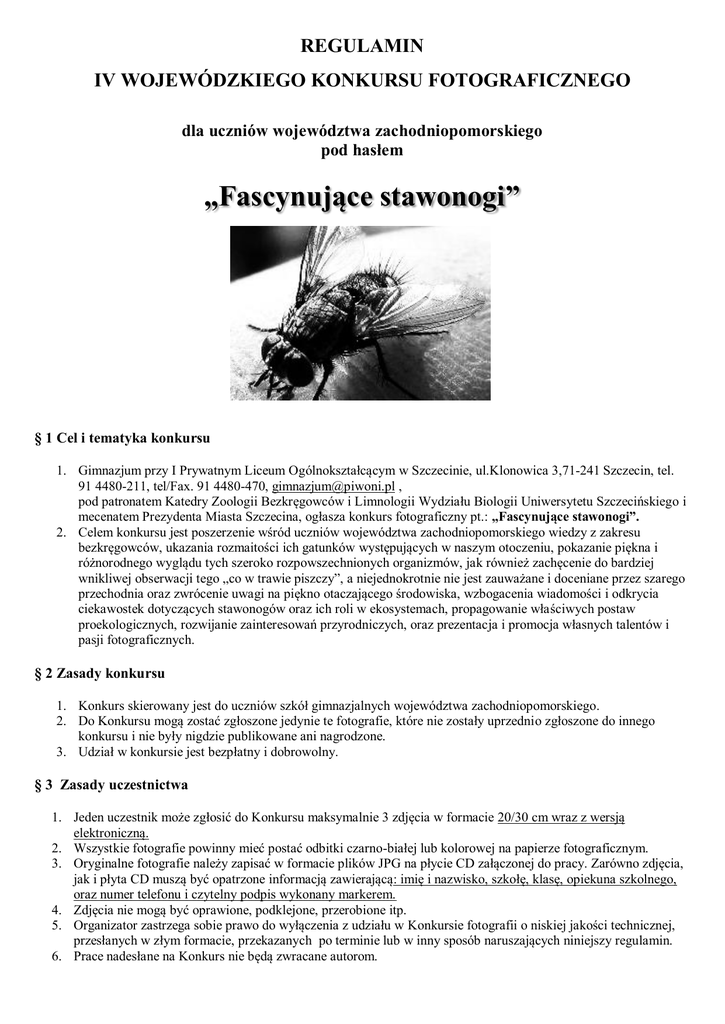 REGULAMIN IV WOJEWÓDZKIEGO KONKURSU FOTOGRAFICZNEGO dla uczniów województwa zachodniopomorskiego pod hasłem „Fascynujące stawonogi” § 1 Cel i tematyka konkursu 1. Gimnazjum przy I Prywatnym Liceum Ogólnokształcącym w Szczecinie, ul.Klonowica 3,71-241 Szczecin, tel. 91 4480-211, tel/Fax. 91 4480-470, [email protected] , pod patronatem Katedry Zoologii Bezkręgowców i Limnologii Wydziału Biologii Uniwersytetu Szczecińskiego i mecenatem Prezydenta Miasta Szczecina, ogłasza konkurs fotograficzny pt.: „Fascynujące stawonogi”. 2. Celem konkursu jest poszerzenie wśród uczniów województwa zachodniopomorskiego wiedzy z zakresu bezkręgowców, ukazania rozmaitości ich gatunków występujących w naszym otoczeniu, pokazanie piękna i różnorodnego wyglądu tych szeroko rozpowszechnionych organizmów, jak również zachęcenie do bardziej wnikliwej obserwacji tego „co w trawie piszczy”, a niejednokrotnie nie jest zauważane i doceniane przez szarego przechodnia oraz zwrócenie uwagi na piękno otaczającego środowiska, wzbogacenia wiadomości i odkrycia ciekawostek dotyczących stawonogów oraz ich roli w ekosystemach, propagowanie właściwych postaw proekologicznych, rozwijanie zainteresowań przyrodniczych, oraz prezentacja i promocja własnych talentów i pasji fotograficznych. § 2 Zasady konkursu 1. Konkurs skierowany jest do uczniów szkół gimnazjalnych województwa zachodniopomorskiego. 2. Do Konkursu mogą zostać zgłoszone jedynie te fotografie, które nie zostały uprzednio zgłoszone do innego konkursu i nie były nigdzie publikowane ani nagrodzone. 3. Udział w konkursie jest bezpłatny i dobrowolny. § 3 Zasady uczestnictwa 1. Jeden uczestnik może zgłosić do Konkursu maksymalnie 3 zdjęcia w formacie 20/30 cm wraz z wersją elektroniczną. 2. Wszystkie fotografie powinny mieć postać odbitki czarno-białej lub kolorowej na papierze fotograficznym. 3. Oryginalne fotografie należy zapisać w formacie plików JPG na płycie CD załączonej do pracy. Zarówno zdjęcia, jak i płyta CD muszą być opatrzone informacją zawierającą: imię i nazwisko, szkołę, klasę, opiekuna szkolnego, oraz numer telefonu i czytelny podpis wykonany markerem. 4. Zdjęcia nie mogą być oprawione, podklejone, przerobione itp. 5. Organizator zastrzega sobie prawo do wyłączenia z udziału w Konkursie fotografii o niskiej jakości technicznej, przesłanych w złym formacie, przekazanych po terminie lub w inny sposób naruszających niniejszy regulamin. 6. Prace nadesłane na Konkurs nie będą zwracane autorom. 7. Prace konkursowe należy przesłać lub dostarczyć osobiście do sekretariatu szkoły w nieprzekraczalnym terminie do 15 maja 2016r. Gimnazjum przy I Prywatnym Liceum Ogólnokształcącym w Szczecinie ul. Klonowica 3 71-241 Szczecin, z dopiskiem: Konkurs „Fascynujące stawonogi” 8. Uczestnik Konkursu zobowiązany jest dołączyć Formularz zgłoszeniowy oraz oświadczenie, stanowiące załącznik do niniejszego regulaminu. 9. Każdy uczestnik konkursu składa oświadczenie o możliwości bezpłatnego opublikowania złożonych na konkurs prac przez Gimnazjum przy I Prywatnym Liceum Ogólnokształcącym w Szczecinie ul. Klonowica 3, 71-241 Szczecin, wraz z publikacją imion i nazwisk autorów. 10. Uczestnicy mają prawo zgłaszać do Konkursu tylko i wyłącznie zdjęcia wykonane samodzielnie, do których posiadają wszelkie prawa autorskie. Zgłaszanie zdjęć wykonanych przez inne osoby jest całkowicie zabronione. Uczestnicy ponoszą pełną odpowiedzialność, związaną z użyciem przesłanych przez siebie fotografii, a w szczególności pełną odpowiedzialność za naruszenie praw osób trzecich. 11. Przybycie na uroczystą galę wręczenia dyplomów i nagród oraz wernisaż - na koszt uczestników. 12. Zgłoszenie prac do Konkursu jest jednoznaczne z uznaniem warunków niniejszego regulaminu oraz wyrażeniem zgody na publikowanie danych osobowych zgodnie z ustawą z dnia 29.08.1997 roku o ochronie danych osobowych (Dz. U. Nr 133 poz. 883). 13. W konkursie została ustalona jedna grupa wiekowa – uczniowie gimnazjum. 14. Plakat konkursu przygotowała Katarzyna Zawadzka – uczennica Liceum Ogólnokształcącego z Oddziałami Integracyjnymi w Szczecinie § 4 Nagrody 1. Autorom najlepszych zdjęć zostaną przyznane nagrody książkowe, dyplomy i inne gadżety. 2. Lista nagrodzonych autorów zdjęć zostanie opublikowana na stronie internetowej Gimnazjum przy I Prywatnym Liceum Ogólnokształcącym w Szczecinie (http://www.piwoni.pl/gim), 15.05.2016r., a wręczenie nagród nastąpi w czerwcu 2016r. § 5 Komisja oceniająca 1. W celu przeprowadzenia Konkursu, zostanie powołana Komisja oceniająca nadesłane prace której zadaniem będzie kwalifikacja i ocena fotografii zgłoszonych do udziału w Konkursie, oraz przyznanie nagród. 2. Przy ocenie zdjęć uwzględnia się: - kryteria merytoryczne, - wartość artystyczną, - jakość techniczną i poziom estetyczny prac. 4 Decyzja Komisji w sprawie przyznania nagród jest ostateczna i nie podlega odwołaniu. § 6 Wystawa pokonkursowa 1. Zdjęcia nagrodzone i wyróżnione w Konkursie zostaną wystawione i zamieszczone na stronie internetowej Gimnazjum przy I Prywatnym Liceum Ogólnokształcącym w Szczecinie (http://www.piwoni.pl/gim), które zastrzega sobie prawo do bezpłatnej publikacji prac na wystawie pokonkursowej. § 7 Dodatkowe informacje 1. Wszelkich dodatkowych informacji na temat Konkursu można otrzymać kierując zapytanie do organizatora: Monika Wiercińska [email protected] 2. Regulamin Konkursu opublikowany jest na stronie internetowej Gimnazjum przy I Prywatnym Liceum Ogólnokształcącym w Szczecinie (http://www.piwoni.pl/gim), w zakładce KONKURS „Fascynujące bezkręgowce”. 3. Dołączenie załączników i formularza zgłoszeniowego stanowi o zakwalifikowaniu pracy do konkursu. Załącznik 1 § 1 OŚWIADCZENIE Oświadczam, że jestem autorem dostarczonego zdjęcia/ zdjęć. § 