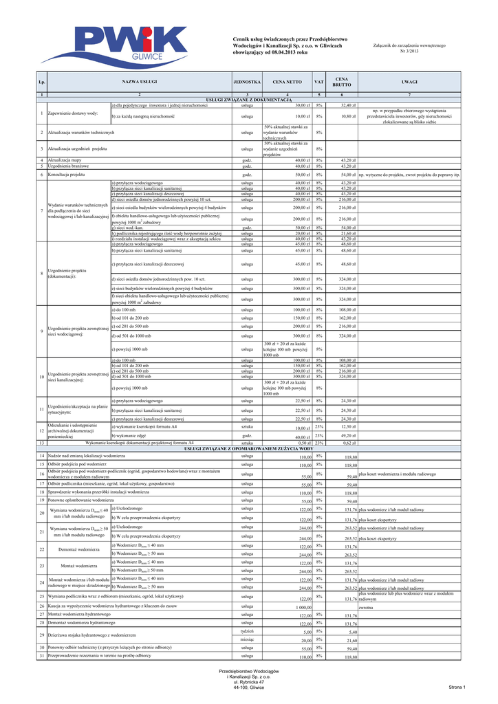 Cennik usług świadczonych przez Przedsiębiorstwo Wodociągów i Kanalizacji Sp. z o.o. w Gliwicach obowiązujący od 08.04.2013 roku Lp. NAZWA USŁUGI 1 2 JEDNOSTKA CENA NETTO 5 6 7 b) za każdą następną nieruchomość 8% 10,80 zł Aktualizacja warunków technicznych usługa 3 Aktualizacja uzgodnień projektu usługa 4 5 Aktualizacja mapy Uzgodnienia branżowe godz. godz. 50% aktualnej stawki za wydanie warunków technicznych 50% aktualnej stawki za wydanie uzgodnień projektów 40,00 zł 40,00 zł 6 Konsultacja projektu godz. usługa 10,00 zł 8% 8% 43,20 zł 43,20 zł 50,00 zł 8% 54,00 zł np. wytyczne do projektu, zwrot projektu do poprawy itp. usługa usługa usługa usługa 40,00 zł 40,00 zł 40,00 zł 200,00 zł 8% 8% 8% 8% 43,20 zł 43,20 zł 43,20 zł 216,00 zł usługa 200,00 zł 8% 216,00 zł usługa 200,00 zł 8% 216,00 zł godz. usługa usługa usługa usługa 50,00 zł 20,00 zł 40,00 zł 45,00 zł 45,00 zł 8% 8% 8% 8% 8% 54,00 zł 21,60 zł 43,20 zł 48,60 zł 48,60 zł c) przyłącza sieci kanalizacji deszczowej usługa 45,00 zł 8% 48,60 zł d) sieci osiedla domów jednorodzinnych pow. 10 szt. usługa 300,00 zł 8% 324,00 zł e) sieci budynków wielorodzinnych powyżej 4 budynków usługa 300,00 zł 8% 324,00 zł f) sieci obiektu handlowo-usługowego lub użyteczności publicznej powyżej 1000 m2 zabudowy usługa 300,00 zł 8% 324,00 zł a) do 100 mb. usługa 100,00 zł 8% 108,00 zł b) od 101 do 200 mb usługa 150,00 zł 8% 162,00 zł usługa 200,00 zł 8% 216,00 zł usługa 300,00 zł 8% 324,00 zł Wydanie warunków technicznych e) sieci osiedla budynków wielorodzinnych powyżej 4 budynków dla podłączenia do sieci wodociągowej i/lub kanalizacyjnej f) obiektu handlowo-usługowego lub użyteczności publicznej powyżej 1000 m2 zabudowy g) sieci wod.-kan. h) podlicznika rejestrującego ilość wody bezpowrotnie zużytej i) rozdziału instalacji wodociągowej wraz z akceptacją szkicu a) przyłącza wodociągowego b) przyłącza sieci kanalizacji sanitarnej Uzgodnienie projektu zewnętrznej c) od 201 do 500 mb sieci wodociągowej: d) od 501 do 1000 mb e) powyżej 1000 mb usługa a) do 100 mb b) od 101 do 200 mb c) od 201 do 500 mb Uzgodnienie projektu zewnętrznej d) od 501 do 1000 mb 10 sieci kanalizacyjnej: usługa usługa usługa usługa e) powyżej 1000 mb usługa a) przyłącza wodociągowego Uzgodnienie/akceptacja na planie b) przyłącza sieci kanalizacji sanitarnej sytuacyjnym: 300 zł + 20 zł za każde kolejne 100 mb powyżej 1000 mb 100,00 zł 150,00 zł 200,00 zł 300,00 zł 300 zł + 20 zł za każde kolejne 100 mb powyżej 1000 mb 8% 8% 8% 8% 8% 108,00 zł 162,00 zł 216,00 zł 324,00 zł 8% usługa 22,50 zł 8% 24,30 zł usługa 22,50 zł 8% 24,30 zł usługa 22,50 zł 8% 24,30 zł Odszukanie i udostępnienie a) wykonanie kserokopii formatu A4 sztuka 10,00 zł 23% 12 archiwalnej dokumentacji b) wykonanie zdjęć godz. poniemieckiej 40,00 zł 23% Wykonanie kserokopii dokumentacji projektowej formatu A4 13 sztuka 0,50 zł 23% USŁUGI ZWIĄZANE Z OPOMIAROWANIEM ZUŻYCIA WODY 12,30 zł 11 c) przyłącza sieci kanalizacji deszczowej 49,20 zł 0,62 zł 14 Nadzór nad zmianą lokalizacji wodomierza usługa 110,00 8% 118,80 15 Odbiór podejścia pod wodomierz usługa 110,00 8% 118,80 Odbiór podejścia pod wodomierz-podlicznik (ogród, gospodarstwo hodowlane) wraz z montażem 16 wodomierza z modułem radiowym usługa 17 Odbiór podlicznika (mieszkanie, ogród, lokal użytkowy, gospodarstwo) usługa 55,00 8% 59,40 18 Sprawdzenie wykonania przeróbki instalacji wodomierza usługa 110,00 8% 118,80 19 Ponowne oplombowanie wodomierza usługa 55,00 8% 59,40 122,00 8% 20 21 Wymiana wodomierza Dnom ≤ 40 a) Uszkodzonego mm i/lub modułu radiowego b) W celu przeprowadzenia ekspertyzy usługa Wymiana wodomierza Dnom ≥ 50 a) Uszkodzonego mm i/lub modułu radiowego b) W celu przeprowadzenia ekspertyzy usługa usługa usługa a) Wodomierz Dnom ≤ 40 mm usługa b) Wodomierz Dnom ≥ 50 mm usługa a) Wodomierz Dnom ≤ 40 mm usługa b) Wodomierz Dnom ≥ 50 mm usługa Montaż wodomierza i/lub modułu a) Wodomierz Dnom ≤ 40 mm 24 radiowego w miejsce skradzionego b) Wodomierz Dnom ≥ 50 mm 25 Wymiana podlicznika wraz z odbiorem (mieszkanie, ogród, lokal użytkowy) usługa 26 Kaucja za wypożyczenie wodomierza hydrantowego z kluczem do zasuw usługa 27 Montaż wodomierza hydrantowego usługa 28 Demontaż wodomierza hydrantowego usługa 22 23 Demontaż wodomierza Montaż wodomierza np. w przypadku zbiorowego wystąpienia przedstawiciela inwestorów, gdy nieruchomości zlokalizowane są blisko siebie 8% 8% a) przyłącza wodociągowego b) przyłącza sieci kanalizacji sanitarnej c) przyłącza sieci kanalizacji deszczowej d) sieci osiedla domów jednorodzinnych powyżej 10 szt. 9 UWAGI 32,40 zł 2 8 CENA BRUTTO 8% Zapewnienie dostawy wody: Uzgodnienie projektu (dokumentacji): VAT 3 4 USŁUGI ZWIĄZANE Z DOKUMENTACJĄ a) dla pojedynczego inwestora i jednej nieruchomości usługa 30,00 zł 1 7 Załącznik do zarządzenia wewnętrznego Nr 3/2013 55,00 122,00 244,00 244,00 8% 8% 8% 8% 59,40 131,76 plus wodomierz i/lub moduł radiowy 131,76 plus koszt ekspertyzy 263,52 plus wodomierz i/lub moduł radiowy 263,52 plus koszt ekspertyzy 122,00 8% 131,76 244,00 8% 263,52 122,00 8% 131,76 244,00 8% 263,52 usługa 122,00 8% 131,76 plus wodomierz i/lub moduł radiowy usługa 244,00 8% 263,52 plus wodomierz i/lub moduł radiowy plus wodomierz lub plus wodomierz wraz z modułem 131,76 radiowym 122,00 8% 1 000,00 zwrotna 122,00 8% 131,76 122,00 8% 131,76 tydzień 5,00 8% 5,40 miesiąc 20,00 8% 21,60 30 Ponowny odbiór techniczny (z przyczyn leżących po stronie odbiorcy) usługa 55,00 8% 59,40 31 Przeprowadzenie rozeznania w terenie na prośbę odbiorcy usługa 110,00 8% 118,80 29 Dzierżawa stojaka hydrantowego z wodomierzem plus koszt wodomierza i modułu radiowego Przedsiębiorstwo Wodociągów i Kanalizacji Sp. z o.o. ul. Rybnicka 47 44-100, Gliwice Strona 1 32 Kontrolny odcz