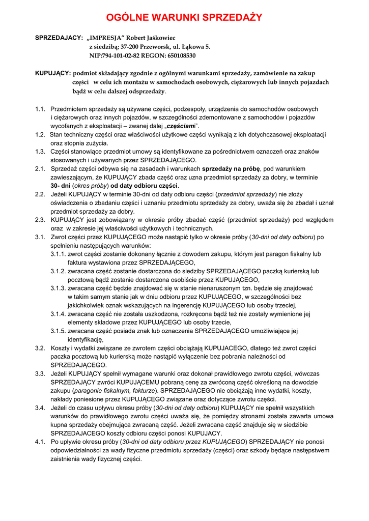 OGÓLNE WARUNKI SPRZEDAŻY SPRZEDAJACY: „IMPRESJA” Robert Jaśkowiec z siedzibą; 37-200 Przeworsk, ul. Łąkowa 5. NIP:794-101-02-82 REGON: 650108530 KUPUJĄCY: podmiot składający zgodnie z ogólnymi warunkami sprzedaży, zamówienie na zakup części w celu ich montażu w samochodach osobowych, ciężarowych lub innych pojazdach bądź w celu dalszej odsprzedaży. 1.1. Przedmiotem sprzedaży są używane części, podzespoły, urządzenia do samochodów osobowych i ciężarowych oraz innych pojazdów, w szczególności zdemontowane z samochodów i pojazdów wycofanych z eksploatacji – zwanej dalej „częściami”. 1.2. Stan techniczny części oraz właściwości użytkowe części wynikają z ich dotychczasowej eksploatacji oraz stopnia zużycia. 1.3. Części stanowiące przedmiot umowy są identyfikowane za pośrednictwem oznaczeń oraz znaków stosowanych i używanych przez SPRZEDAJĄCEGO. 2.1. Sprzedaż części odbywa się na zasadach i warunkach sprzedaży na próbę, pod warunkiem zawieszającym, że KUPUJĄCY zbada część oraz uzna przedmiot sprzedaży za dobry, w terminie 30- dni (okres próby) od daty odbioru części. 2.2. Jeżeli KUPUJĄCY w terminie 30-dni od daty odbioru części (przedmiot sprzedaży) nie złoży oświadczenia o zbadaniu części i uznaniu przedmiotu sprzedaży za dobry, uważa się że zbadał i uznał przedmiot sprzedaży za dobry. 2.3. KUPUJĄCY jest zobowiązany w okresie próby zbadać część (przedmiot sprzedaży) pod względem oraz w zakresie jej właściwości użytkowych i technicznych. 3.1. Zwrot części przez KUPUJĄCEGO może nastąpić tylko w okresie próby (30-dni od daty odbioru) po spełnieniu następujących warunków: 3.1.1. zwrot części zostanie dokonany łącznie z dowodem zakupu, którym jest paragon fiskalny lub faktura wystawiona przez SPRZEDAJĄCEGO, 3.1.2. zwracana część zostanie dostarczona do siedziby SPRZEDAJĄCEGO paczką kurierską lub pocztową bądź zostanie dostarczona osobiście przez KUPUJĄCEGO, 3.1.3. zwracana część będzie znajdować się w stanie nienaruszonym tzn. będzie się znajdować w takim samym stanie jak w dniu odbioru przez KUPUJĄCEGO, w szczególności bez jakichkolwiek oznak wskazujących na ingerencję KUPUJĄCEGO lub osoby trzeciej, 3.1.4. zwracana część nie została uszkodzona, rozkręcona bądź też nie zostały wymienione jej elementy składowe przez KUPUJĄCEGO lub osoby trzecie, 3.1.5. zwracana część posiada znak lub oznaczenia SPRZEDAJĄCEGO umożliwiające jej identyfikację, 3.2. Koszty i wydatki związane ze zwrotem części obciążają KUPUJACEGO, dlatego też zwrot części paczka pocztową lub kurierską może nastąpić wyłączenie bez pobrania należności od SPRZEDAJĄCEGO. 3.3. Jeżeli KUPUJĄCY spełnił wymagane warunki oraz dokonał prawidłowego zwrotu części, wówczas SPRZEDAJĄCY zwróci KUPUJĄCEMU pobraną cenę za zwróconą część określoną na dowodzie zakupu (paragonie fiskalnym, fakturze). SPRZEDAJĄCEGO nie obciążają inne wydatki, koszty, nakłady poniesione przez KUPUJĄCEGO związane oraz dotyczące zwrotu części. 3.4. Jeżeli do czasu upływu okresu próby (30-dni od daty odbioru) KUPUJĄCY nie spełnił wszystkich warunków do prawidłowego zwrotu części uważa się, że pomiędzy stronami została zawarta umowa kupna sprzedaży obejmująca zwracaną część. Jeżeli zwracana część znajduje się w siedzibie SPRZEDAJACEGO koszty odbioru części ponosi KUPUJACY. 4.1. Po upływie okresu próby (30-dni od daty odbioru przez KUPUJĄCEGO) SPRZEDAJĄCY nie ponosi odpowiedzialności za wady fizyczne przedmiotu sprzedaży (części) oraz szkody będące następstwem zaistnienia wady fizycznej części.