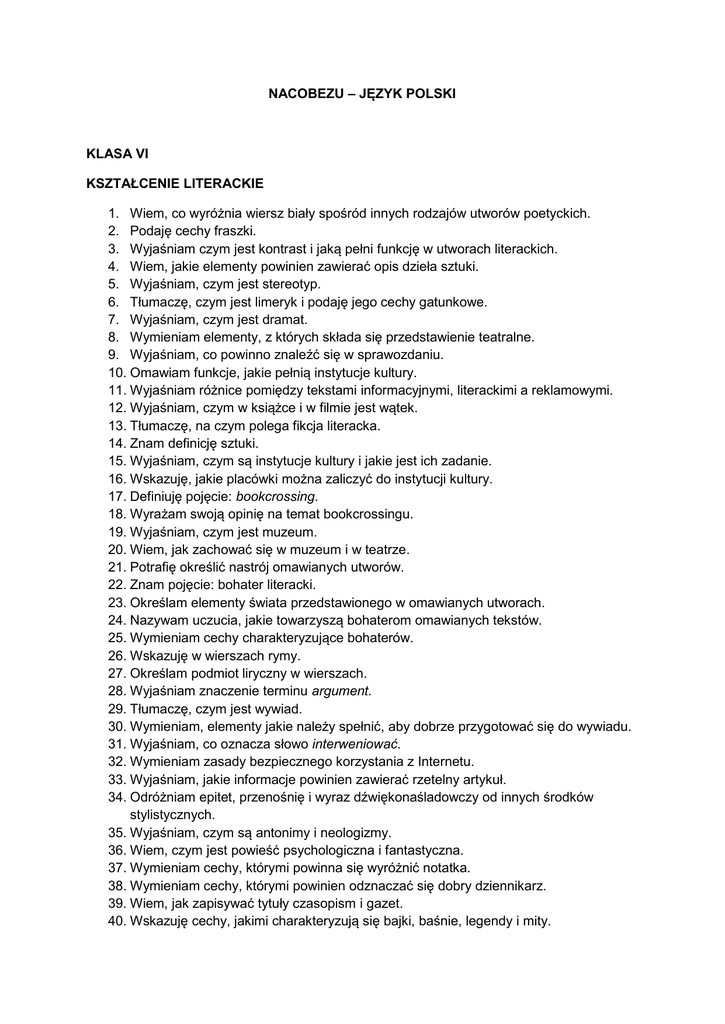 NACOBEZU – JĘZYK POLSKI KLASA VI KSZTAŁCENIE