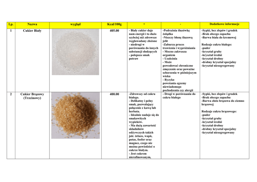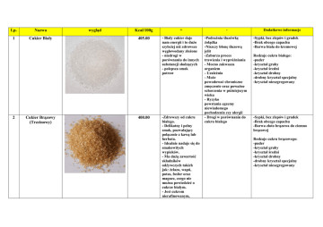 Lp. Nazwa wygląd Kcal/100g 1 Cukier Biały 405.00 2 Cukier