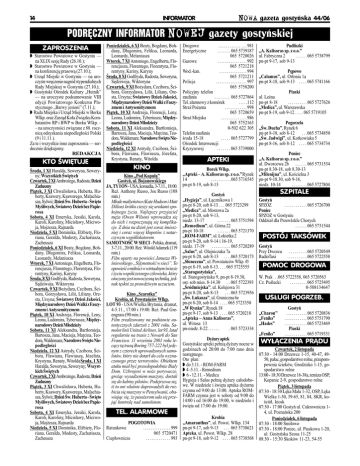 14 INFORMATOR NOWA gazeta gostyñska 44/06 PODRÊCZNY INFORMATOR NOWEJ gazety gostyñskiej ZAPROSZENIA w Starostwo Powiatowe w Gostyniu na XLIX sesjê Rady (26.10.); w Starostwo Powiatowe w Gostyniu na konferencjê prasow¹ (27.10.); w Urz¹d Miejski w Gostyniu na uroczyste wrêczenie nagród stypendialnych Rady Miejskiej w Gostyniu (27.10.); w Gostyñski Orodek Kultury Hutnik na uroczyste podsumowanie VIII edycji Powiatowego Konkursu Plastycznego Barwy jesieni (7.11.); w Rada Miejska i Urz¹d Miejski w Borku Wlkp. oraz Zarz¹d Ko³a Zwi¹zku Kombatantów RP i BWP w Borku Wlkp. na uroczystoci zwi¹zane z 88. rocznic¹ odzyskania niepodleg³oci Polski (9 i 11.11.). Za te i wszystkie inne zaproszenia serdecznie dziêkujemy. REDAKCJA KTO WIÊTUJE roda, 1 XI Haralda, Seweryna, Seweryny; Wszystkich wiêtych Czwartek, 2 XI Ambro¿ego, Radosta; Dzieñ Zaduszny Pi¹tek, 3 XI Chwalis³awa, Huberta, Huberty, Ksawery, Ksawerego, Malachiasza, Sylwii; Dzieñ w. Huberta - wiêto Myliwych, wiatowy Dzieñ bez Papierosa Sobota, 4 XI Emeryka, Jessiki, Karola, Karoli, Karoliny, Mcis³awy, Mciwoja, Moj¿esza, Rajnarda Niedziela, 5 XI Dominika, El¿biety, Floriana, Geralda, Modesty, Zachariasza, Zacheusza Poniedzia³ek, 6 XI Beaty, Bogdany, Bohdany, D³ugomira, Feliksa, Leonarda, Leonardy, Melaniusza Wtorek, 7 XI Antoniego, Engelberta, Florencjusza, Florentego, Florentyna, Florentyny, Kariny, Karyny roda, 8 XI Godfryda, Radosta, Seweryna, Sêdziwoja, Wiktoryna Czwartek, 9 XI Bo¿ydara, Czcibora, cibora, Gorzys³awa, Lilii, Liliany, Oresta, Ursyna; wiatowy Dzieñ Jakoci, Miêdzynarodowy Dzieñ Walki z Faszyzmem i Antysemityzmem Pi¹tek, 10 XI Andrzeja, Florencji, Leny, Leona, Ludomira, Tyberiusza; Miêdzynarodowy Dzieñ M³odzie¿y Sobota, 11 XI Aleksandra, Bart³omieja, Bartosza, Jana, Macieja, Marcina, Teodora, Waldemara; Narodowe wiêto Niepodleg³oci Niedziela, 12 XI Astrydy, Czcibora, cibora, Flawiana, Flawiusza, Józefata, Krystyna, Renaty, Witoldaroda, 1 XI Haralda, Seweryna, Seweryny; Wszystkich wiêtych Czwartek, 2 XI Ambro¿ego, Radosta; Dzieñ Zaduszny Pi¹tek, 3 XI Chwalis³awa, Huberta, Huberty, Ksawery, Ksawerego, Malachiasza, Sylwii; Dzieñ w. Huberta - wiêto Myliwych, wiatowy Dzieñ bez Papierosa Sobota, 4 XI Emeryka, Jessiki, Karola, Karoli, Karoliny, Mcis³awy, Mciwoja, Moj¿esza, Rajnarda Niedziela, 5 XI Dominika, El¿biety, Floriana, Geralda, Modesty, Zachariasza, Zacheusza Poniedzia³ek, 6 XI Beaty, Bogdany, Bohdany, D³ugomira, Feliksa, Leonarda, Leonardy, Melaniusza Wtorek, 7 XI Antoniego, Engelberta, Florencjusza, Florentego, Florentyna, Florentyny, Kariny, Karyny roda, 8 XI Godfryda, Radosta, Seweryna, Sêdziwoja, Wiktoryna Czwartek, 9 XI Bo¿ydara, Czcibora, cibora, Gorzys³awa, Lilii, Liliany, Oresta, Ursyna; wiatowy Dzieñ Jakoci, Miêdzynarodowy Dzieñ Walki z Faszyzmem i Antysemityzmem Pi¹tek, 10 XI Andrzeja, Florencji, Leny, Leona, Ludomira, Tyberiusza; Miêdzynarodowy Dzieñ M³odzie¿y Sobota, 11 XI Aleksandra, Bart³omieja, Bartosza, Jana, Macieja, Marcina, Teodora, Waldemara; Narodowe wiêto Niepodleg³oci Niedziela, 12 XI Astrydy, Czcibora, cibora, Flawiana, Flawiusza, Józefata, Krystyna, Renaty, Witolda Drogowe Energetyczne Gazowe Wod.-kan. Policja . . . . . . . . . . . . . . . 981 . . . . . . . 065 5739187 065 5720026 . . . . . . . . . . . . . . . . 992 065 5721218 . . . . . . . . . . . . . . . 994 065 5721211 . . . . . . . . . . . . . . . . . 997 065 5758200 Policyjny telefon zaufania . . . . . . . . 065 5727864 Tel. alarmowy z komórek . . . . .112 Stra¿ Po¿arna . . . . . . . . . . . . 998 065 5720659 Stra¿ Miejska . . . . . . . . . . . . . . 986 065 5752163 0-502 622 305 Telefon zaufania roda 15-18 . . . . . 065 5727799 Orodek Interwencji Kryzysowej . . . . . . . 065 5739000 Pudliszki A. Kalisoras sp. z o.o. ul. Fabryczna 2 . . . . . . 065 5738799 pn-pt 9-17, sob 9-13 Pêpowo Calamus, ul. Or³onia 1a pn-pt 8-18, sob 9-13 . . . . 065 5741166 Piaski ul. Lena pn-pt 8-18 . . . . . . . . . . 065 5727626 Medica, ul. Warszawska pn-pt 8-19, sob 9-12 . . . . 065 5719105 Pogorzela w. Ducha, Rynek 6 pn-pt 8-18, sob 8-12 . . .065 5734850 w. Jadwigi, ul. Kotkowiaka 5 pn-pt 8-16, sob 8-12 . . . . 065 5734734 Poniec A. Kalisoras sp. z o.o. ul. Dworcowa 2b . . . . . . 065 5731534 KINO pn-pt 8.30-18, sob 8.30-13 Borek Wlkp. Apteki A. Kalisoras sp. z o.o.Rynek Milenijna, ul. Kocielna 3 Kino Pod Kopu³¹ 14 . . . . . . . . . . .065 5716545 pn-pt 9-18.30, sob 9-16, Gostyñ, ul. Bojanowskiego niedz. 10-14 . . . . . . . . 065 5727804 JA, TY I ON - USA, komedia, 3-7.11., 18:00. pn-pt 8-19, sob 8-13 Re¿. Anthony Russo, Joe Russo (108 SZPITALE Gostyñ min.) Gostyñ M³ode ma³¿eñstwo (Kate Hudson i Matt Hygieja, ul. £¹cznikowa 1 SPZOZ . . . . . . . . . . . . 065 5726700 Dillon) krótko cieszy siê urokami spo- pn-pt 8-20, sob 8-13 . . . 065 5723299 Poniec kojnego ¿ycia. Najlepszy przyjaciel Medica, ul. Mostowa 2a SPZOZ w Gostyniu mê¿a (Owen Wilson) wprowadza siê pn-pt 8-20, sob 9-13, . . . . . . . 065 5751594 Oddzia³ dla Przewlekle Chorych do nich i rozpoczynaj¹ siê komplika- niedz. 13-17 . . . . . . 065 5731544 cje. Z dnia na dzieñ jest coraz miesz- Remedium, ul. Górna 22 . . . . . . . 065 5721370 niej i coraz wiêcej k³opotów z natar- pn-pt 10-18 ROM-FARM, ul. £okietka 2 POSTÓJ TAKSÓWEK czywym wspó³lokatorem. SAMOTNOÆ W SIECI - Polska, dramat, pn-pt 9-20, sob 9-14 i 16-19, 3-7.11., 20:00. Re¿. Witold Adamek (119 niedz. 17-19 . . . . . . . . . . 065 5720289 Gostyñ Przy Dworcu . . . . . . . . . .065 5720549 Salus, ul. Olejniczaka 7a min.) . . . . . . . . . . .065 5722558 Film oparty na powieci Janusza Wi- pn-pt 8-20, sob 8-13 . . . .065 5720173 RadioTaxi niewskiego S@motnoæ w sieci. To S³oneczna, ul. Powstañców Wlkp. 45 POMOC DROGOWA opowieæ o mi³oci w wirtualnym wiecie pn-pt 8-19, sob 8-13. . . . 065 5725555 Starogostyñska, i ¿yciu wspó³czesnego cz³owieka, który W. Ptak . .065 5722558, 065 5720563 otoczony jest nowoczesn¹ technik¹, jed- ul. Starogos