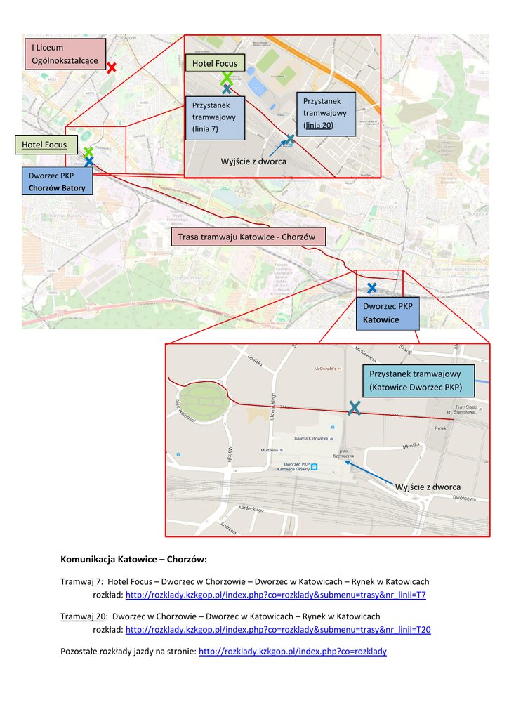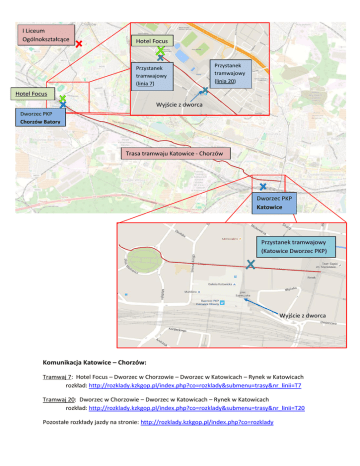 I Liceum Ogólnokształcące Hotel Focus Przystanek tramwajowy (linia 7) Przystanek tramwajowy (linia 20) Hotel Focus Wyjście z dworca Dworzec PKP Chorzów Batory Trasa tramwaju Katowice - Chorzów Dworzec PKP Katowice Przystanek tramwajowy (Katowice Dworzec PKP) Wyjście z dworca Komunikacja Katowice – Chorzów: Tramwaj 7: Hotel Focus – Dworzec w Chorzowie – Dworzec w Katowicach – Rynek w Katowicach rozkład: http://rozklady.kzkgop.pl/index.php?co=rozklady&submenu=trasy&nr_linii=T7 Tramwaj 20: Dworzec w Chorzowie – Dworzec w Katowicach – Rynek w Katowicach rozkład: http://rozklady.kzkgop.pl/index.php?co=rozklady&submenu=trasy&nr_linii=T20 Pozostałe rozkłady jazdy na stronie: http://rozklady.kzkgop.pl/index.php?co=rozklady