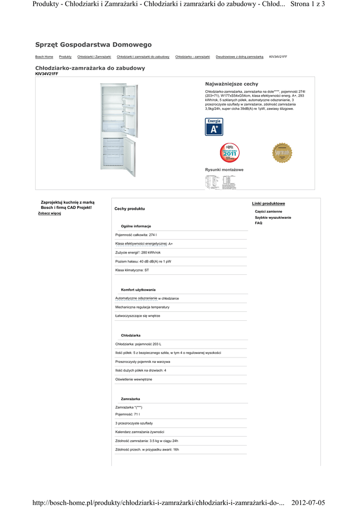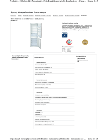 Produkty - Chłodziarki i Zamrażarki - Chłodziarki i zamrażarki do zabudowy - Chłod... Strona 1 z 3 Sprzęt Gospodarstwa Domowego Bosch Home Produkty Chłodziarki i Zamrażarki Chłodziarki i zamrażarki do zabudowy Chłodziarko - zamrażarki Dwudrzwiowe z dolną zamrażarką KIV34V21FF Chłodziarko-zamrażarka do zabudowy KIV34V21FF Najważniejsze cechy Chłodziarko-zamrażarka, zamrażarka na dole****, pojemność 274l (203+71), W177xS54xG54cm, klasa efektywności energ. A+, 293 kWh/rok, 5 szklanych półek, automatyczne odszranianie, 3 przezroczyste szuflady w zamrażarce, zdolność zamrażania 3,5kg/24h, super cicha 39dB(A) re 1pW, zawiasy ślizgowe. Rysunki montażowe Zaprojektuj kuchnię z marką Bosch i firmą CAD Projekt! Linki produktowe Cechy produktu Zobacz więcej Części zamienne Szybkie wyszukiwanie Ogólne informacje FAQ Pojemność całkowita: 274 l Klasa efektywności energetycznej: A+ Zużycie energii¹: 280 kWh/rok Poziom hałasu: 40 dB dB(A) re 1 pW Klasa klimatyczna: ST Komfort użytkowania Automatyczne odszranianie w chłodziarce Mechaniczna regulacja temperatury Łatwoczyszczące się wnętrze Chłodziarka Chłodziarka: pojemność 203 L Ilość półek: 5 z bezpiecznego szkła, w tym 4 o regulowanej wysokości Przezroczysty pojemnik na warzywa Ilość dużych półek na drzwiach: 4 Oświetlenie wewnętrzne Zamrażarka Zamrażarka *(***) Pojemność: 71 l 3 przezroczyste szuflady Kalendarz zamrażania żywności Zdolność zamrażania: 3.5 kg w ciągu 24h Zdolność przech. w przypadku awarii: 16h http://bosch-home.pl/produkty/chłodziarki-i-zamrażarki/chłodziarki-i-zamrażarki-do-... 2012-07-05 Produkty - Chłodziarki i Zamrażarki - Chłodziarki i zamrażarki do zabudowy - Chłod... Strona 2 z 3 Parametry techniczne Drzwi zamocowane prawostronnie, z możliwością zamiany strony Wymiary urządzenia²: W 177,2 cm x S 54,1 cm x G 54,5 cm Wymiary niszy do zabudowy W x S x G: 177,5 cm x 56,2 cm x 55,0 cm Wyposażenie pojemnik na jajka ¹W oparciu o standardowy, 24-godzinny test ²W celu osiągnięcia podanych wartości zużycia energii, należy zachować minimalny odstęp 3,5 cm między tyłem chłodziarki a ścianą, co należy uwzględnić przy planowaniu wymiarów niszy. Bez zachowania minimalnego odstępu funkcjonalność urządzenia nie zmieni się, zwiększy się nieznacznie zużycie energii Specyfikacje techniczne Ogólne funkcje Klasa efektywności energetycznej nowość (2010/30/EC) A+ Instrukcja obsługi Pobierz Ściągnij kartę produktu wg wytycznych UE Sprzęt do zabudowy Inspirująca technologia w doskonałej formie. Oferta 2012Interaktywny katalog eBook Ściągnij PDF (30687 KB) Na czym polega NoFrost i czy obejmuje obydwie komory? System NoFrost obejmuje zarówno komorę chłodziarki, jak i zamrażarki. Jest to automatyka odszraniania i odmrażania. Dzięki temu systemowi, za pomocą cyrkulacji powietrza, usuwana jest wilgoć, która naturalnie gromadzi się wewnątrz chłodziarko-zamrażarki. Wilgoć odprowadzona zostaje do specjalnego pojemnika znajdującego się za tylną ścianą urządzenia. Tam zamienia się w lód, który topnieje pod wpływem ciepła wydzielanego przez agregat. Powstała w tej sposób woda wyparowuje. Dzięki temu wnętrze urządzenia, a także produkty przechowywane w zamrażalniku nigdy nie pokryją się lodem ani szronem, a zamrażarki nie trzeba będzie nigdy więcej rozmrażać. Jak działa Chiller Safe? Chiller Safe to specjalna strefa, gdzie panuje temperatura o ok. 3°C niższa niż w pozostałej części chłodzącej. http://bosch-home.pl/produkty/chłodziarki-i-zamrażarki/chłodziarki-i-zamrażarki-do-... 2012-07-05 Produkty - Chłodziarki i Zamrażarki - Chłodziarki i zamrażarki do zabudowy - Chłod... Strona 3 z 3 Gwarantuje ona utrzymanie świeżości szczególnie delikatnych produktów, takich jak mięso i ryby. Co to jest VitaFresh? VitaFresh to wydzielona komora świeżości z temperaturą bliską 0°C, skutecznie hamująca procesy biologicznochemiczne zachodzące w świeżej żywności. Zapewnia trzykrotnie dłuższy czas przechowywania i stwarza idealne warunki dla produktów o różnych wymaganiach, gdyż jest ona podzielona na strefę wilgotną (95%) i suchą (50%). W szufladzie o wilgotności 50% najdłużej zachowają swoje właściwości wędliny, mięso, ryby i nabiał. W szufladzie strefy wilgotnej należy przechowywać warzywa i owoce (przy wilgotności sięgającej 95%). Co to jest system Etagen-Frost? System Etagen-Frost polega na równomiernym rozprowadzeniu zimnego powietrza w komorze zamrażarki, co ma duży wpływ na oszczędność energii. Czym różnią się w zabudowie zawiasy ślizgowe od zawiasów płaskich? W zabudowie urządzeń chłodniczych wyróżniamy zawiasy ślizgowe, których mechanizm zakłada montaż frontu na prowadnicach. Chłodziarki z zawiasami ślizgowymi narzucają konieczność montażu zawiasów dla frontów meblowych. Chłodziarko-zamrażarki z zawiasami płaskimi posiadają jedną parę zawiasów, które zapewniają bardzo funkcjonalne otwierania urządzenia. Przy takich zawiasach front meblowy montujemy bezpośrednio do frontu urządzenia. Czy chłodziarki typu Side-by-Side można zabudować w ciągu mebli? Modele Side-by-Side można wstawić w ciąg meblowy. Chłodnictwo wolnostojące wymaga jednocześnie odpowiedniej wentylacji, dlatego wstawienie w zabudowę wymaga ciągu cyrkulacyjnego. Instrukcja montażu określa szczegóły zabudowy z zachowaniem odstępów we wnęce. Jaka jest różnica między wykończeniem INOX / srebrny, a wykończeniem w stali szlachetnej w chłodziarkach wolnostojących? Chłodziarki wolnostojące mogą być wykończone na 3 sposoby: 1. Stal szlachetna jest powłoką wysokiej jakości i jednocześnie bardzo elegancką. Zazwyczaj stosuję się na niej powłokę AntiFingerprint, na której nie pozostają odciski palców. 2. Inox: jest to chrom szczotkowany, który stanowi bardzo dobra formę imitacji stali szlachetnej i sam jest j