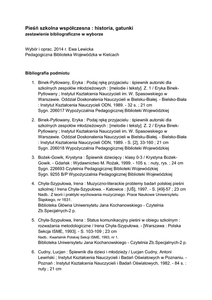Pieśń szkolna współczesna : historia, gatunki zestawienie bibliograficzne w wyborze Wybór i oprac. 2014 r. Ewa Lewicka Pedagogiczna Biblioteka Wojewódzka w Kielcach Bibliografia podmiotu 1. Binek-Pytlowany, Eryka : Podaj rękę przyjacielu : śpiewnik autorski dla szkolnych zespołów młodzieżowych : [melodie i teksty]. Z. 1 / Eryka BinekPytlowany ; Instytut Kształcenia Nauczycieli im. W. Spasowskiego w Warszawie. Oddział Doskonalenia Nauczycieli w Bielsku-Białej. - Bielsko-Biała : Instytut Kształcenia Nauczycieli ODN, 1989. - 32 s. ; 21 cm Sygn. 206017 Wypożyczalnia Pedagogicznej Biblioteki Wojewódzkiej 2. Binek-Pytlowany, Eryka : Podaj rękę przyjacielu : śpiewnik autorski dla szkolnych zespołów młodzieżowych : [melodie i teksty]. Z. 2 / Eryka BinekPytlowany ; Instytut Kształcenia Nauczycieli im. W. Spasowskiego w Warszawie. Oddział Doskonalenia Nauczycieli w Bielsku-Białej. - Bielsko-Biała : Instytut Kształcenia Nauczycieli ODN, 1989. - S. [2], 33-160 ; 21 cm Sygn. 206018 Wypożyczalnia Pedagogicznej Biblioteki Wojewódzkiej 3. Bożek-Gowik, Krystyna : Śpiewnik dziecięcy : klasy 0-3 / Krystyna BożekGowik. - Gdańsk : Wydawnictwo M. Rożak, 1999. - 105 s. : nuty, rys. ; 24 cm Sygn. 226693 Czytelnia Pedagogicznej Biblioteki Wojewódzkiej Sygn. 9255 B/P Wypożyczalnia Pedagogicznej Biblioteki Wojewódzkiej 4. Chyła-Szypułowa, Irena : Muzyczno-literackie problemy badań polskiej pieśni szkolnej / Irena Chyła-Szypułowa. - Katowice : [UŚ], 1997. - S. [49]-57 ; 23 cm Nadb.: Z teorii i praktyki wychowania muzycznego. Prace Naukowe Uniwersytetu Śląskiego, nr 1631. Biblioteka Główna Uniwersytetu Jana Kochanowskiego - Czytelnia Zb.Specjalnych-2 p. 5. Chyła-Szypułowa, Irena : Status komunikacyjny pieśni w obiegu szkolnym : rozważania metodologiczne / Irena Chyła-Szypułowa. - [Warszawa : Polska Sekcja ISME, 1993]. - S. 103-109 ; 23 cm Nadb.: Kwartalnik Polskiej Sekcji ISME, 1993, nr 1. Biblioteka Uniwersytetu Jana Kochanowskiego - Czytelnia Zb.Specjalnych-2 p. 6. Cudny, Lucjan : Śpiewnik dla dzieci i młodzieży / Lucjan Cudny, Antoni Lewiński ; Instytut Kształcenia Nauczycieli i Badań Oświatowych w Poznaniu. Poznań : Instytut Kształcenia Nauczycieli i Badań Oświatowych, 1982. - 84 s. : nuty ; 21 cm Zawiera piosenki jednogłosowe z akompaniamentem oraz pieśni chóralne trzy i czterogłosowe. Sygn. 171529 Wypożyczalnia Pedagogicznej Biblioteki Wojewódzkiej 7. Hundziak, Andrzej : Piosenki dla Agatki : piosenki dla dzieci na głos z fortepianem / Andrzej Hundziak, Edward Pałłasz, Romuald Twardowski. Warszawa : Wydawnictwa Szkolne i Pedagogiczne, 1998. - 134, [2] s. : rys. ; 29 cm Sygn. 224727 Czytelnia Pedagogicznej Biblioteki Wojewódzkiej 8. Nowosad, Janusz : Sercem za serce : śpiewnik dla dzieci / słowa i muzyka Janusz Nowosad ; Centrum Doskonalenia Nauczycieli im. Władysława Spasowskiego. Oddział w Lublinie. - Lublin : Centrum Doskonalenia Nauczycieli. Oddział, 1989. - 27, [1] s. ; 21 cm Śpiewnik. Sygn. 205212 Wypożyczalnia Pedagogicznej Biblioteki Wojewódzkiej 9. Pieśni dawnej Kielecczyzny. T. 1 / zebr. i oprac. Jerzy Gumuła. - Kielce : Wojewódzki Dom Kultury im. Józefa Piłsudskiego : Świętokrzyskie Biuro Rozwoju Regionalnego. Regionalny Sekretariat Krajowej Sieci Obszarów Wiejskich, 2010. - 547 s. : fot., il., mapy ; 30 cm Zawiera, m.in. Regiony - pojęcia podstawowe, konfiguracje gospodarcze, społeczne i terytorialne, podstawowe funkcje / Ryszard Zięzio ; Dzieje i charakterystyka śpiewu ludowego na Kielecczyźnie / Jerzy Szczyrba ; Kilka uwag o zapisie tekstów piosenek ludowych i ich języku / Stanisław Cygan ; Śpiewnik. Sygn. 249006 Czytelnia Pedagogicznej Biblioteki Wojewódzkiej Sygn. A 249007 Wypożyczalnia Pedagogicznej Biblioteki Wojewódzkiej 10. Pieśni dla chórów szkolnych na trzy głosy mieszane / zebrała Maria Wacholc. - Warszawa : Wydawnictwa Szkolne i Pedagogiczne, 1989. - 174, [2] s. ; 30 cm. - Bibliogr. s. [176] Sygn. 203617, 203618 Wypożyczalnia Pedagogicznej Biblioteki Wojewódzkiej 11. Pieśni i piosenki ludowe Kielecczyzny / [oprac. tekstów Stanisław Durlej ; zapis nut słów pieśni i piosenek Adam Chamerski]. - Kielce : Ludowe Towarzystwo Naukowo-Kulturalne. Oddział, 1997. - 266 s., [24] s. tabl. : fot. (gł. kolor.), nuty, 2 portr. ; 21 cm Sygn. 246578 Czytelnia Pedagogicznej Biblioteki Wojewódzkiej Sygn. 246579 Wypożyczalnia Pedagogicznej Biblioteki Wojewódzkiej 12. Piosenki z festiwalu Do, Re, Mi / [red. merytor. Alicja Twardowska]. Warszawa : Wydawnictwa Szkolne i Pedagogiczne, 1997. - 60, [1] s. ; 29 cm Utwory z VI Ogólnopolskiego Festiwalu Twórczości Muzycznej dla Dzieci i Młodzieży "Do-Re-Mi". Sygn. 224708 Czytelnia Pedagogicznej Biblioteki Wojewódzkiej 13. Podgórski, Wojciech Jerzy : Skąd nasz ród : polskie pieśni hymniczne / Wojciech Jerzy Podgórski ; [Ministerstwo Edukacji Narodowej]. Warszawa : "Interlibro", 1991. - 211, [1] s. : nuty, rys. ; 21 cm. - Bibliogr. s. 133 Śpiewnik, wyd. łącznie z kasetą. Sygn. 209730 Czytelnia Pedagogicznej Biblioteki Wojewódzkiej Sygn. 218198, 218199 Wypożyczalnia Pedagogicznej Biblioteki Wojewódzkiej 14. Smoczyńska-Nachtman, Urszula : Piosenki na słońce i deszcz : śpiewnik na jednogłosowy chór dziecięcy [z fort. / wybór i oprac. Urszula SmoczyńskaNachtman, Tomasz Choraczyński]. - Warszawa : Wydawnictwa Szkolne i Pedagogiczne, 1989. - 90, [2] s. : rys. ; 29 cm Sygn. 202552 Wypożyczalnia Pedagogicznej Biblioteki Wojewódzkiej 15. Sołtysik, Włodzimierz : Kolędy dla chórów szkolnych / Włodzimierz Sołtysik, Marcin Łukasz Mazur ; [il. Andrzej Kopka]. - Warszawa : Wydawnictwa Szkolne i Pedagogiczne, 1999. - 206 s. : il. ; 24 cm Kolędy i pastorałki opracowania dwugłosowe, opracowania trzygłosowe. Komentarz. Sygn. 227465 Czytelnia Pedagogicznej Biblioteki Wojewódzkiej 16. Szczyrba, Jerzy : Piosenki dla dzieci i młodzieży / Jerzy Szczyrba. - Kielce : Wydawnictwo Akademii Świętokrzyskiej, 2006. - 149, [1] 