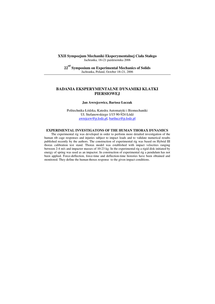 XXII Sympozjum Mechaniki Eksperymentalnej Ciađa Stađego Jachranka, 18÷21 października 2006 nd 22 Symposium on Experimental Mechanics of Solids Jachranka, Poland, October 18÷21, 2006 BADANIA EKSPERYMENTALNE DYNAMIKI KLATKI PIERSIOWEJ Jan Awrejcewicz, Bartosz Đuczak Politechnika Đódzka, Katedra Automatyki i Biomechaniki Ul. Stefanowskiego 1/15 90-924 Đódź [email protected], [email protected] EXPERIMENTAL INVESTIGATONS OF THE HUMAN THORAX DYNAMICS The experimental rig was developed in order to perform more detailed investigation of the human rib cage responses and injuries subject to impact loads and to validate numerical results published recently by the authors. The construction of experimental rig was based on Hybrid III thorax calibration test stand. Thorax model was established with impact velocities ranging between 2-4 m/s and impactor masses of 10-23 kg. In the experimental rig a rigid disk initiated by energy of spring was used as an impactor. In construction of experimental rig a pendulum has not been applied. Force-deflection, force-time and deflection-time histories have been obtained and monitored. They define the human thorax response to the given impact conditions. 1. Wprowadzenie Urazy klatki piersiowej stanowią okođo 29 procent wszystkich poważnych lub śmiertelnych obrażeń odnoszonych przez osoby uczestniczące w wypadkach drogowych. Ograniczenie ilości ciężkich (lub bardzo ciężkich) przypadków obrażeń klatki piersiowej, jest możliwe jedynie poprzez rozwijanie już istniejących oraz wprowadzanie nowych systemów bezpieczeństwa biernego. Koncerny samochodowe, aby sprostać temu wyzwaniu stosują w swoich badaniach manekiny ATD1, które z możliwie największą dokđadnością mają odzwierciedlać zachowanie ciađa czđowieka podczas zderzenia. Zapewnienie „największej dokđadności”, określane w literaturze naukowej terminem biozgodności, wymaga przeprowadzenia dla każdego typu manekina szeregu testów porównawczych. Za biozgodnego uznawane są jedynie te manekiny, których odpowiedź jest porównywalna z odpowiedzią ciađa czđowieka na taki sam charakter obciążeń (zarówno statycznych jaki i dynamicznych). Bardzo istotnym kryterium biozgodności manekina do testów zderzeniowych czođowych jest test odpowiedzi klatki piersiowej na uderzenie. Ze względu na ograniczenia techniczne wszystkie dotychczasowe typy manekinów zostađy zoptymalizowane tylko dla szczególnych warunków uderzenia. 1 ATD - z ang. Anthropometric Test Device 7 XXII Sympozjum Mechaniki Eksperymentalnej Ciađa Stađego Jachranka, 18÷21 października 2006 nd 22 Symposium on Experimental Mechanics of Solids Jachranka, Poland, October 18÷21, 2006 MONITOROWANIE I SYMULACJA DEFEKTU W KOMPOZYTOWYCH OBIEKTACH CYLINDRYCZNYCH Wojciech Bđażejewski, Paweđ Gąsior, Aleksander Przygoda Instytut Materiađoznawstwa i Mechaniki Technicznej, Politechnika Wrocđawska, ul. Smoluchowskiego 25, 50-370 Wrocđaw MONITORING AND SIMULATION OF A DEFECT IN A COMPOSITE CYLINDRICAL OBJECTS Experimental tests were conducted on a cylindrical long fiber composite object. The purpose of these tests were to verify the efficiency of the optical monitoring system of the macroscopic defect, which is created in result of composite layer damage concentration. The composite layer of the tested object was unidirectional circumferential carbon fiber reinforced composite in a epoxy matrix. The sensitivity of the optical monitoring system were determined and were compared with the one from numerical simulation for the same angle of composite layers. Then the numerical simulations for the big range of composite layer angles were conducted, for this purpose a cluster of 17 computers were used. 1. Wstęp Elementy konstrukcyjne wykonane z materiađów kompozytowych (np.: zbiorniki i rury wysokociśnieniowe, wirniki elektrowni wiatrowych) wymagają okresowej lub ciągđej kontroli stanu technicznego, która zapewni wysoki poziom bezpieczeństwa w trakcie ich eksploatacji. Fakt ten wymusza stosowanie systemów czujnikowych, które będą w stanie monitorować cađą konstrukcję i wykrywać pojawiające się defekty w ich wczesnym stadium. Szczególnie przydatnymi do tego celu okazują się być czujniki światđowodowe. Mogą być one wbudowane w strukturę materiađu kompozytowego, bez zmiany jego parametrów wytrzymađościowych, a ponadto cechują się dużą czuđością na zmianę czynników zewnętrznych, takich jak odksztađcenia czy temperatura [1]. W prezentowanej pracy przedstawiona zostanie aplikacja różnego rodzaju czujników światđowodowych do monitorowania defektów w rurze wykonanej z kompozytu węglowo-epoksydowego. Punktowa deformacja warstwy kompozytowej powoduje wzrost lokalnych naprężeń w obwodowo nawiniętej strukturze oraz modulację fali świetlnej propagowanej w gđowicach pomiarowych. Przeprowadzone badania miađy na celu wyznaczenie odpowiedzi czujników na lokalne odksztađcenia materiađu kompozytowego oraz wyznaczenie optymalnej odlegđości pomiędzy nimi. 13 XXII Sympozjum Mechaniki Eksperymentalnej Ciađa Stađego Jachranka, 18÷21 października 2006 nd 22 Symposium on Experimental Mechanics of Solids Jachranka, Poland, October 18÷21, 2006 BADANIA DOŚWIADCZALNE I MODELOWANIE REAKCJI STOPU PA2 NA DZIAĐANIE WIELOOSIOWYCH OBCIĄŻEŃ ZEWNETRZNYCH Andrzej Buczyński Politechnika Warszawska, Instytut maszyn Roboczych Ciężkich ul. Narbutta 84, 02-524 Warszawa, tel. 0-22-660-8795 Wojciech Kocańda Politechnika Warszawska, Instytut Podstaw Budowy Maszyn ul. Narbutta 84, 02-524 Warszawa An attempt to predict material behavior under non-proportional loads was made in the paper. A special attention was paid to plastic strain evolution while constant tension-symmetric shear, and constant shear-symmetric tension-compression loads were applied to tubular samples. The incremental cyclic plasticity model considering kinematic hardening and gradient plastic flow rule were used. Th