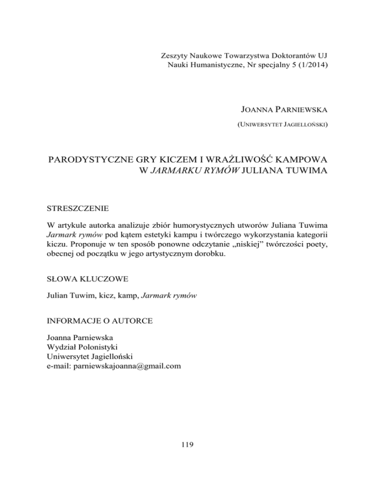 Zeszyty Naukowe Towarzystwa Doktorantów UJ Nauki Humanistyczne, Nr specjalny 5 (1/2014) JOANNA PARNIEWSKA (UNIWERSYTET JAGIELLOŃSKI) PARODYSTYCZNE GRY KICZEM I WRAŻLIWOŚĆ KAMPOWA W JARMARKU RYMÓW JULIANA TUWIMA STRESZCZENIE W artykule autorka analizuje zbiór humorystycznych utworów Juliana Tuwima Jarmark rymów pod kątem estetyki kampu i twórczego wykorzystania kategorii kiczu. Proponuje w ten sposób ponowne odczytanie „niskiej” twórczości poety, obecnej od początku w jego artystycznym dorobku. SŁOWA KLUCZOWE Julian Tuwim, kicz, kamp, Jarmark rymów INFORMACJE O AUTORCE Joanna Parniewska Wydział Polonistyki Uniwersytet Jagielloński e-mail: [email protected] 119 Joanna Parniewska __________________________________________________________________________________________________________________________________________________________________________________________________________________________________ To, iż „kult piękna wśród ludu pozbawionego arystokracji musiał – zgodnie z przewidywaniami Baudelaire’a – ulec zepsuciu” i dandyzm nie zachował się jako zjawisko, nie oznacza wcale, że zanikł on bez echa. Dokonując utożsamienia duchowości i stylu, tak w ubiorze i zachowaniu, jak i w sztuce, zapowiedział to, co leży u podstaw naszych czasów – obsesję indywidualnego wyrazu i jego prymat nad treścią. To, iż może on być nadrzędny wobec „przymiotów umysłu” czy „wartości moralnej”, nie budzi dziś większego zdziwienia1. Rysunek Władysława Daszewskiego na obwolucie pierwszego wydania tomu Jarmark rymów Juliana Tuwima z 1934 roku w sposób karykaturalny przedstawia autora jako wyfraczonego, mieszczańskiego eleganta czy fircyka. Charakterystyczne znamię na lewym policzku nie pozostawia wątpliwości, że ów kawiarniany dandys, z nonszalancją wypuszczający obłoczki dymu, to sam Tuwim. Niemało w tym autoironii pisarza, gdyż ten „arcybarwny konterfekt autora” – jak określił rysunek Daszewskiego – doskonale wpasowałby się do „wykwintu kokociego cukiernianej atmosfery”2, którego opis, utrzymany w konwencji groteski, znajdziemy w wierszu W cukierni. Specyficzna ironia i autoironia, obok różnych odmian parodii, groteski i karykaturalnych rearanżacji stylistycznych, tworzą rodzaj pstrokatego kolażu, który – jak wskazuje tytuł tomu – odwołuje się do estetyki jarmarku. We wstępie do omawianej książki autor zaznacza, że jest to […] wybór utworów z innego ducha i w innym klimacie poetyckim poczętych, a na przestrzeni dwudziestu lat pisanych. […] Przeważają tu na ogół rzeczy satyryczne (znów chwiejny i rozciągły termin!), często z przebrzmiałą nutą aktualności związane, niekiedy zaś z dłuższym i trwalszym zasięgiem3. Już ten komentarz wskazuje na specyfikę tomu, jego odmienność względem dotąd wydanych, i zarazem uwzględnia jego wewnętrzne zróżnicowanie4. Cechy te 1 R. Okulicz-Kozaryn, Mała historia dandyzmu, Poznań 1995, s. 138–139. J. Tuwim, W cukierni, [w:] idem, Jarmark rymów, Warszawa 1991, s. 113 (dalej JR). 3 Idem, Od autora, [w:] JR, 5. 4 Także sam fakt zamieszczenia przedmowy świadczy o wyjątkowości Jarmarku rymów, o czym wspomina Tomasz Stępień, dodając, że w wydanych dotąd tomach nie pojawiały się tego typu słowa wstępu. Badacz tłumaczy, że były one skierowane zarówno do odbiorców przyzwyczajonych do Tuwima w roli „poety kanonicznego”, jak i tych, którzy znali go głównie jako dostawcę repertuaru dla warszawskich kabaretów. Stępień zauważa także, że odrębność tomu na tle dotychczasowej twórczości poety została zasygnalizowana semantyką tytułu: „jarmark – pisze badacz – to instytucja użytkowa i rytualna do pewnego stopnia, trywialna i odświętna, obejmująca różne przestrzenie psychospołeczne; rym to najbardziej popularny i elementarny zarazem wyznacznik poetyckości”. T. Stępień, O satyrze skamandryckiej (Wokół „Wstępu” do Jarmarku rymów” Juliana Tuwima), [w:] idem, O satyrze, Katowice 1996, s. 257. 2 120 Parodystyczne gry kiczem i wrażliwość kampowa... __________________________________________________________________________________________________________________________________________________________________________________________________________________________________ łączą się ze zjawiskiem jarmarku, którego zasadą – jak pisze Joanna Ślósarska w pracy Idea jarmarczności w kulturze: […] jest manifestacja w wybranym miejscu wielości, różnorodności, unikalności, w tym dopuszczalnej hybrydalności rzeczy wystawionych na sprzedaż […] przy czym jarmarczna wystawność i splendor wszelkich rzeczy stanowi połączenie tego, co elementarne i niezbędne w codzienności, z tym, co stanowi naddatek zaspokajający potrzebę zabawy, dekoracji, przepychu i przesytu 5. Słowa te – jak sądzę – mogłyby z powodzeniem dopełniać wyżej zacytowany odautorski komentarz. Istotne w powyższej definicji jest odniesienie do praw handlu (lub właściwie należałoby powiedzieć – kramarstwa), akcentujące komercjalny i konsumpcyjny wymiar sprzedaży jarmarcznej, co z kolei wiąże się z szeroko rozumianym zjawiskiem kiczu. Należy podkreślić, że Tuwim od początku swojej biografii artystycznej łączył twórczość zwaną wysoką (utwory liryczne) z tą kojarzoną jako niska (szlagiery, melorecytacje, monologi, skecze szmoncesowe i scenki rodzajowe związane z bieżącymi wydarzeniami). „Rzeczy satyryczne” – by powrócić raz jeszcze do wstępu Od autora – zdaniem Tomasza Stępnia lokalizują się między „«chcianą» i prestiżową liryką a wstydliwą, choć do życia (dość wygodnego) konieczną, seryjną i komercyjną produkcją estradową”6. Wynika z tego, że reguły funkcjonowania rynku wydawniczego były Tuwimowi dobrze znane. W tym samym czasie pisał kunsztowne utwory nawiązujące do wzorców klasycznych i te ludyczne, spod znaku „podkasanej 