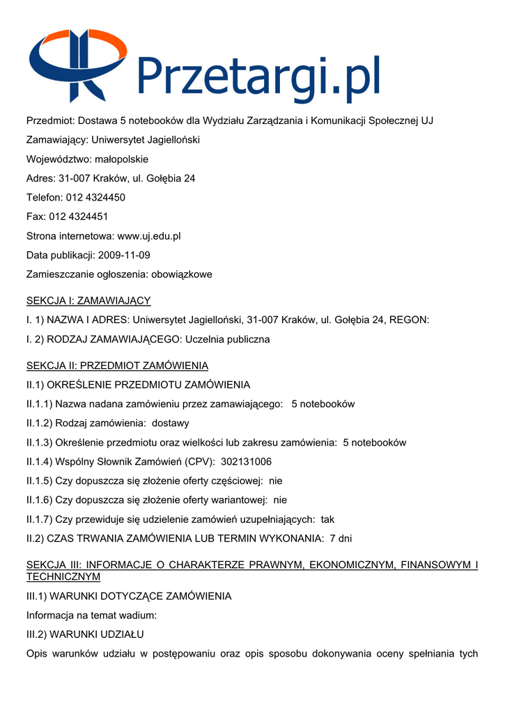 Przedmiot: Dostawa 5 notebooków dla Wydziału Zarządzania i Komunikacji Społecznej UJ Zamawiający: Uniwersytet Jagielloński Województwo: małopolskie Adres: 31-007 Kraków, ul. Gołębia 24 Telefon: 012 4324450 Fax: 012 4324451 Strona internetowa: www.uj.edu.pl Data publikacji: 2009-11-09 Zamieszczanie ogłoszenia: obowiązkowe SEKCJA I: ZAMAWIAJĄCY I. 1) NAZWA I ADRES: Uniwersytet Jagielloński, 31-007 Kraków, ul. Gołębia 24, REGON: I. 2) RODZAJ ZAMAWIAJĄCEGO: Uczelnia publiczna SEKCJA II: PRZEDMIOT ZAMÓWIENIA II.1) OKREŚLENIE PRZEDMIOTU ZAMÓWIENIA II.1.1) Nazwa nadana zamówieniu przez zamawiającego: 5 notebooków II.1.2) Rodzaj zamówienia: dostawy II.1.3) Określenie przedmiotu oraz wielkości lub zakresu zamówienia: 5 notebooków II.1.4) Wspólny Słownik Zamówień (CPV): 302131006 II.1.5) Czy dopuszcza się złożenie oferty częściowej: nie II.1.6) Czy dopuszcza się złożenie oferty wariantowej: nie II.1.7) Czy przewiduje się udzielenie zamówień uzupełniających: tak II.2) CZAS TRWANIA ZAMÓWIENIA LUB TERMIN WYKONANIA: 7 dni SEKCJA III: INFORMACJE O CHARAKTERZE PRAWNYM, EKONOMICZNYM, FINANSOWYM I TECHNICZNYM III.1) WARUNKI DOTYCZĄCE ZAMÓWIENIA Informacja na temat wadium: III.2) WARUNKI UDZIAŁU Opis warunków udziału w postępowaniu oraz opis sposobu dokonywania oceny spełniania tych warunków: 1. Wykonawca musi spełniać warunki udziału w postępowaniu określone w niniejszej SIWZ oraz w art. 22 ustawy PZP, jak też nie może podlegać wykluczeniu na pod?stawie art. 24 ustawy PZP. 2. Wykonawca musi zaoferować przedmiot zamówienia zgodny z wymogami zamawiającego, określonymi w SIWZ oraz zapewnić realizację zamówienia we wskazanym w pkt 4) SIWZ terminie. 3. Całość sprzętu objętego niniejszym zamówieniem musi spełniać wymogi normy CE. 4. Wykonawca musi przedstawić cenę oferty w oparciu o załącznik A do SIWZ dla całości przedmiotu zamówienia, przy uwzględnieniu wymagań i zapisów niniejszej SIWZ i doświadczenia zawodowego wykonawcy. 5. Wykonawca powinien podpisać oraz wypełnić formularz oferty wraz z załącznikami lub złożyć ofertę odpowiadającą ich treści, jak i podpisać wzór umowy, stanowiące integralną część SIWZ. 6. Wykonawca musi dołączyć do oferty wszystkie oświadczenia oraz załączniki wymagane SIWZ. Informacja o oświadczeniach i dokumentach, jakie mają dostarczyć wykonawcy w celu potwierdzenia spełniania warunków udziału w postępowaniu: 1. Oświadczenie Wykonawcy o spełnieniu warunków określonych w art. 22 ustawy PZP i nie podleganiu wykluczeniu na podstawie art. 24 ustawy PZP, wedle wzoru stanowiącego załącznik nr 1 do formularza oferty; w przypadku, gdy ofertę składa kilka podmiotów dotyczy to każdego z nich; 2. Aktualny odpis z właściwego rejestru albo aktualne zaświadczenie o wpisie do ewidencji działalności gospodarczej, jeżeli odrębne przepisy wymagają wpisu do rejestru lub zgłoszenia do ewidencji działalności gospodarczej - wystawione nie wcześniej niż 6 miesięcy przed upływem terminu składania ofert; w przypadku, gdy ofertę składa kilka podmiotów działających wspólnie, dotyczy to każdego z nich; 3. Pełnomocnictwo (pełnomocnictwa) dołączone w formie oryginału lub notarialnie poświadczonej kopii, albo kopii poświadczonej za zgodność z oryginałem przez osoby udzielające pełnomocnictwa, jeśli oferta będzie podpisana przez pełnomocnika, przy czym dotyczy to również przypadków składania ofert przez podmioty występujące wspólnie, tj.: 3.1. wykonawców działających w formie Spółki Cywilnej, jeżeli z dokumentów dołączonych do oferty np. umowy spółki (czy jej kopii poświadczonej odpowiednio za zgodność z oryginałem) nie wynika odpowiedni dla podpisania oferty, bądź wynika inny sposób reprezentacji; 3.2. wykonawców występujących wspólnie, czyli uczestników konsorcjum. 4. Cenę oferty wyliczoną dla całości przedmiotu zamówienia w oparciu o indywidualną kalkulację wykonawcy, przy uwzględnieniu wymagań i zapisów SIWZ oraz jej załączników, w tym także doświadczenia zawodowego wykonawcy. 5. Wypełniony i podpisany formularz oferty wraz z załącznikami, zawiera?jącymi oświadczenia potwierdzające spełnienie warunków udziału w postę?po?waniu opisanych w pkt 5) SIWZ, (wypełnionymi i uzupełnionymi lub sporządzonymi zgodnie z ich treścią). 6. W przypadku, gdy wykonawca w miejsce któregoś z dokumentów, o których mowa w pkt 6) (oprócz pkt 6) 1.) SIWZ dostarczy jego kopię, kopia ta musi być poświadczona za zgodność z oryginałem przez wykonawcę. Każda strona dokumentu złożonego w formie kserokopii musi być potwierdzona za zgodność z oryginałem. Zamawiający może zażądać przedstawienia oryginałów lub notarialnie potwierdzonych kopii dokumentów (np. jeśli przedstawione kserokopie będą nieczytelne lub będą wzbudzać wątpliwości co do ich prawdziwości). SEKCJA IV: PROCEDURA IV.1) TRYB UDZIELENIA ZAMÓWIENIA IV.1.1) Tryb udzielenia zamówienia: przetarg nieograniczony IV.2) KRYTERIA OCENY OFERT IV.2.1) Kryteria oceny ofert: IV.2.2) Wykorzystana będzie aukcja elektroniczna: nie IV.3) INFORMACJE ADMINISTRACYJNE IV.3.1) Adres strony internetowej, na której dostępna jest specyfikacja istotnych warunków zamówienia: www.uj.edu.pl IV.3.4) Termin składania wniosków o dopuszczenie do udziału w postępowaniu lub ofert: 2009-11-17 godzina: 10:00, miejsce: Biuro Zamówień Publicznych Uniwersytetu Jagiellońskiego, ul. Straszewskiego 25/9, 31-113 Kraków IV.3.5) Termin związania ofertą, okres w dniach: 30 (od ostatecznego terminu składania ofert)