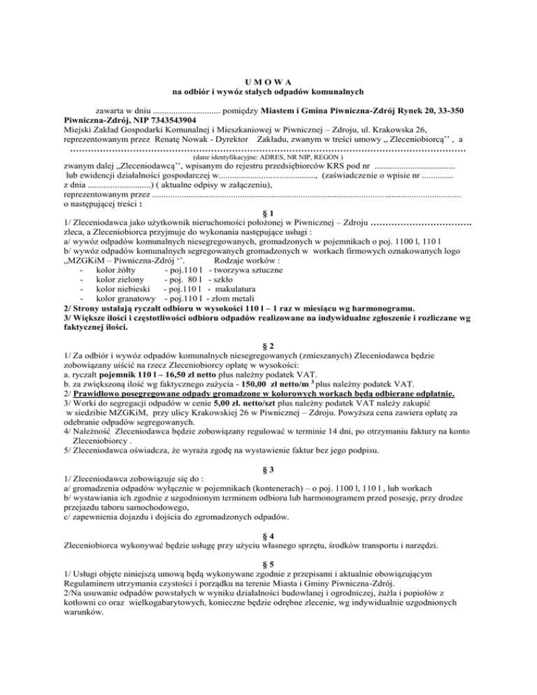 UMOWA na odbiór i wywóz stałych odpadów komunalnych zawarta w dniu .............................. pomiędzy Miastem i Gmina Piwniczna-Zdrój Rynek 20, 33-350 Piwniczna-Zdrój, NIP 7343543904 Miejski Zakład Gospodarki Komunalnej i Mieszkaniowej w Piwnicznej – Zdroju, ul. Krakowska 26, reprezentowanym przez Renatę Nowak - Dyrektor Zakładu, zwanym w treści umowy „ Zleceniobiorcą’’ , a …………………………………………………………………………………………………………………… (dane identyfikacyjne: ADRES, NR NIP, REGON ) zwanym dalej „Zleceniodawcą’’, wpisanym do rejestru przedsiębiorców KRS pod nr .................................... lub ewidencji działalności gospodarczej w..........................................., (zaświadczenie o wpisie nr .............. z dnia ............................) ( aktualne odpisy w załączeniu), reprezentowanym przez ......................................................................................................................................... o następującej treści : §1 1/ Zleceniodawca jako użytkownik nieruchomości położonej w Piwnicznej – Zdroju ……………………………. zleca, a Zleceniobiorca przyjmuje do wykonania następujące usługi : a/ wywóz odpadów komunalnych niesegregowanych, gromadzonych w pojemnikach o poj. 1100 l, 110 l b/ wywóz odpadów komunalnych segregowanych gromadzonych w workach firmowych oznakowanych logo „MZGKiM – Piwniczna-Zdrój ‘’. Rodzaje worków : kolor żółty - poj.110 l - tworzywa sztuczne - kolor zielony - poj. 80 l - szkło - kolor niebieski - poj.110 l - makulatura - kolor granatowy - poj.110 l - złom metali 2/ Strony ustalają ryczałt odbioru w wysokości 110 l – 1 raz w miesiącu wg harmonogramu. 3/ Większe ilości i częstotliwości odbioru odpadów realizowane na indywidualne zgłoszenie i rozliczane wg faktycznej ilości. §2 1/ Za odbiór i wywóz odpadów komunalnych niesegregowanych (zmieszanych) Zleceniodawca będzie zobowiązany uiścić na rzecz Zleceniobiorcy opłatę w wysokości: a. ryczałt pojemnik 110 l – 16,50 zł netto plus należny podatek VAT. b. za zwiększoną ilość wg faktycznego zużycia - 150,00 zł netto/m 3 plus należny podatek VAT. 2/ Prawidłowo posegregowane odpady gromadzone w kolorowych workach będą odbierane odpłatnie. 3/ Worki do segregacji odpadów w cenie 5,00 zł. netto/szt plus należny podatek VAT należy zakupić w siedzibie MZGKiM, przy ulicy Krakowskiej 26 w Piwnicznej – Zdroju. Powyższa cena zawiera opłatę za odebranie odpadów segregowanych. 4/ Należność Zleceniodawca będzie zobowiązany regulować w terminie 14 dni, po otrzymaniu faktury na konto Zleceniobiorcy . 5/ Zleceniodawca oświadcza, że wyraża zgodę na wystawienie faktur bez jego podpisu. §3 1/ Zleceniodawca zobowiązuje się do : a/ gromadzenia odpadów wyłącznie w pojemnikach (kontenerach) – o poj. 1100 l, 110 l , lub workach b/ wystawiania ich zgodnie z uzgodnionym terminem odbioru lub harmonogramem przed posesję, przy drodze przejazdu taboru samochodowego, c/ zapewnienia dojazdu i dojścia do zgromadzonych odpadów. §4 Zleceniobiorca wykonywać będzie usługę przy użyciu własnego sprzętu, środków transportu i narzędzi. §5 1/ Usługi objęte niniejszą umową będą wykonywane zgodnie z przepisami i aktualnie obowiązującym Regulaminem utrzymania czystości i porządku na terenie Miasta i Gminy Piwniczna-Zdrój. 2/Na usuwanie odpadów powstałych w wyniku działalności budowlanej i ogrodniczej, żużla i popiołów z kotłowni co oraz wielkogabarytowych, konieczne będzie odrębne zlecenie, wg indywidualnie uzgodnionych warunków. §6 1/ Niniejsza umowa zostaje zawarta na czas nie określony. 2/ Stronom przysługuje prawo rozwiązania umowy z trzymiesięcznym wypowiedzeniem. §7 Wszelkie zmiany treści umowy wymagają dla swej ważności formy pisemnej. §8 W sprawach nie uregulowanych niniejszą umową mają zastosowanie odpowiednie przepisy Kodeksu Cywilnego. §9 Umowa została sporządzona w dwóch jednobrzmiących egzemplarzach, po jednym dla każdej ze stron. ZLECENIODAWCA: Z L E C EN I O B I O R C A :