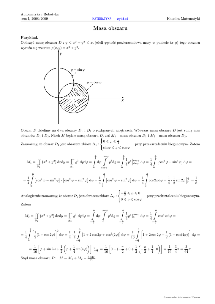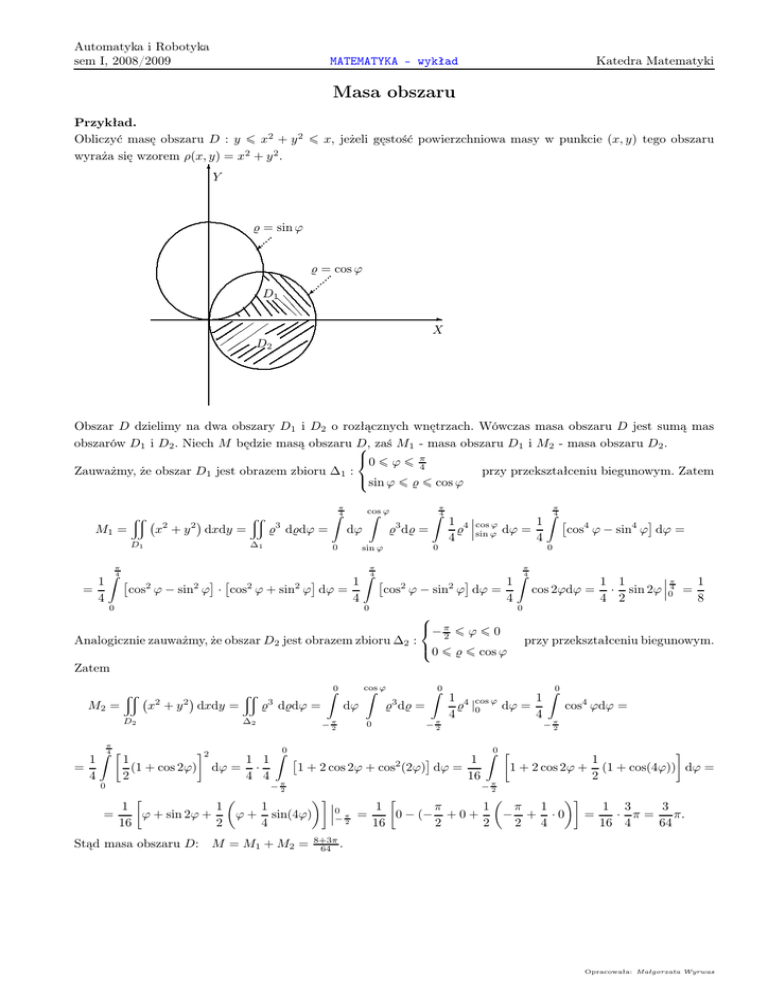 Automatyka i Robotyka sem I, 2008/2009 Katedra Matematyki MATEMATYKA - wykład Masa obszaru Przykład. Obliczyć masę obszaru D : y ¬ x2 + y 2 ¬ x, jeżeli gęstość powierzchniowa masy w punkcie (x, y) tego obszaru wyraża się wzorem ρ(x, y) = x2 + y 2 . 6 Y % = sin ϕ % = cos ϕ D1 e @ @e D2 X Obszar D dzielimy na dwa obszary D1 i D2 o rozłącznych wnętrzach. Wówczas masa obszaru D jest sumą mas obszarów D1 i D2 . Niech M będzie masą obszaru D, zaś M1 - masa obszaru D1 i M2 - masa obszaru D2 . 0 ¬ ϕ ¬ π 4 przy przekształceniu biegunowym. Zatem Zauważmy, że obszar D1 jest obrazem zbioru ∆1 : sin ϕ ¬ % ¬ cos ϕ M1 = x 2 x +y 2 D1 dxdy = x π 3 % d%dϕ = ∆1 Z4 dϕ 0 cos Z ϕ % d% = = 1 4 0 0 sin ϕ π Z4 π Z4 3 π Z4 1 4 cos ϕ 1 4 cos ϕ − sin4 ϕ dϕ = % sin ϕ dϕ = 4 4 0 π 1 cos2 ϕ − sin2 ϕ · cos2 ϕ + sin2 ϕ dϕ = 4 Z4 0 π cos2 ϕ − sin2 ϕ dϕ = 1 4 Z4 cos 2ϕdϕ = 0 − π ¬ ϕ ¬ 0 2 Analogicznie zauważmy, że obszar D2 jest obrazem zbioru ∆2 : 0 ¬ % ¬ cos ϕ π 1 1 1 · sin 2ϕ 04 = 4 2 8 przy przekształceniu biegunowym. Zatem M2 = x D2 2 x +y 2 dxdy = x 3 % d%dϕ = ∆2 π 1 = 4 Z4 1 (1 + cos 2ϕ) 2 2 1 1 dϕ = · 4 4 0 = −π 2 Z0 −π 2 1 1 ϕ + sin 2ϕ + 16 2 Z0 dϕ cos Z ϕ 3 % d% = 0 Z0 1 4 cos ϕ 1 % |0 dϕ = 4 4 −π 2 1 1 + 2 cos 2ϕ + cos (2ϕ) dϕ = 16 2 Z0 cos4 ϕdϕ = −π 2 Z0 1 1 + 2 cos 2ϕ + (1 + cos(4ϕ)) dϕ = 2 −π 2 1 1 π 1 π 1 1 3 3 0 ϕ + sin(4ϕ) − π2 = 0 − (− + 0 + − + ·0 = · π= π. 4 16 2 2 2 4 16 4 64 Stąd masa obszaru D: M = M1 + M2 = 8+3π 64 . Opracowała: Małgorzata Wyrwas