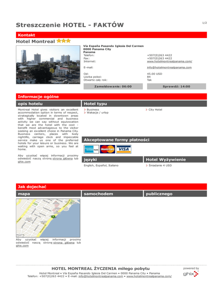 1/2 Streszczenie HOTEL - FAKTÓW Kontakt Hotel Montreal Vía España Pasando Iglesia Del Carmen 0000 Panama City Panama Telefon: Fax: Internet: +507(0)263 4422 +507(0)263 4422 www.hotelmontrealpanama.com/ E-mail: [email protected] Od: Liczba pokoi: Otwarte cały rok: 45.00 USD 84 Tak Zameldowanie: 06:00 Sprawdź: 14:00 Informacje ogólne opis hotelu Hotel typu Montreal Hotel gives visitors an excellent accommodation option in terms of respect, strategically located in downtown areas with higher commercial and business activity we can say without equivocation that we are the hotel with the cost benefit most advantageous to the visitor seeking an excellent choice in Panama City. Business centers, places with lively nightlife, carriage clock and impeccable service make us one of the preferred hotels for your leisure or business. We are waiting with open arms, so you feel at home. Aby uzyskać więcej informacji prosimy odwiedzić naszą stronę strona główna lub ghix.com Business Wakacje / urlop City Hotel Akceptowane formy płatności języki English, Español, Italiano Hotel Wyżywienie Śniadanie 4 USD Jak dojechać mapa samochodem publicznego Aby uzyskać więcej informacji prosimy odwiedzić naszą stronę strona główna lub ghix.com HOTEL MONTREAL ŻYCZENIA miłego pobytu Hotel Montreal • Vía España Pasando Iglesia Del Carmen • 0000 Panama City • Panama Telefon: +507(0)263 4422 • E-mail: [email protected] • www.hotelmontrealpanama.com/ 2/2 Hotel Montreal Usługi Usługi Hotelowe Bar Garaż Internet w telewizji Parking Recepcja 24 h sejf Zapisz Windy Wyposażenie Pokoju Express check out Internet w Lobby Kawiarnia / Kawiarnia Pralnia Restauracja W Dial Direct 24 h serwis Fax Klimatyzacja Telewizja / satelitarna Telewizor WiFi Telewizja Dostęp do internetu Internet ADSL Telefon Telewizja kablowa satelitarna WC / prysznic na parterze Odległości i udogodnienia Lokalizacja hotelu autostrady Beach Casino centrum miasta, 0.1 km lotnisko, 10 km, TOCUMEN INT lotnisko 2, 2 km, ALBROOK obiektów o znaczeniu, 1 km port Stare Miasto, 2 km Szpital, 1 km transportu publicznego Zaplecze rekreacyjne Beach, 20 km Beauty Center Biblioteka, 1 km Bilard, 2 km Boisko Bowling, 3 km Casino, 0.5 km Golf, 5 km GymFitness, 1 km Health Club, 1 km Kort tenisowy kryty, 3 km Kort tenisowy odkryty Łowienie ryb, 1 km Masaż, 1 km Plac zabaw dla dzieci, 1 km Pool Sklepy, 0.5 km Spa, 0.5 km Wypożyczalnia samochodów, 0.5 km Żeglarstwo, 1 km Komentarze Aby uzyskać więcej informacji prosimy odwiedzić naszą stronę strona główna lub ghix.com HOTEL MONTREAL ŻYCZENIA miłego pobytu Hotel Montreal • Vía España Pasando Iglesia Del Carmen • 0000 Panama City • Panama Telefon: +507(0)263 4422 • E-mail: [email protected] • www.hotelmontrealpanama.com/ /