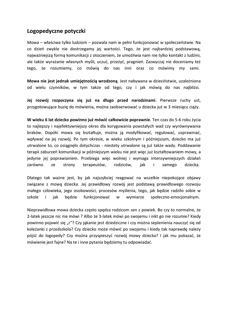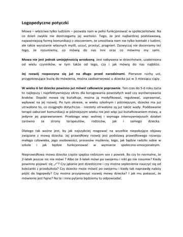 Logopedyczne potyczki Mowa – właściwa tylko ludziom – pozwala nam w pełni funkcjonować w społeczeństwie. Na co dzień zwykle nie dostrzegamy jej wartości. Tego, że jest najbardziej podstawową, najważniejszą formą komunikacji z otoczeniem, że umożliwia nam nie tylko kontakt z ludźmi, ale także wyrażanie własnych myśli, uczuć, przeżyć, pragnień. Zazwyczaj nie doceniamy też tego, że rozumiemy, co mówią do nas inni oraz co mówimy my sami. Mowa nie jest jednak umiejętnością wrodzoną. Jest nabywana w dzieciństwie, uzależniona od wielu czynników, w tym także od tego, czy i jak mówią do nas najbliżsi. Jej rozwój rozpoczyna się już na długo przed narodzinami. Pierwsze ruchy ust, przygotowujące buzię do mówienia, można zaobserwować u dziecka już w 3 miesiącu ciąży. W wieku 6 lat dziecko powinno już mówić całkowicie poprawnie. Ten czas do 5-6 roku życia to najlepszy i najefektywniejszy okres dla korygowania powstałych wad czy wyrównywania braków. Dopóki mowa się kształtuje, można ją modyfikować, regulować, usprawniać, wpływać na jej rozwój. Po tym okresie, w wieku szkolnym i późniejszym, dziecko ma już utrwalone to, co osiągnęło dotychczas - niestety utrwalone są już także wady. Poddawanie terapii zaburzeń komunikacji w późniejszym wieku nie jest więc już kształtowaniem mowy, a jedynie jej poprawianiem. Przebiega więc wolniej i wymaga intensywniejszych działań zarówno ze strony terapeutów, rodziców, jak i samego dziecka. Dlatego tak ważne jest, by jak najszybciej reagować na wszelkie niepokojące objawy związane z mową dziecka. Jej prawidłowy rozwój jest podstawą prawidłowego rozwoju małego człowieka, jego osobowości, procesów myślenia, tego, jak będzie radziło sobie w szkole i jak będzie funkcjonować w wymiarze społeczno-emocjonalnym. Nieprawidłowa mowa dziecka często spędza rodzicom sen z powiek. Bo czy to normalne, że 2-latek jeszcze nic nie mówi ? Albo że 3-latek mówi po swojemu i nikt go nie rozumie? Kiedy powinno pojawić się „r”? Czy jąkanie jest dziedziczne i czy można seplenienia nauczyć się od koleżanki z przedszkola? Czy dziecko może mówić po swojemu i kiedy tak naprawdę należy pójść do logopedy? Czy można przyspieszyć rozwój mowy dziecka? I jak mu pokazać, że mówienie jest fajne? Na te i inne pytania będziemy tu odpowiadać. Kiedy do logopedy Z TWOJĄ POMOCĄ DZIECKO DA SOBIE RADĘ. Koniecznie udaj się z dzieckiem do logopedy, gdy dziecko: nie gaworzy, roczne nie wypowiada sylab, podejrzewamy, że nie rozumie naszych poleceń, 2-latek nie wypowiada prostych słów (mama, baba, tata, dada...), 3-latek nie buduje zdań, 4-latek formułuje jedynie zdania proste, równoważniki zdań, wypowiada zaledwie proste słowa, zniekształca wyrazy, znacznie odstaje w rozwoju mowy od rówieśników, izoluje się, niechętnie bawi się z dziećmi, jest odrzucane przez grupę z powodu gorzej rozwijającej się mowy, w wieku 4 lat nadal mówi niepłynnie, zacina sie, powtarza sylaby, nie może "wydusić z siebie słowa", nawykowo oddycha buzią, podczas mówienia wsuwa język między przednie zęby, 4-latek nie wypowiada głosek k, g, l, ś, ź, ć, dź lub s, z, c, dz, 5-latek nie wypowiada l (np. nadal zastępuje przez j) albo nie wypowiada r, s, z, c, dz, ś, ź, ć, dź, k, g, ą, ę, 6-latek nie wypowiada sz, ż, cz, dż, gdy mamy wątpliwości, czy dziecko słyszy. Ponadto, jeśli już u bardzo małego dziecka zaobserwujemy wolniejszy rozwój takich umiejętności jak siadanie, raczkowanie, gaworzenie, wymawianie pierwszych sylab, słów, to warto już wtedy zgłosić się do logopedy, by ocenił funkcjonowanie narządów mowy, poziom rozwoju narządów artykulacyjnych i ewentualnie zalecił odpowiednie ćwiczenia, które usprawnią narządy mowy i przyspieszą dojrzewanie tych części układu nerwowego, które odpowiadają za rozwój mowy. Może się bowiem okazać, choć oczywiście nie musi, że opóźnienie rozwoju ruchowego dziecka zapowiada opóźniony rozwój mowy. Rozwój mowy dziecka Z TWOJĄ POMOCĄ DZIECKO DA SOBIE RADĘ. Już noworodek komunikuje się z otoczeniem i choć czyni to w sposób bezsłowny, to potrafi bardzo wiele przekazać za pomocą krzyku lub płaczu. Są one jedyną formą komunikacji noworodka do ok. 6-8 tygodnia życia. Różniące się wysokością, natężeniem, barwą, mogą wyrażać głód, ból, zmęczenie, potrzebę bliskości. Wyczulona mama często potrafi rozpoznać, czy płacz jej dziecka oznacza, że jest głodne, czy, że coś je boli, czy po prostu potrzebuje uwagi. Głużenie, które pojawia się ok. 2 miesiąca życia, jest procesem nieuświadomionym, nie podlega kontroli słuchowej, toteż głużą także dzieci niesłyszące. Głużenie to ciągi spółgłosek, samogłosek, czasem sylab, które są ćwiczeniem mięśni oddechowych, głosowych i mięśni buzi odpowiedzialnych za tworzenie słów. Gaworzenie jest już procesem świadomym i podlegającym kontroli słuchowej. Zaczyna się ok. 7-8 miesiąca życia i stanowi pierwszy poważniejszy sprawdzian słuchu dziecka. Dzieci niesłyszące nie gaworzą. Na tym właśnie etapie dziecko zaczyna powtarzać dźwięki słyszane w otoczeniu. Dziecko nabiera też przekonania, że dźwięk, który wydaje, coś oznacza i czemuś służy, toteż często wykorzystuje gaworzenie w celu zwrócenia na siebie uwagi. Coraz częściej rozumie ono także proste wypowiedzi, choć nadal podstawą tego rozumienia jest intonacja, akcent, melodia głosu, kontekst sytuacyjny (E. Słodownik-Rycaj). Pod koniec pierwszego roku dziecko może powtarzać już nie tylko pojedyncze sylaby czy ich kombinacje, ale nawet całe wyrazy. Z chwilą, gdy wyrazom tym dziecko zaczyna przypisywać określone znaczenie, gaworzenie przechodzi w etap wyrazu. Etap wyrazu rozpoczyna słowną komunikację dziecka z otoczeniem i trwa mniej więcej do końca drugiego roku życia. Na tym etapie następuje