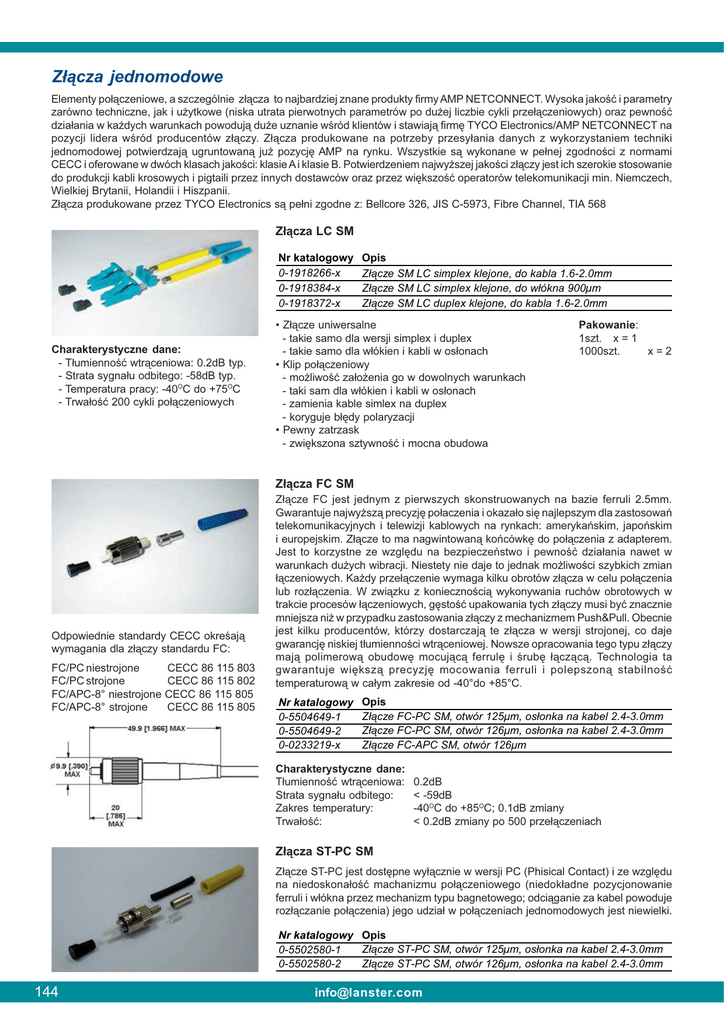Z³¹cza jednomodowe Elementy po³¹czeniowe, a szczególnie z³¹cza to najbardziej znane produkty firmy AMP NETCONNECT. Wysoka jakoœæ i parametry zarówno techniczne, jak i u¿ytkowe (niska utrata pierwotnych parametrów po du¿ej liczbie cykli prze³¹czeniowych) oraz pewnoœæ dzia³ania w ka¿dych warunkach powoduj¹ du¿e uznanie wœród klientów i stawiaj¹ firmê TYCO Electronics/AMP NETCONNECT na pozycji lidera wœród producentów z³¹czy. Z³¹cza produkowane na potrzeby przesy³ania danych z wykorzystaniem techniki jednomodowej potwierdzaj¹ ugruntowan¹ ju¿ pozycjê AMP na rynku. Wszystkie s¹ wykonane w pe³nej zgodnoœci z normami CECC i oferowane w dwóch klasach jakoœci: klasie A i klasie B. Potwierdzeniem najwy¿szej jakoœci z³¹czy jest ich szerokie stosowanie do produkcji kabli krosowych i pigtaili przez innych dostawców oraz przez wiêkszoœæ operatorów telekomunikacji min. Niemczech, Wielkiej Brytanii, Holandii i Hiszpanii. Z³¹cza produkowane przez TYCO Electronics s¹ pe³ni zgodne z: Bellcore 326, JIS C-5973, Fibre Channel, TIA 568 Z³¹cza LC SM Nr katalogowy 0-1918266-x 0-1918384-x 0-1918372-x Charakterystyczne dane: - T³umiennoœæ wtr¹ceniowa: 0.2dB typ. - Strata sygna³u odbitego: -58dB typ. - Temperatura pracy: -40OC do +75OC - Trwa³oœæ 200 cykli po³¹czeniowych Opis Złącze SM LC simplex klejone, do kabla 1.6-2.0mm Złącze SM LC simplex klejone, do włókna 900µm Złącze SM LC duplex klejone, do kabla 1.6-2.0mm • Z³¹cze uniwersalne - takie samo dla wersji simplex i duplex - takie samo dla w³ókien i kabli w os³onach • Klip po³¹czeniowy - mo¿liwoœæ za³o¿enia go w dowolnych warunkach - taki sam dla w³ókien i kabli w os³onach - zamienia kable simlex na duplex - koryguje b³êdy polaryzacji • Pewny zatrzask - zwiêkszona sztywnoœæ i mocna obudowa Pakowanie: 1szt. x = 1 1000szt. x=2 Z³¹cza FC SM Odpowiednie standardy CECC okreœaj¹ wymagania dla z³¹czy standardu FC: FC/PC niestrojone FC/PC strojone FC/APC-8° niestrojone FC/APC-8° strojone CECC 86 115 803 CECC 86 115 802 CECC 86 115 805 CECC 86 115 805 Z³¹cze FC jest jednym z pierwszych skonstruowanych na bazie ferruli 2.5mm. Gwarantuje najwy¿sz¹ precyzjê po³aczenia i okaza³o siê najlepszym dla zastosowañ telekomunikacyjnych i telewizji kablowych na rynkach: amerykañskim, japoñskim i europejskim. Z³¹cze to ma nagwintowan¹ koñcówkê do po³¹czenia z adapterem. Jest to korzystne ze wzglêdu na bezpieczeñstwo i pewnoœæ dzia³ania nawet w warunkach du¿ych wibracji. Niestety nie daje to jednak mo¿liwoœci szybkich zmian ³¹czeniowych. Ka¿dy prze³¹czenie wymaga kilku obrotów z³¹cza w celu po³¹czenia lub roz³¹czenia. W zwi¹zku z koniecznoœci¹ wykonywania ruchów obrotowych w trakcie procesów ³¹czeniowych, gêstoœæ upakowania tych z³¹czy musi byæ znacznie mniejsza ni¿ w przypadku zastosowania z³¹czy z mechanizmem Push&Pull. Obecnie jest kilku producentów, którzy dostarczaj¹ te z³¹cza w wersji strojonej, co daje gwarancjê niskiej t³umiennoœci wtr¹ceniowej. Nowsze opracowania tego typu z³¹czy maj¹ polimerow¹ obudowê mocuj¹c¹ ferrulê i œrubê ³¹cz¹c¹. Technologia ta gwarantuje wiêksz¹ precyzjê mocowania ferruli i polepszon¹ stabilnoœæ temperaturow¹ w ca³ym zakresie od -40°do +85°C. Nr katalogowy 0-5504649-1 0-5504649-2 0-0233219-x Opis Złącze FC-PC SM, otwór 125µm, osłonka na kabel 2.4-3.0mm Złącze FC-PC SM, otwór 126µm, osłonka na kabel 2.4-3.0mm Złącze FC-APC SM, otwór 126µm Charakterystyczne dane: T³umiennoœæ wtr¹ceniowa: Strata sygna³u odbitego: Zakres temperatury: Trwa³oœæ: 0.2dB < -59dB -40OC do +85OC; 0.1dB zmiany < 0.2dB zmiany po 500 prze³¹czeniach Z³¹cza ST-PC SM Z³¹cze ST-PC jest dostêpne wy³¹cznie w wersji PC (Phisical Contact) i ze wzglêdu na niedoskona³oœæ machanizmu po³¹czeniowego (niedok³adne pozycjonowanie ferruli i w³ókna przez mechanizm typu bagnetowego; odci¹ganie za kabel powoduje roz³¹czanie po³¹czenia) jego udzia³ w po³¹czeniach jednomodowych jest niewielki. Nr katalogowy Opis Złącze ST-PC SM, otwór 125µm, osłonka na kabel 2.4-3.0mm 0-5502580-1 Złącze ST-PC SM, otwór 126µm, osłonka na kabel 2.4-3.0mm 0-5502580-2 144 [email protected]