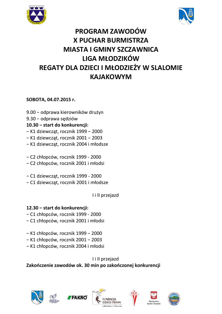 PROGRAM ZAWODÓW X PUCHAR BURMISTRZA MIASTA I GMINY SZCZAWNICA LIGA MŁODZIKÓW REGATY DLA DZIECI I MŁODZIEŻY W SLALOMIE KAJAKOWYM SOBOTA, 04.07.2015 r. 9.00 − odprawa kierowników drużyn 9.30 − odprawa sędziów 10.30 − start do konkurencji: − K1 dziewcząt, rocznik 1999 − 2000 − K1 dziewcząt, rocznik 2001 − 2003 − K1 dziewcząt, rocznik 2004 i młodsze − C2 chłopców, rocznik 1999 - 2000 − C2 chłopców, rocznik 2001 i młodsi − C1 dziewcząt, rocznik 1999 - 2000 − C1 dziewcząt, rocznik 2001 i młodsze I i II przejazd 12.30 − start do konkurencji: − C1 chłopców, rocznik 1999 - 2000 − C1 chłopców, rocznik 2001 i młodsi − K1 chłopców, rocznik 1999 − 2000 − K1 chłopców, rocznik 2001 − 2003 − K1 chłopców, rocznik 2004 i młodsi I i II przejazd Zakończenie zawodów ok. 30 min po zakończonej konkurencji X PUCHAR BURMISTRZA MIASTA I GMINY SZCZAWNICA LIGA MŁODZIKÓW II RZUT REGATY DLA DZIECI I MŁODZIEŻY W SLALOMIE KAJAKOWYM SZCZAWNICA 04.07.2015 1. Organizator: - KS „Pieniny” Szczawnica; Miasto i Gmina Szczawnica 2. Miejsce i termin: - 04 lipca 2015 r. - rzeka Dunajec obok przystani kajakowej KS „Pieniny” Szczawnica. - pierwsza odprawa kierowników drużyn odbędzie się 04.07.2015 r. o godz. 9.00 w biurze Klubu , ul. Pienińska 13, Szczawnica - odprawa komisji sędziowskiej odbędzie się 04.07.2015 r. o godz. 9.30 w biurze Klubu , ul. Pienińska 13, Szczawnica 3. Konkurencje i sprzęt: - zawodnicy startują na dowolnych kajakach, mogą wystartować w dwóch konkurencjach, osobno chłopcy, osobno dziewczęta, w następujących grupach wiekowych: - K1 dziewcząt, rocznik 1999-2000; - K1 dziewcząt, rocznik 2001-2003; - K1 dziewcząt, rocznik 2004 i młodsze; - C1 dziewcząt, rocznik 1999 - 2000 - C1 dziewcząt, rocznik 2001 i młodsze; - K1 chłopców, rocznik 1999-2000; - K1 chłopców, rocznik 2001-2003; - K1 chłopców, rocznik 2003 i młodsi; - C1 chłopców, rocznik 1999-2000; - C1 chłopców, rocznik 2001 i młodsi; - C2 chłopców, rocznik 1999-2000; - C2 chłopców, rocznik 2001 i młodsi; W przypadku złej aury lub dużej ilości zgłoszonych osad, organizator zastrzega możliwość rozegrania jednego przejazdu o czym powiadomi na I odprawie kierowników drużyn 4. Nagrody: − Pamiątkowe statuetki, puchary medale, nagrody rzeczowe - Szczegółowy wykaz nagród przedstawi organizator na pierwszej odprawie kierowników 5. Zgłoszenia: − zgłoszenia do 01.07.2015 r. do godz. 17.00 kierować na adres Klub Sportowy "Pieniny", ul. Pienińska 13, 34-460 Szczawnica, e-mail: [email protected] , zgodnie ze wzorem przewidzianym przez regulamin PZKaj 5. Losowanie: − losowanie odbędzie się w siedzibie Klubu 02.07.2015 r. o godz. 18.00 6. Dokumentacja zawodników - dokumentacja zawodników biorących udział w zawodach wraz z listą zbiorczą winna zostać dostarczona Sędziemu Głównemu, najpóźniej na pierwszej odprawie z Kierownikami Drużyn 7. Opłaty: − opłata za zgłoszoną osadę wynosi 15,-zł i będzie wyegzekwowana przez organizatora pod rygorem skreślenia z listy startowej.