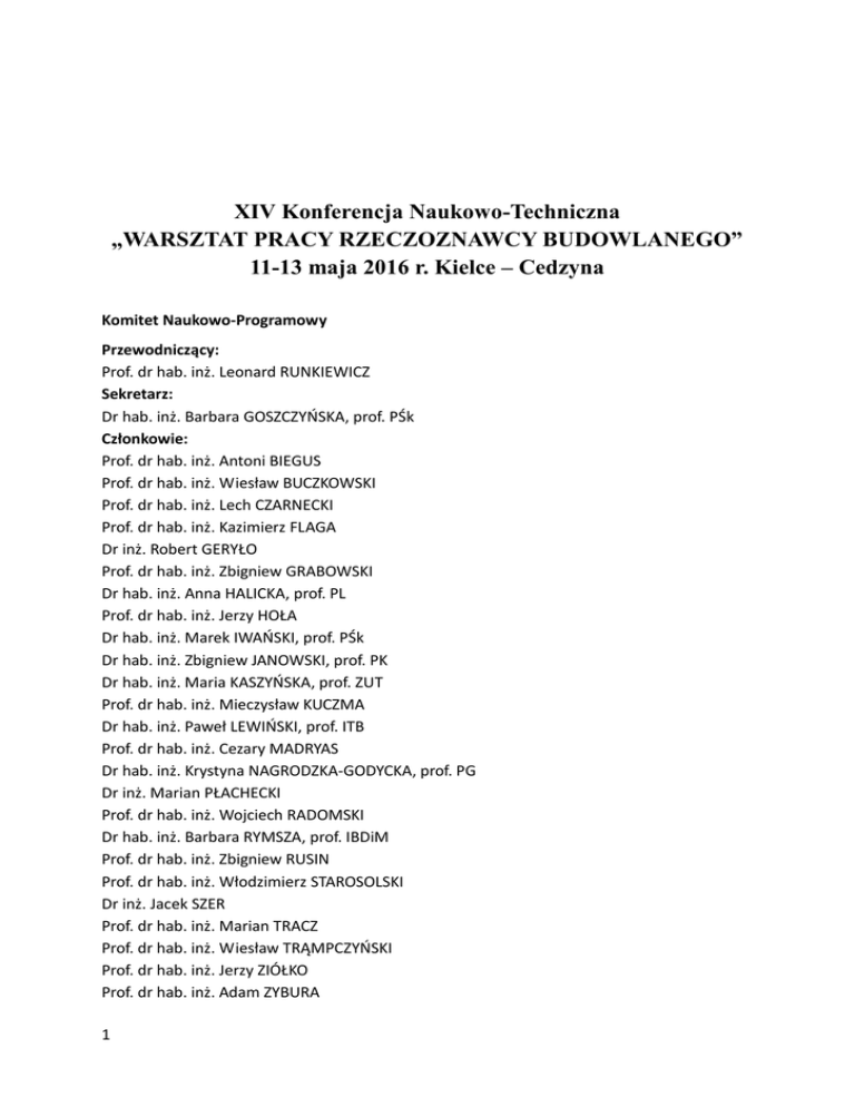 XIV Konferencja Naukowo-Techniczna „WARSZTAT PRACY RZECZOZNAWCY BUDOWLANEGO” 11-13 maja 2016 r. Kielce – Cedzyna Komitet Naukowo-Programowy Przewodniczący: Prof. dr hab. inż. Leonard RUNKIEWICZ Sekretarz: Dr hab. inż. Barbara GOSZCZYŃSKA, prof. PŚk Członkowie: Prof. dr hab. inż. Antoni BIEGUS Prof. dr hab. inż. Wiesław BUCZKOWSKI Prof. dr hab. inż. Lech CZARNECKI Prof. dr hab. inż. Kazimierz FLAGA Dr inż. Robert GERYŁO Prof. dr hab. inż. Zbigniew GRABOWSKI Dr hab. inż. Anna HALICKA, prof. PL Prof. dr hab. inż. Jerzy HOŁA Dr hab. inż. Marek IWAŃSKI, prof. PŚk Dr hab. inż. Zbigniew JANOWSKI, prof. PK Dr hab. inż. Maria KASZYŃSKA, prof. ZUT Prof. dr hab. inż. Mieczysław KUCZMA Dr hab. inż. Paweł LEWIŃSKI, prof. ITB Prof. dr hab. inż. Cezary MADRYAS Dr hab. inż. Krystyna NAGRODZKA-GODYCKA, prof. PG Dr inż. Marian PŁACHECKI Prof. dr hab. inż. Wojciech RADOMSKI Dr hab. inż. Barbara RYMSZA, prof. IBDiM Prof. dr hab. inż. Zbigniew RUSIN Prof. dr hab. inż. Włodzimierz STAROSOLSKI Dr inż. Jacek SZER Prof. dr hab. inż. Marian TRACZ Prof. dr hab. inż. Wiesław TRĄMPCZYŃSKI Prof. dr hab. inż. Jerzy ZIÓŁKO Prof. dr hab. inż. Adam ZYBURA 1 Komitet Organizacyjny Przewodniczący: Prof. dr hab. inż. Wiesław TRĄMPCZYŃSKI Zastępcy Przewodniczącego: Dr hab. inż. Barbara GOSZCZYŃSKA, prof. PŚk Mgr inż. Wiktor PIWKOWSKI Członkowie: Mgr inż. Tadeusz DURAK Dr inż. Stefan SZAŁKOWSKI Dr hab. inż. Grzegorz ŚWIT, prof. PŚk Sekretarz organizacyjny: Mgr Anna PETRASZEK Zagadnienia rzeczoznawstwa budowlanego tj. diagnostyki i oceny stanu technicznego obiektów mają niezmiennie duże znaczenie w gospodarce narodowej. Dlatego też wskazane jest żeby przedstawiać i pobudzać rozwój prac naukowo-badawczych i wdrożeniowych wielu ośrodków naukowych, a także ośrodków gospodarczych, rozwiązujących oraz podejmujących decyzje inwestycyjne. Jedną z form rozwiązywania tych problemów są organizowane konferencje oraz sympozja naukowo-techniczne, a także liczne seminaria i warsztaty specjalistyczne. W dniach 11-13 maja 2016 odbyła się w Cedzynie koło Kielc, XIV Konferencja Naukowo - Techniczna „Warsztat Pracy Rzeczoznawcy Budowlanego” organizowana przez PZITB Odział Kielce oraz Wydział Budownictwa i Architektury Politechniki Świętokrzyskiej (przewodniczący Komitetu Organizacyjnego – prof. Wiesław Trąmpczyński, Z-cy Przewodniczącego Komitetu Organizacyjnego - dr hab. inż.Barbara Goszczyńska, Prof. PŚk oraz mgr. inż. Wiktor Piwkowski) pod patronatem Świętokrzyskiego Urzędu Wojewódzkiego, Urzędu Marszałkowskiego Województwa Świętokrzyskiego, Głównego Urzędu Nadzoru Budowlanego, Instytutu Techniki Budowlanej, Polskiej Izby Inżynierów Budownictwa, Zarządu Głównego Polskiego Związku Inżynierów i Techników Budownictwa, Politechniki Świętokrzyskiej, Małopolskiej Okręgowej Izby Inżynierów Budownictwa, Mazowieckiej Okręgowej Izby Inżynierów Budownictwa, Śląskiej Okręgowej Izby Inżynierów Budownictwa i Świętokrzyskiej Okręgowej Izby Inżynierów Budownictwa. Poziom merytoryczny konferencji zapewniony był przez Komitet Naukowo-Programowy, którego Przewodniczącym był po raz czternasty Profesor Leonard Runkiewicz. Celem konferencji (organizowanej nieprzerwanie od 1985 roku) było doskonalenie Rzeczoznawców Budowlanych oraz pogłębianie wiedzy kandydatów na Rzeczoznawców w formie przekazywania i wymiany informacji, wiedzy i doświadczeń z zakresu szeroko rozumianego rzeczoznawstwa budowlanego. Wzięło w niej udział ponad 240 uczestników z Wyższych Uczelni, Ośrodków Naukowo-Badawczych, firm projektowych, oddziałów Polskiej Izby Inżynierów Budownictwa, PZITB, firm wykonawczych oraz rzeczoznawców działających w firmach specjalistycznych, a także w wybranych sesjach uczestniczyli studenci i doktoranci Wydziału Budownictwa i Architektury Politechniki Świętokrzyskiej (razem 20 osób) 2 Patronat medialny zapewniły takie uznane czasopisma jak: Inżynier Budownictwa, Inżynieria i Budownictwo, Przegląd Budowlany, budownictwo inzynieryjne.pl, Builder, Biuletyn Świętokrzyski, Materiały Budowlane, Mosty oraz Nowoczesne Budownictwo Inżynieryjne. Sponsorem głównym konferencji była firma PERI. Pozostali sponsorzy to: Dlubal Software, Katowice; Forbuild S.A. Końskie; Fundacja im. Staszica, Kielce; Gemiprem Technologie S.A., Hilti Poland Sp. z o.o., Instytut Techniki Budowlanej, Lenso Sp. z o.o., Małopolska Okręgowa Izba Inżynierów Budownictwa; Mazowiecka Okręgowa Izba Inżynierów Budownictwa; MC-Bauchemie Sp. z o.o., Projekt Grzegorz Piankowski, Tczew;Przedsiębiorstwo Produkcji Betonów SIBET S.A., Kielce; Przedsiębiorstwo Robót Inżynieryjnych FART S.A., Kielce; Politechnika Świętokrzyska, SIKA Poland Sp. z o.o., Sopockie Towarzystwo Ubezpieczeniowe Ergo-Hestia S.A. Śląska Okręgowa Izba Inżynierów Budownictwa; Urząd Marszałkowski Województwa Świętokrzyskiego w Kielcach. Rzeczoznawstwo jest jedną z najbardziej odpowiedzialnych form działalności, w hierarchii samodzielnych funkcji technicznych w budownictwie. Rzeczoznawcy powoływani są do opiniowania trudnych problemów technicznych w projektowaniu, wykonawstwie i użytkowaniu obiektów budowlanych i inżynierskich, a także biorą udział w ocenie przyczyn i skutków katastrof i awarii, w tym spowodowanych „siłami natury”. Ocena obiektów budowlanych i inżynierskich wymaga rozwiązywania coraz szerszego zakresu problemów związanych z zastosowaniem nowoczesnych metod badawczych i ich interpretacją, monitoringiem i diagnostyką, a także nowymi metodami wzmocnień konstrukcji, co skutkuje koniecznością kształcenia ustawicznego. Dlatego też, Konferencja „Warsztat Pracy Rzeczoznawstwa Budowlanego” miała charakter szkoleniowy i przewidziana była w formie warsztatów umożliwiających przekazanie i wymianę informacji, wiedzy i doświadczeń z zakresu szeroko rozumianego rzeczoznawstwa budowlanego