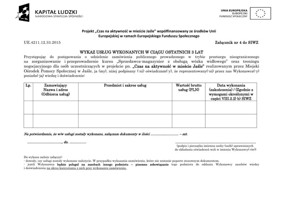 Projekt „Czas na aktywność w mieście Jaśle” współfinansowany ze środków Unii Europejskiej w ramach Europejskiego Funduszu Społecznego UE.4211.12.33.2015 Załącznik nr 4 do SIWZ WYKAZ USŁUG WYKONANYCH W CIĄGU OSTATNICH 3 LAT Przystępując do postępowania o udzielenie zamówienia publicznego prowadzonego w trybie przetargu nieograniczonego na zorganizowanie i przeprowadzenie kursu „Sprzedawca-magazynier z obsługą wózka widłowego” oraz treningu negocjacyjnego dla osób uczestniczących w projekcie pn. „Czas na aktywność w mieście Jaśle” realizowanym przez Miejski Ośrodek Pomocy Społecznej w Jaśle, ja (my), niżej podpisany (-ni) oświadczam(-y), że reprezentowany(-ni) przez nas Wykonawca(-y) posiada(-ją) wiedzę i doświadczenie: Lp. Zamawiający Nazwa i adres (Odbiorca usług) Przedmiot i zakres usług Wartość brutto usług (PLN) Data wykonania (zakończenia) / (Zgodnie z wymogami określonymi w części VIII.2.2) b) SIWZ Na potwierdzenie, że w/w usługi zostały wykonane, załączam dokumenty w ilości ……………………. – szt. …………………………., dn. …………… ...................................................................................... (podpis i pieczątka imienna osoby (osób) uprawnionych do składania oświadczeń woli w imieniu Wykonawcy(-ów)) Do wykazu należy załączyć: - dowody, czy usługi zostały wykonane należycie. W przypadku wykazania zamówienia, które nie zostanie poparte stosownym dokumentem. - jeżeli Wykonawca będzie polegał na zasobach innego podmiotu – pisemne zobowiązanie tego podmiotu do oddania Wykonawcy zasobów wiedzy i doświadczenia na okres korzystania z nich przy wykonaniu zamówienia.