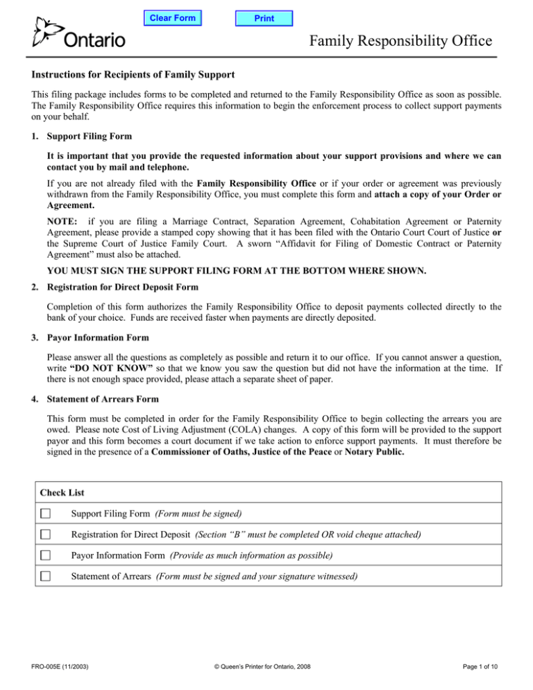 Clear Form Print Family Responsibility Office Instructions for Recipients of Family Support This filing package includes forms to be completed and returned to the Family Responsibility Office as soon as possible. The Family Responsibility Office requires this information to begin the enforcement process to collect support payments on your behalf. 1. Support Filing Form It is important that you provide the requested information about your support provisions and where we can contact you by mail and telephone. If you are not already filed with the Family Responsibility Office or if your order or agreement was previously withdrawn from the Family Responsibility Office, you must complete this form and attach a copy of your Order or Agreement. NOTE: if you are filing a Marriage Contract, Separation Agreement, Cohabitation Agreement or Paternity Agreement, please provide a stamped copy showing that it has been filed with the Ontario Court Court of Justice or the Supreme Court of Justice Family Court. A sworn “Affidavit for Filing of Domestic Contract or Paternity Agreement” must also be attached. YOU MUST SIGN THE SUPPORT FILING FORM AT THE BOTTOM WHERE SHOWN. 2. Registration for Direct Deposit Form Completion of this form authorizes the Family Responsibility Office to deposit payments collected directly to the bank of your choice. Funds are received faster when payments are directly deposited. 3. Payor Information Form Please answer all the questions as completely as possible and return it to our office. If you cannot answer a question, write “DO NOT KNOW” so that we know you saw the question but did not have the information at the time. If there is not enough space provided, please attach a separate sheet of paper. 4. Statement of Arrears Form This form must be completed in order for the Family Responsibility Office to begin collecting the arrears you are owed. Please note Cost of Living Adjustment (COLA) changes. A copy of this form will be provided to the support payor and this form becomes a court document if we take action to enforce support payments. It must therefore be signed in the presence of a Commissioner of Oaths, Justice of the Peace or Notary Public. Check List Support Filing Form (Form must be signed) Registration for Direct Deposit (Section “B” must be completed OR void cheque attached) Payor Information Form (Provide as much information as possible) Statement of Arrears (Form must be signed and your signature witnessed) FRO-005E (11/2003) © Queen’s Printer for Ontario, 2008 Page 1 of 10 Ministry of Community and Social Services Support Filing Form Family Responsibility Office P.O. Box 220 Downsview ON M3M 3A3 Case Number Language Preferred: English Last Name French First Name Address: Street Number and Name / Apartment Number City / Town Middle Initial Lot, Concession or Township Province Postal Code Home Telephone Number Date of Birth: Social Insurance Number Area code ( Day / Month / Year ______ / ________ / _______ ___________ - ___________ - ___________ ) _________________ Employer: Work Telephone Number Area code ( ) _________________ Last Name of Person Owing Support First Name Middle Initial My Support Provisions are contained in a (check one) Court Order Separation Agreement Cohabitation Agreement Paternity Agreement Marriage Contract Date ________ / ________ / ________ Day Month Year (Agreement / Contract must be filed with the Ontario Court of Justice or Superior Court of Justice Family Court) Are you claiming spousal support for yourself? Yes No Are you claiming support for the child(ren) named in the order / agreement? Yes No If yes, list the name(s) of the child(ren) you are claiming support for (use additional sheet if required) Last Name, First Name, Initial(s) Do you currently receive or have you applied for Date of Birth Day / Month / Year Family Benefits Sex Male Female Male Female Male Female Male Female General Welfare No Do you have another case filed with the Family Responsibility Office? If yes, please provide the name that the case is filed under and the case number. Name case is filed under Case Number You must sign this form in order for the Family Responsibility Office to enforce the support terms of your order/ agreement / contract. Signature FRO-005E (11/2003) Date Page 2 of 10 Ministry of Community and Social Services Registration for Direct Deposit Family Responsibility Office P.O. Box 220 Downsview ON M3M 3A3 Case Number When the Family Responsibility Office receives a support payment that is owed to you, these funds will be sent by DIRECT DEPOSIT to the bank of your choice. To ensure that you receive your money quickly, the following information must be provided. Incorrect information could result in your payment being sent to the wrong account. Instructions If you wish to have your support payments deposited into your CHEQUING ACCOUNT, COMPLETE SECTION ‘A’ and ATTACH A BLANK PERSONAL CHEQUE with ‘VOID’ written on it. If, however, you wish to designate your SAVINGS ACCOUNT, complete SECTION “A”, take this form to your bank and ask them to complete SECTION “B” – Banking Data. DO NOT FORGET TO SIGN THE BOTTOM OF THE FORM AUTHORIZING THE DIRECT DEPOSIT SERVICE Important notes about changing bank accounts If your account number changed, or if you wish to have your support payments deposited to a different account, you must complete a new DIRECT DEPOSIT FORM and return it to the Family Responsibility Office. After the changes have been processed, your support payments will be sent to your new account. DO NOT CLOSE YOUR OLD ACCOUNT UNTIL YOU RECEIVE YOUR FIRST PAYMENT TO THE NEW ACCOUNT. SECTION “A” – Support Recipient Information Last Name PLEASE PRINT CLEARLY First Name Address: Street Number and Name / Apartment Number City / Town Middle Initial Lot, Concession or Township Province Postal Code Telephone number where you can be reached during the day Area Code ( ) NOTE: If attaching a VOID cheque, please tape